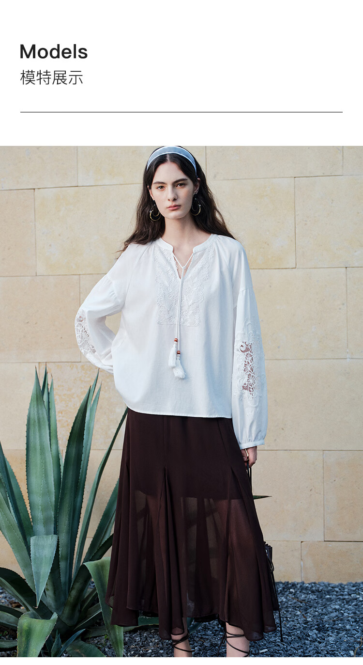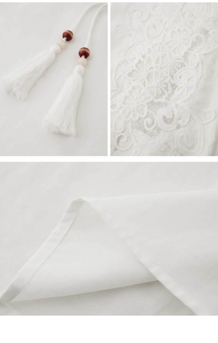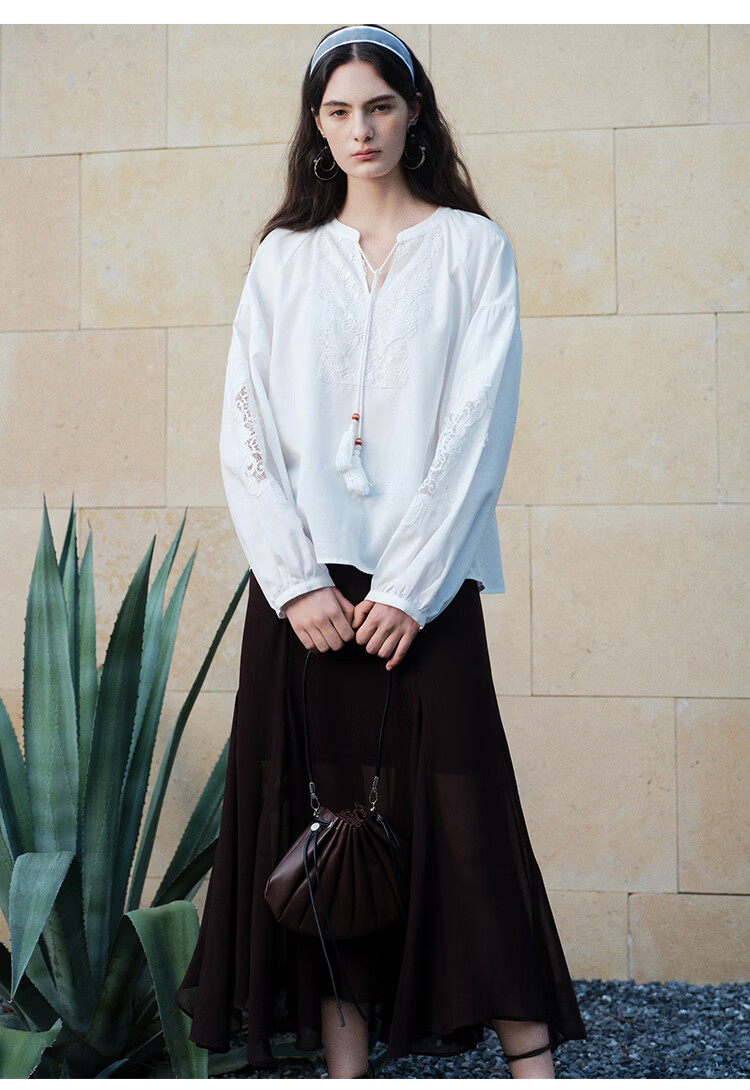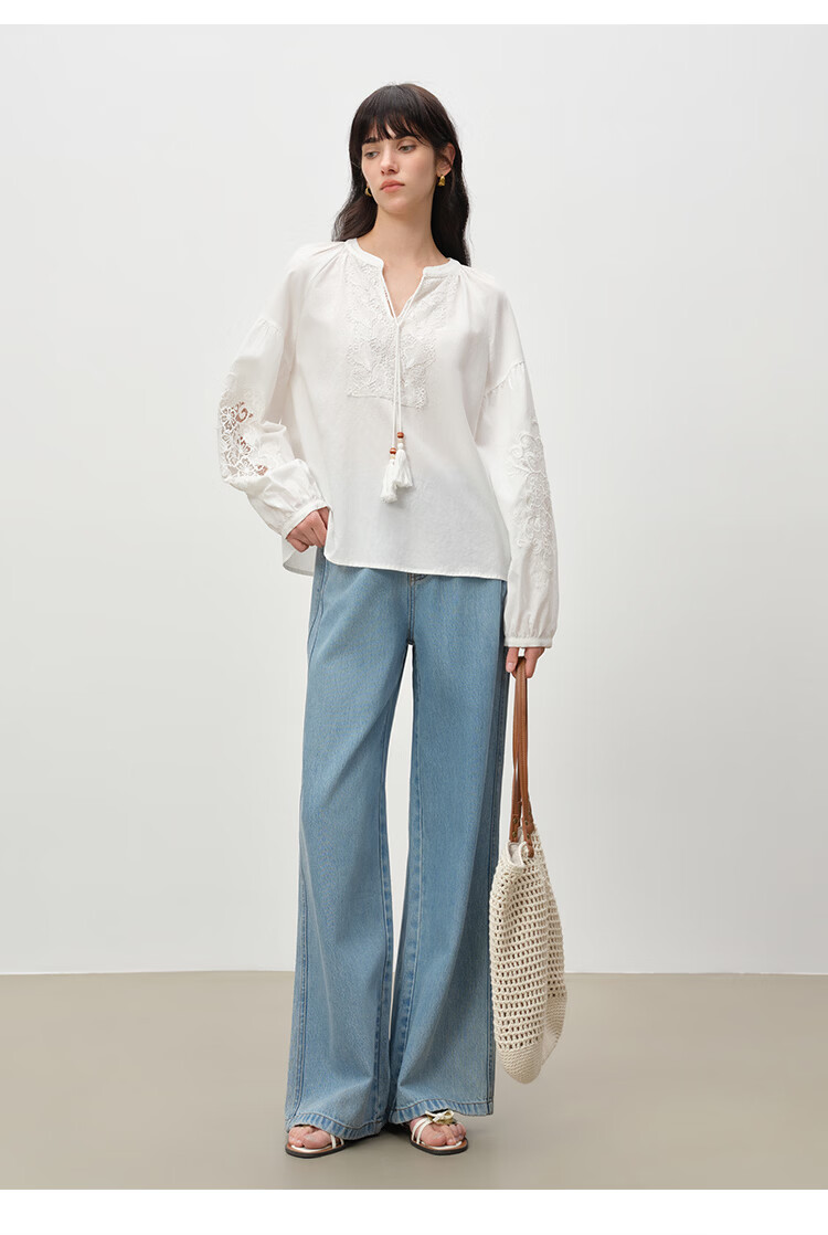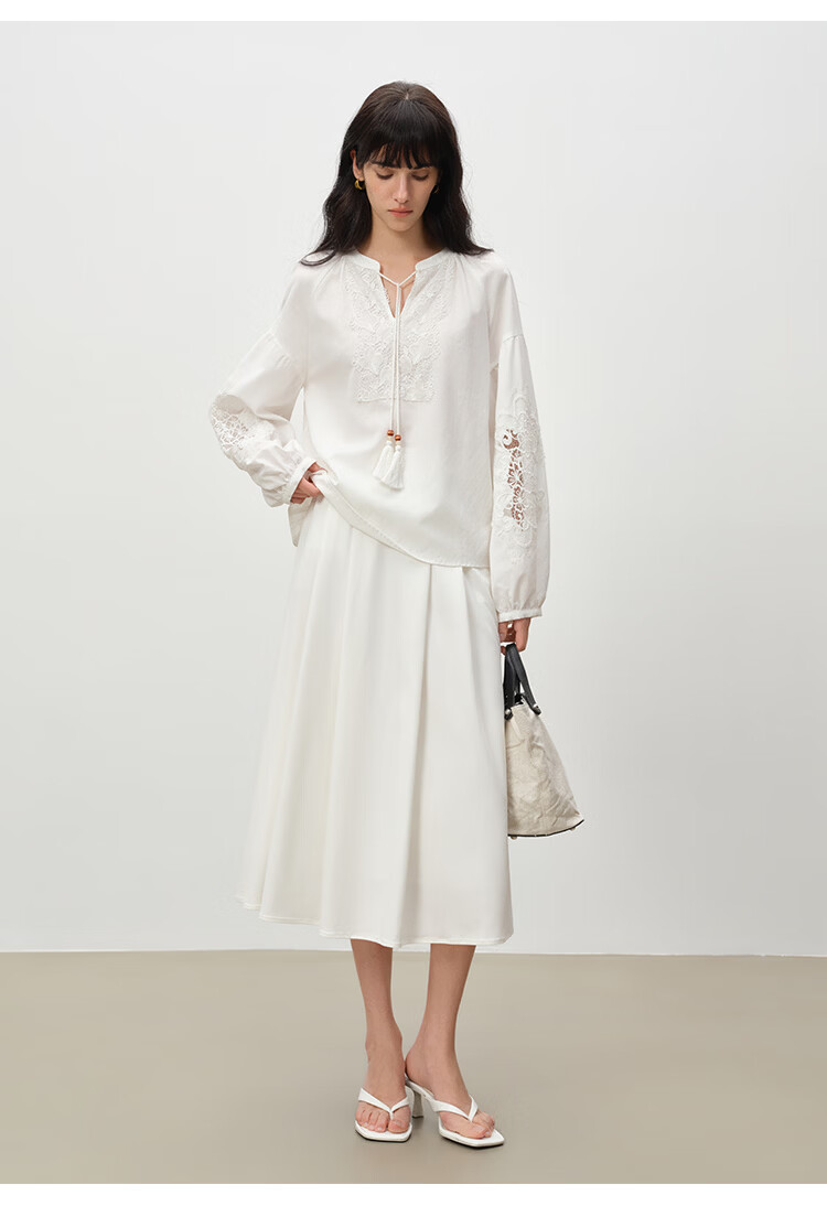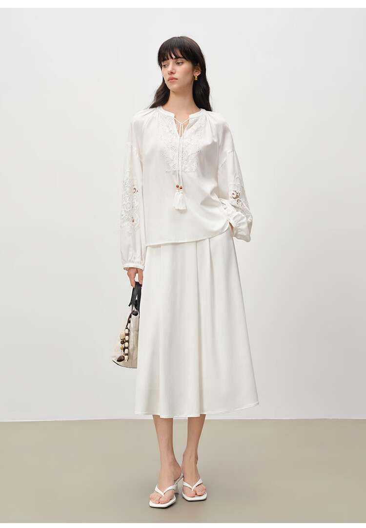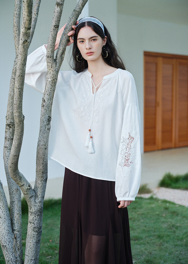 自巧小个子镂空刺绣拼接衬衫V领灯笼袖流苏抽绳上衣女2026春新品 雅白色 XXS (尺码:1)