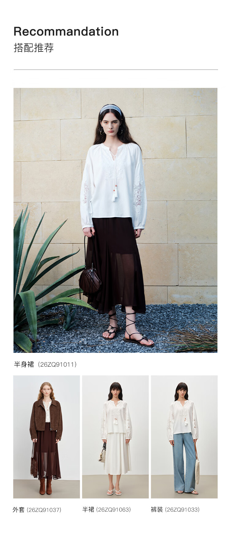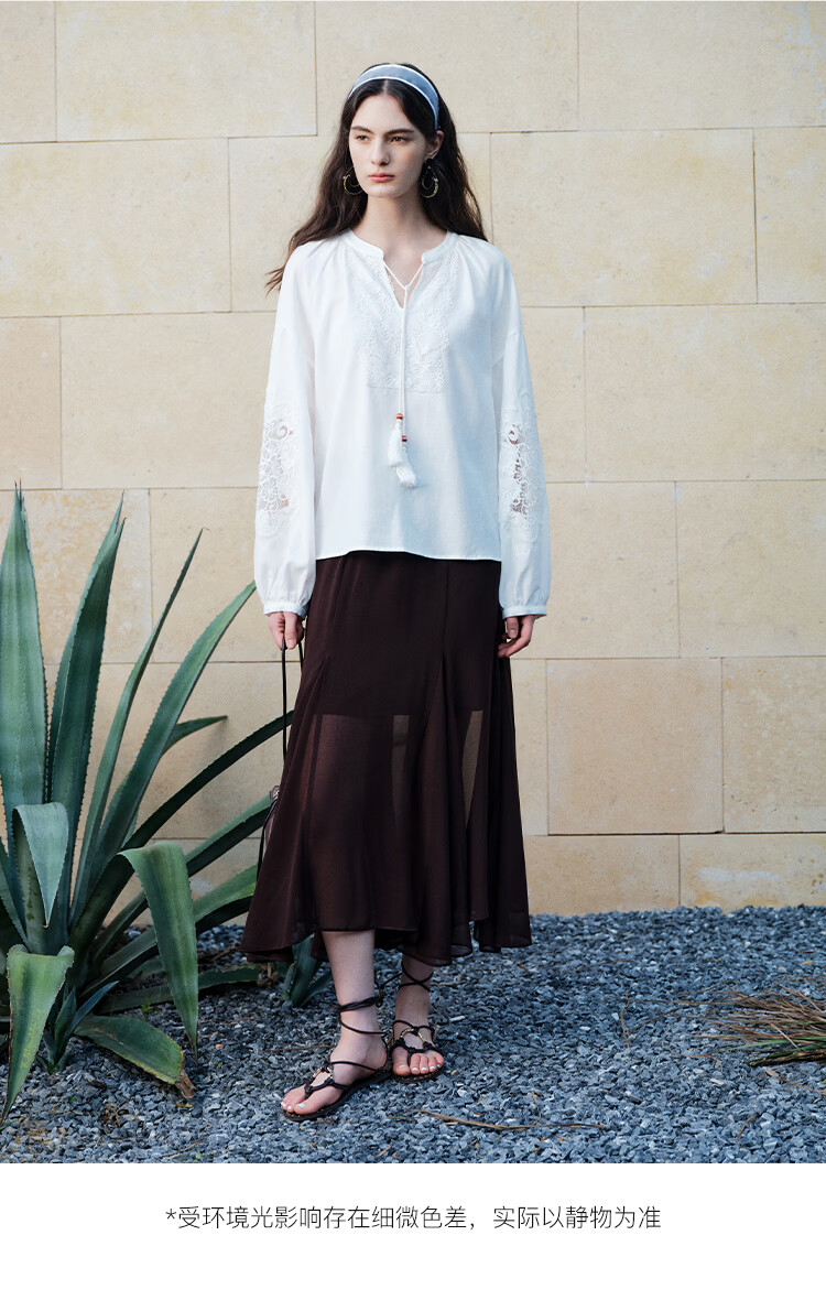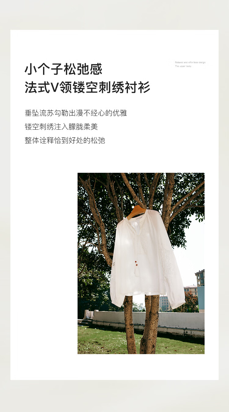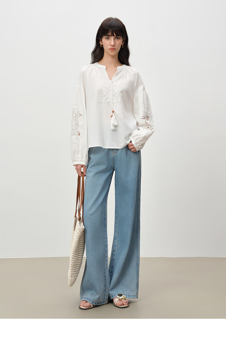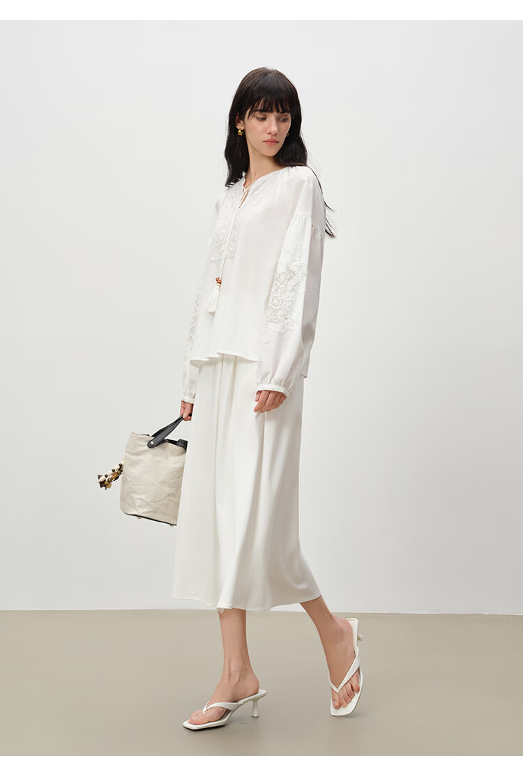 自巧小个子镂空刺绣拼接衬衫V领灯笼袖流苏抽绳上衣女2026春新品 雅白色 XXS (尺码:1)