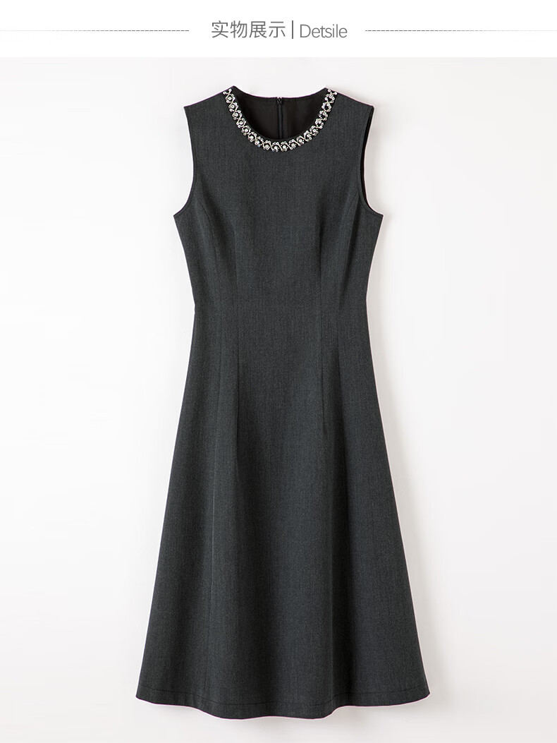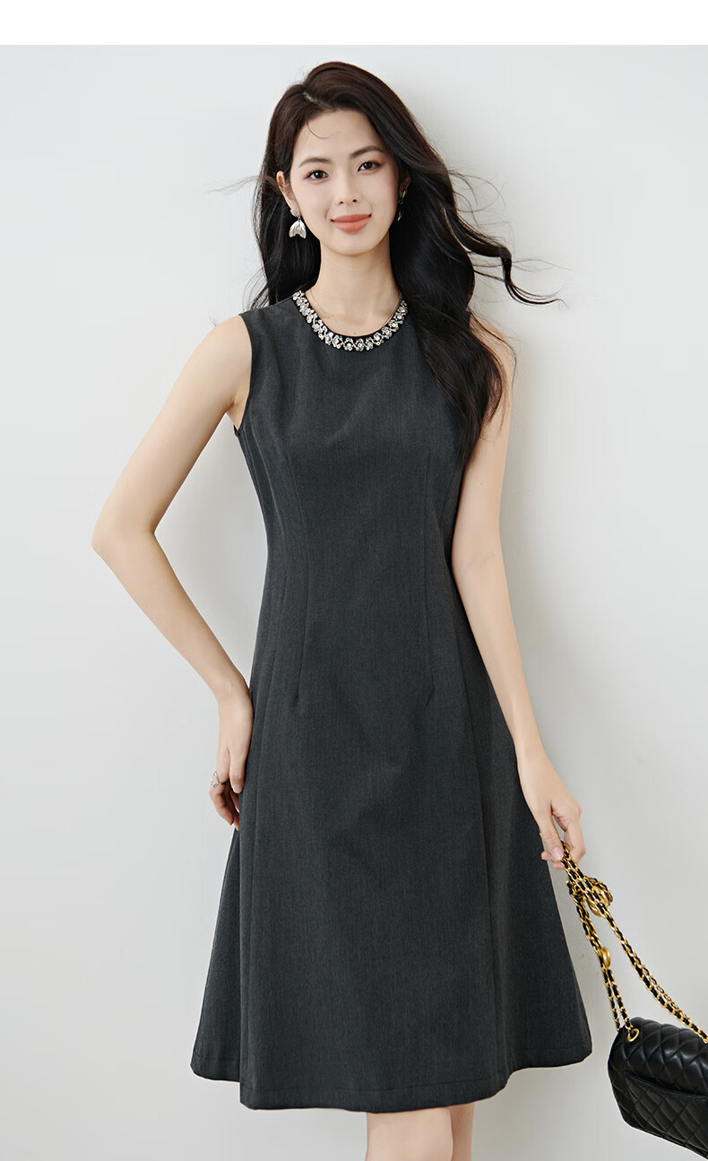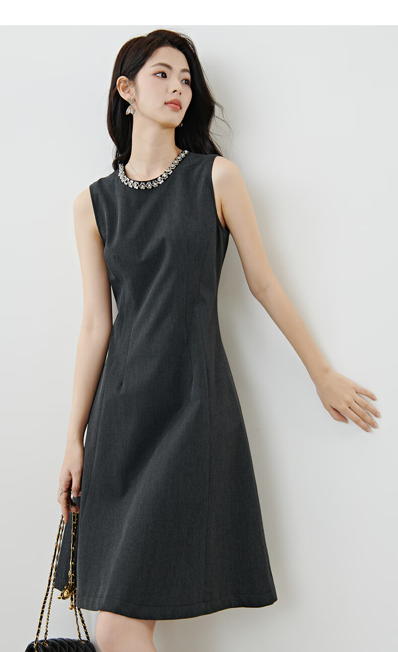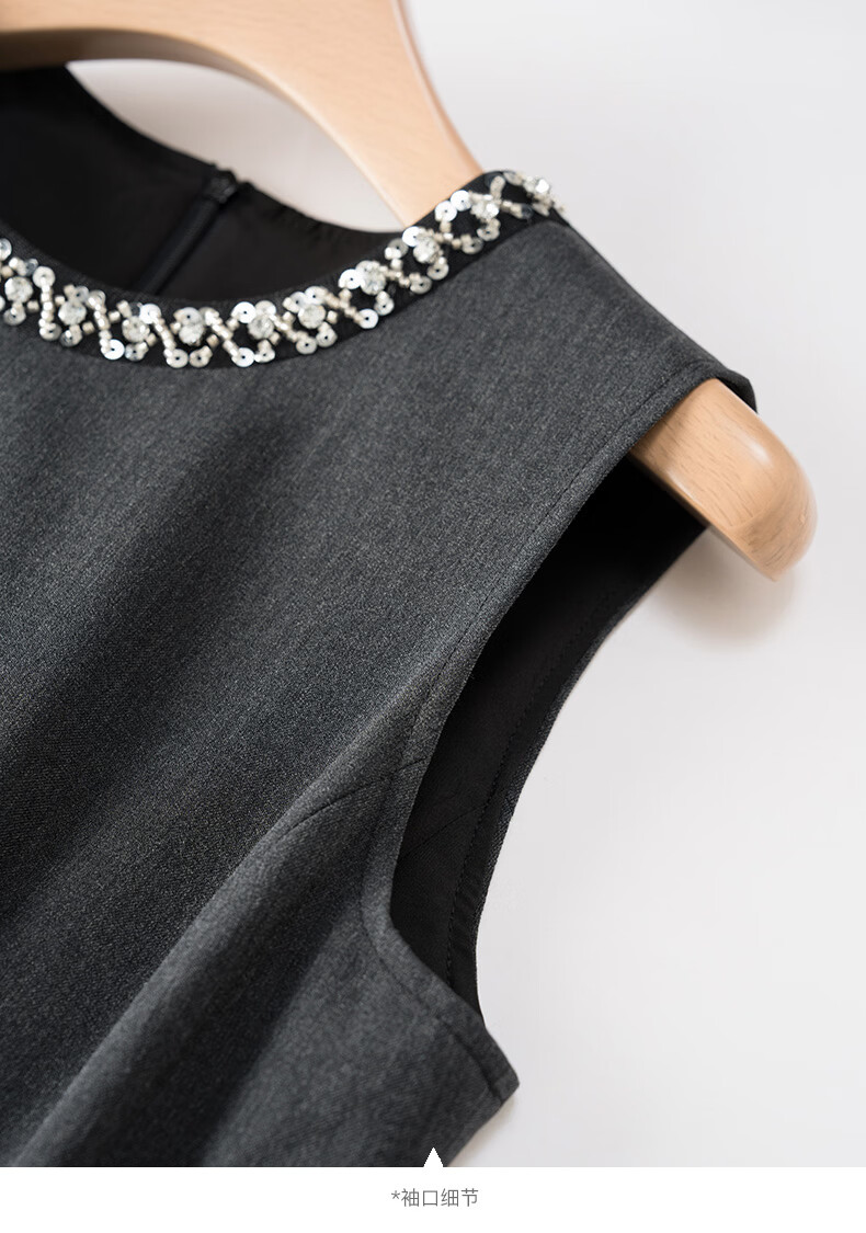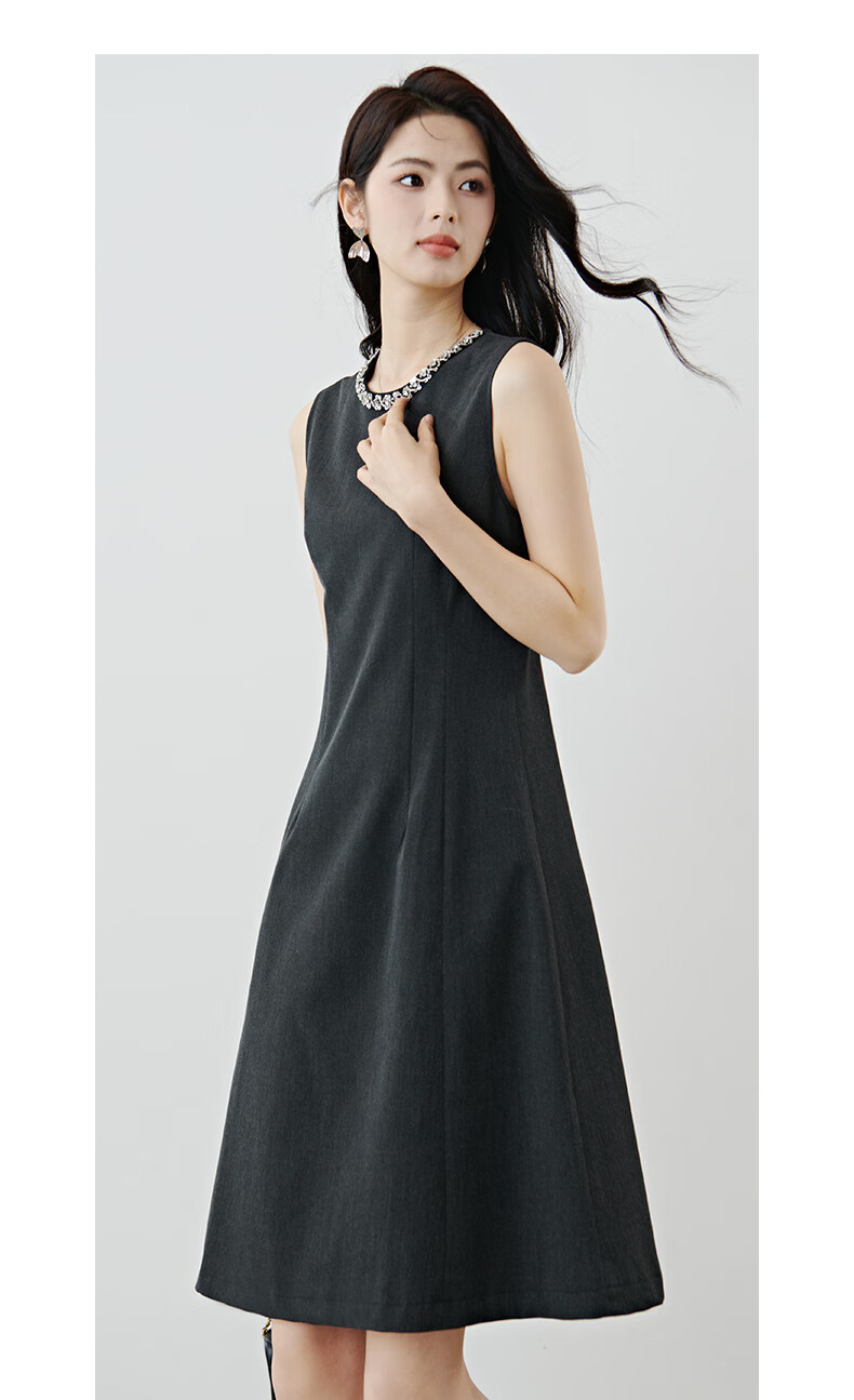 晚白【新品】2026年春款钉珠圆领裙子小个子修身显瘦无袖连衣裙 深灰色 S