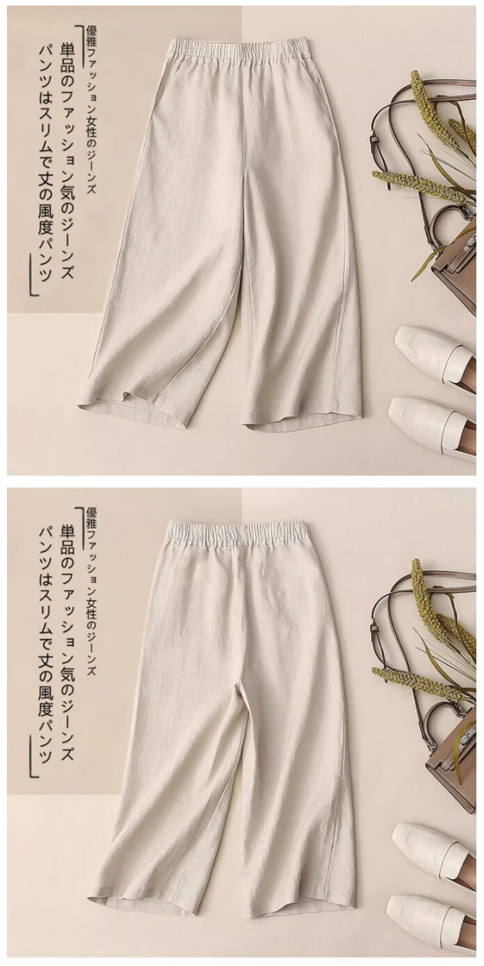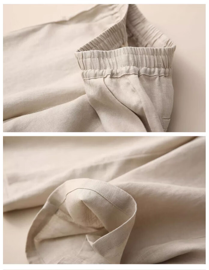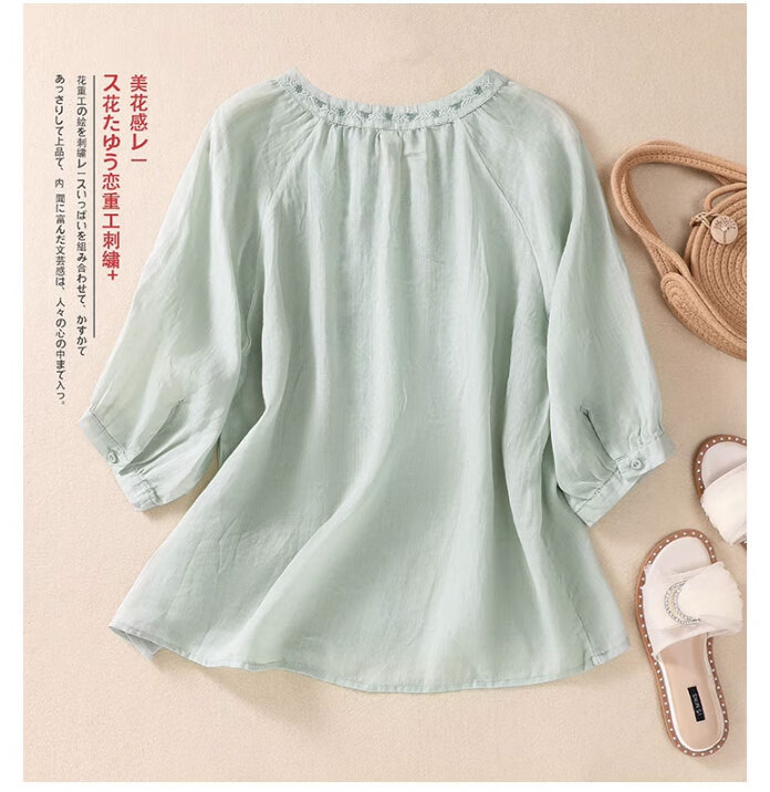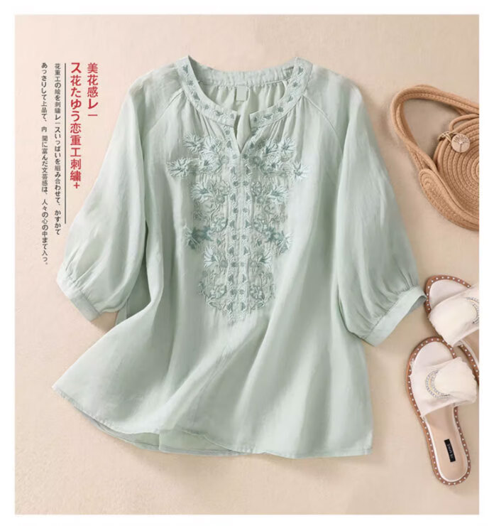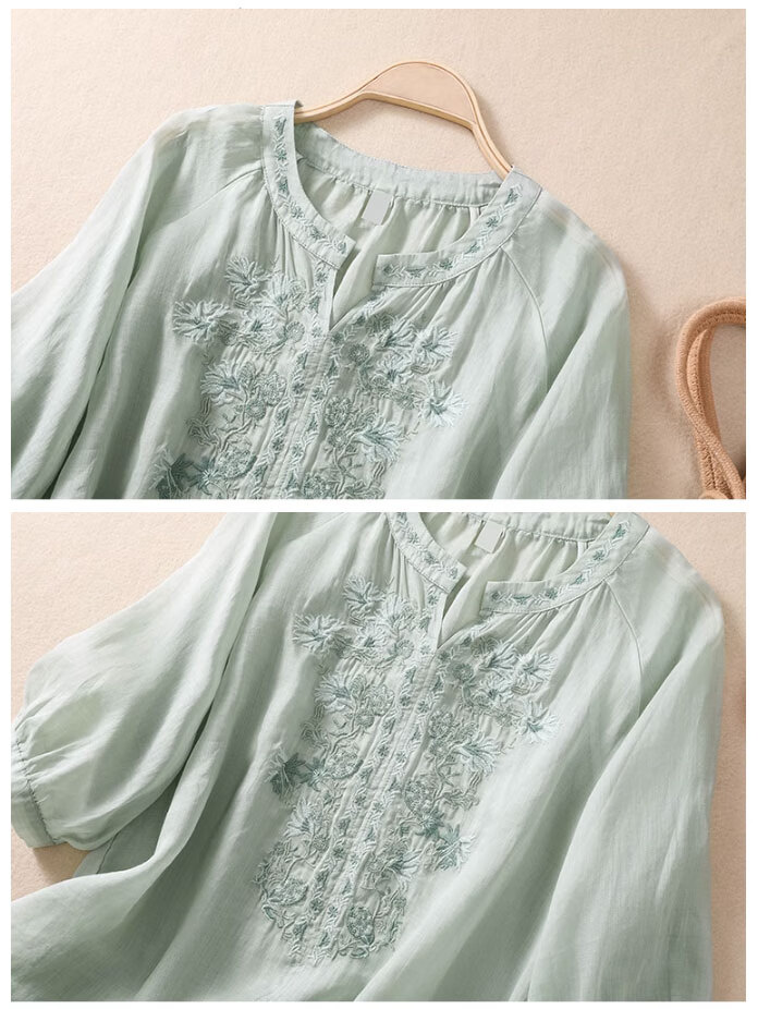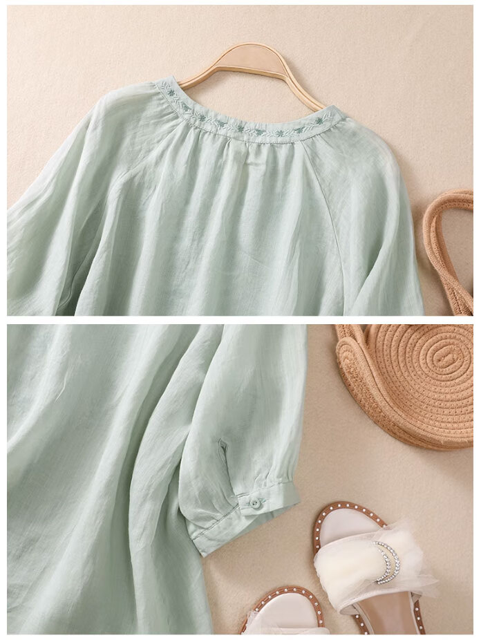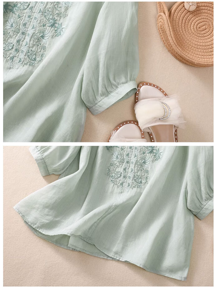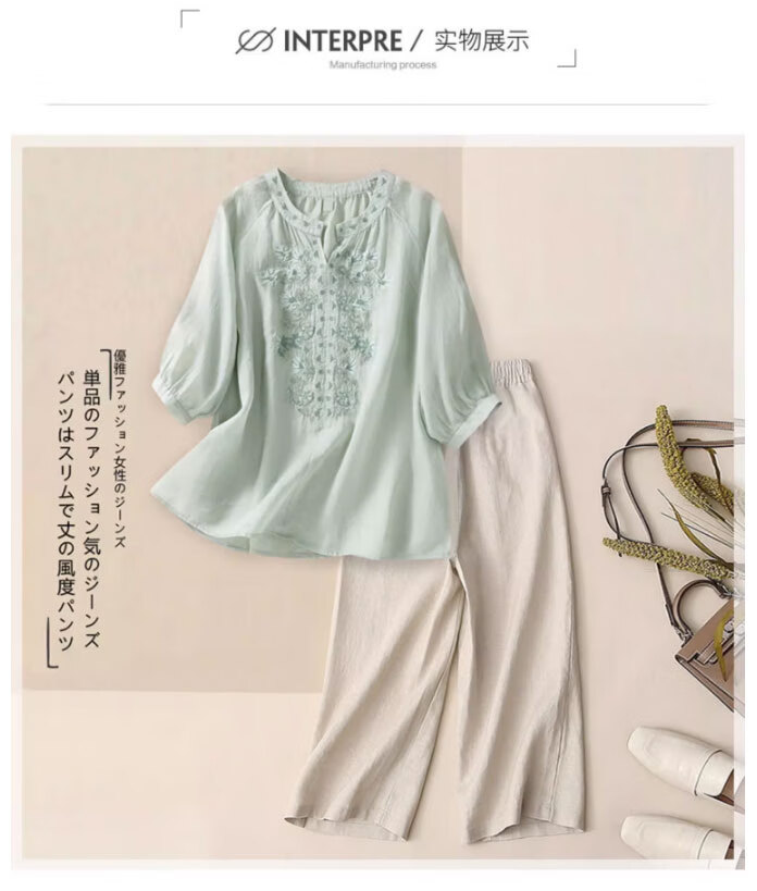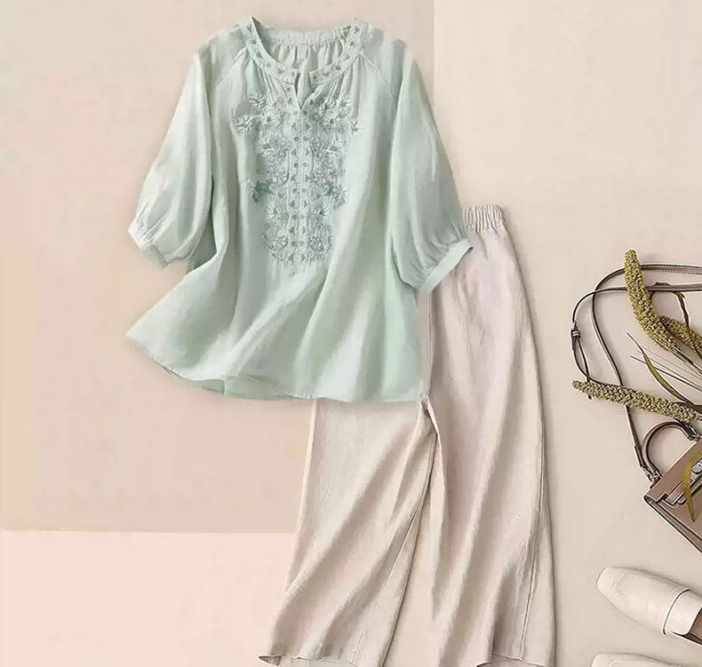 子牧棉麻夏装 女文艺短袖刺绣上衣套装阔腿裤时尚洋气两件套4428 浅绿上衣+杏色裤子 XL(建议125-135斤)
