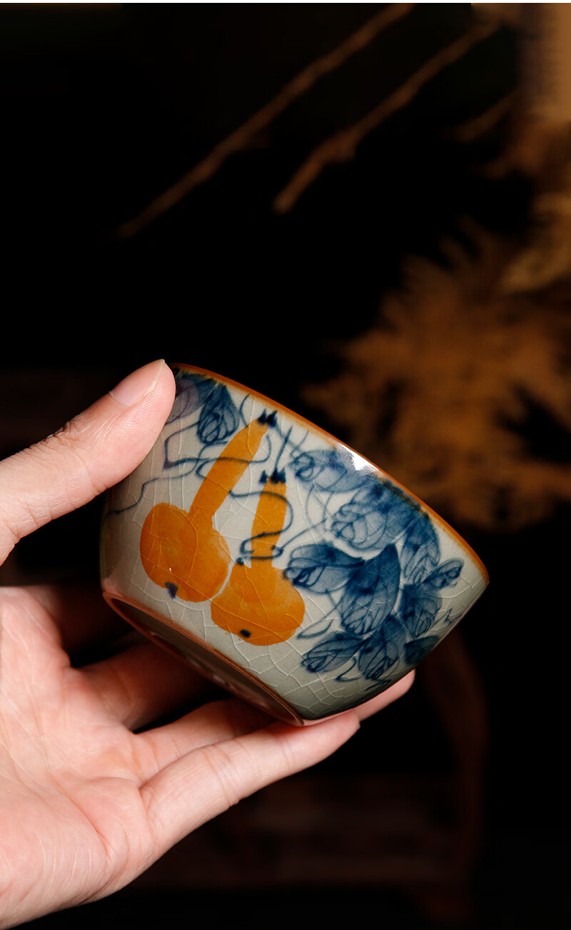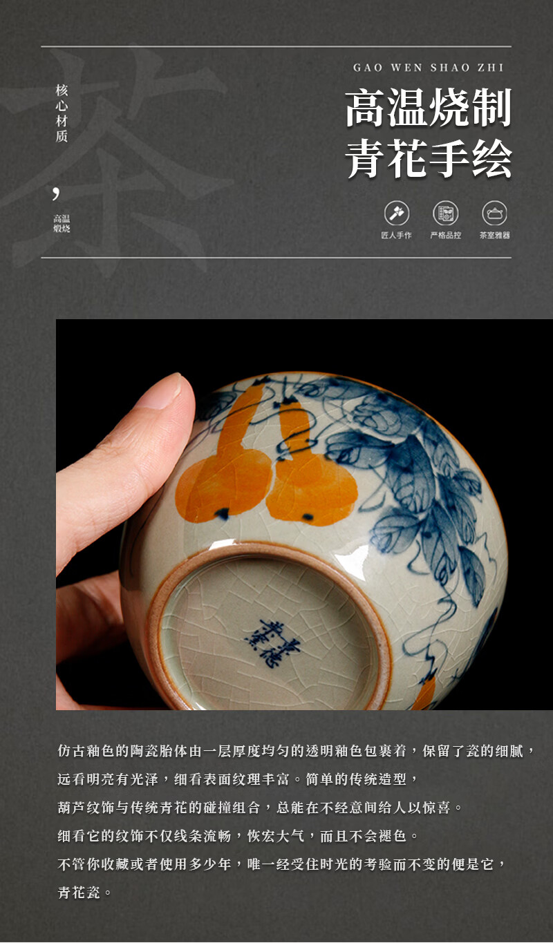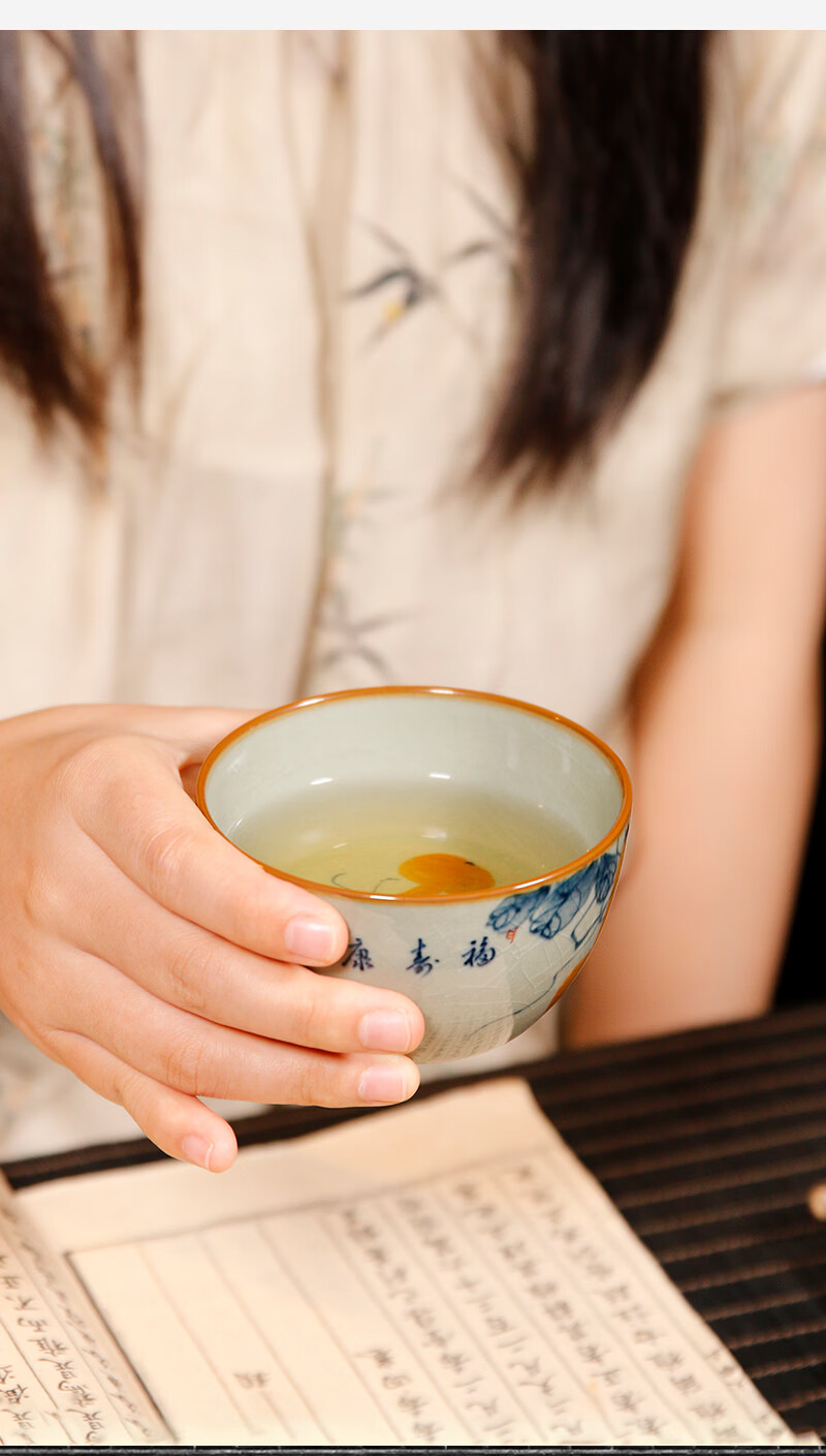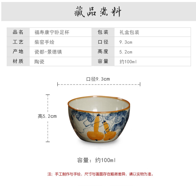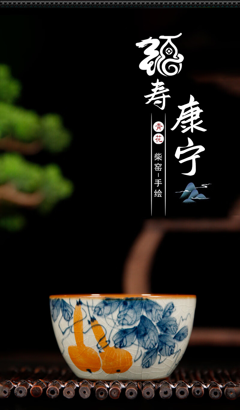 【柴房雅器】景德镇柴窑手绘青花釉里红福寿康宁卧足杯纯手工茶杯