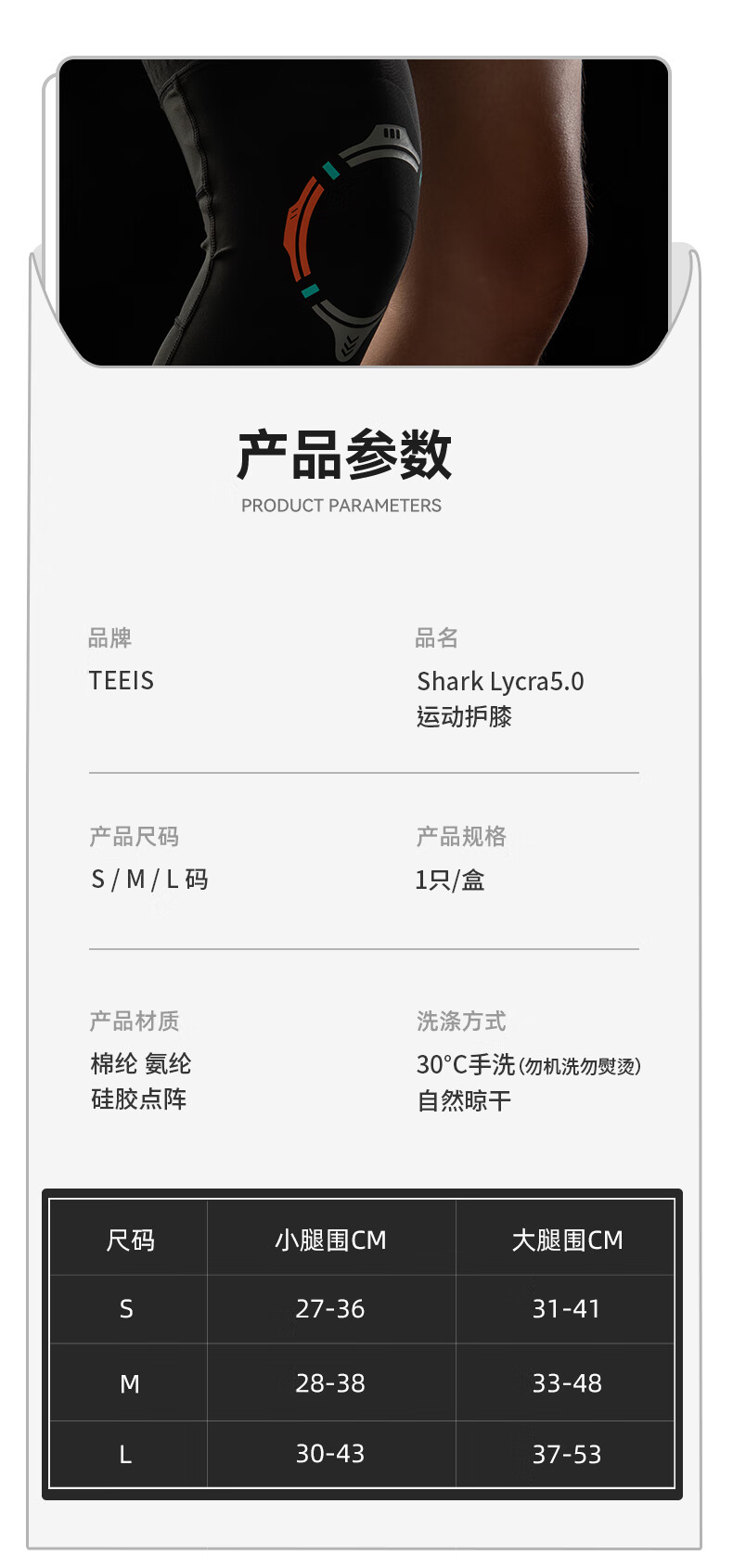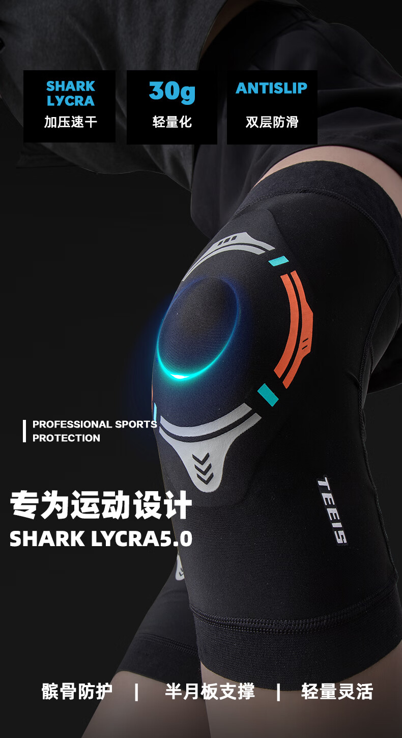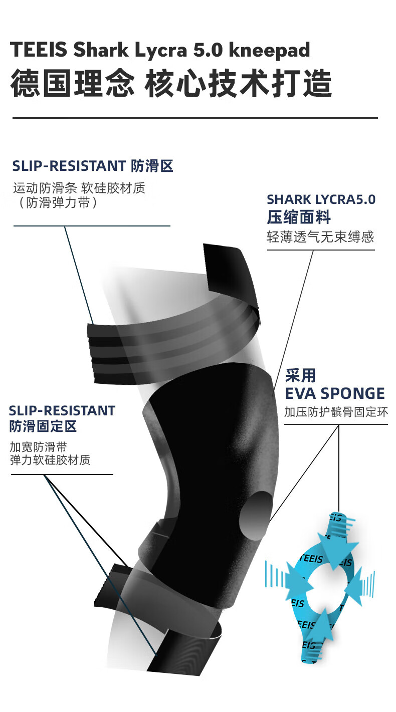 TEEIS德国护膝运动专业防护跑步专用男士女登山羽毛球半月板损伤护具 Shark Lycra 5.0 M码 丨大腿围33CM-48CM