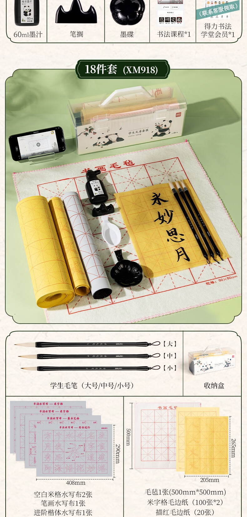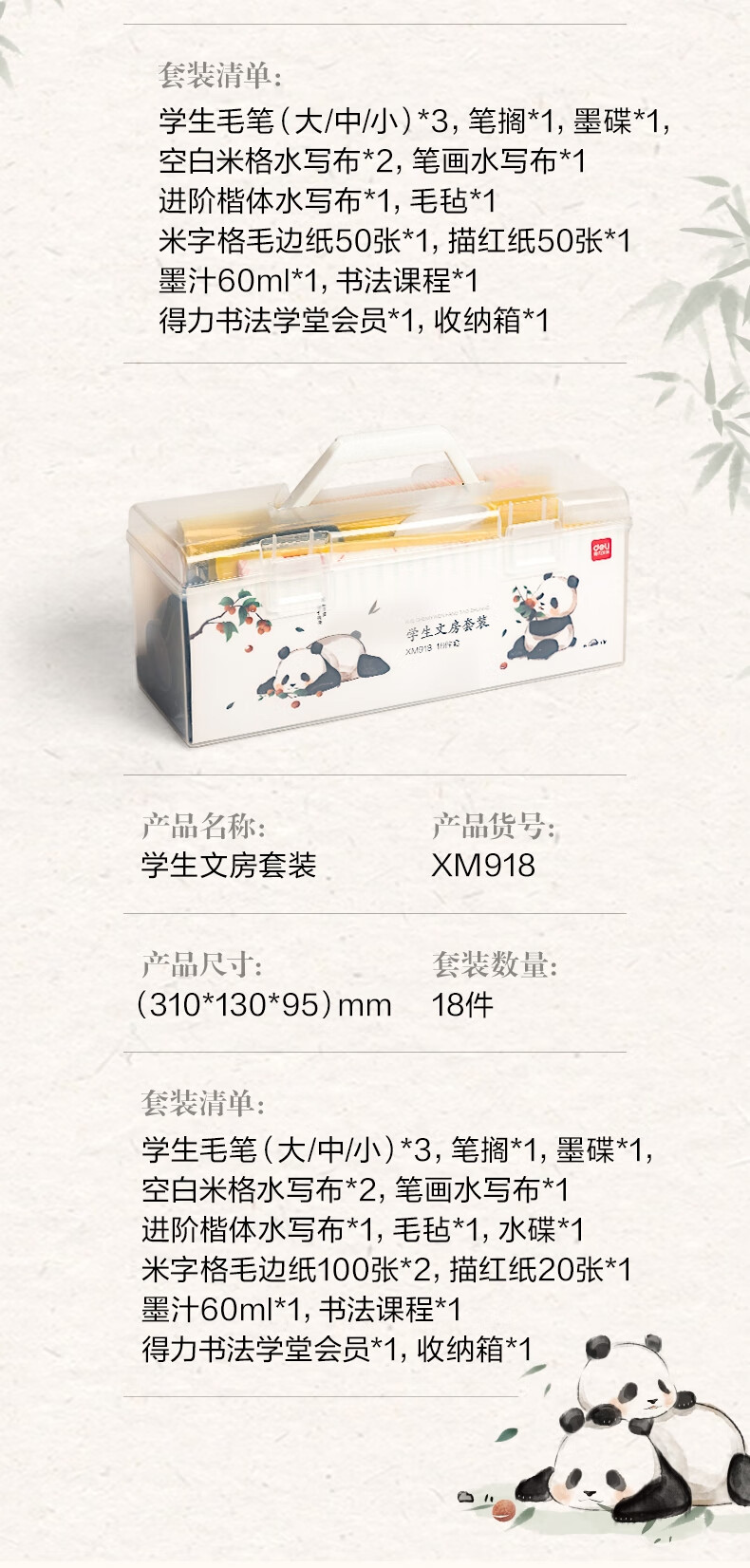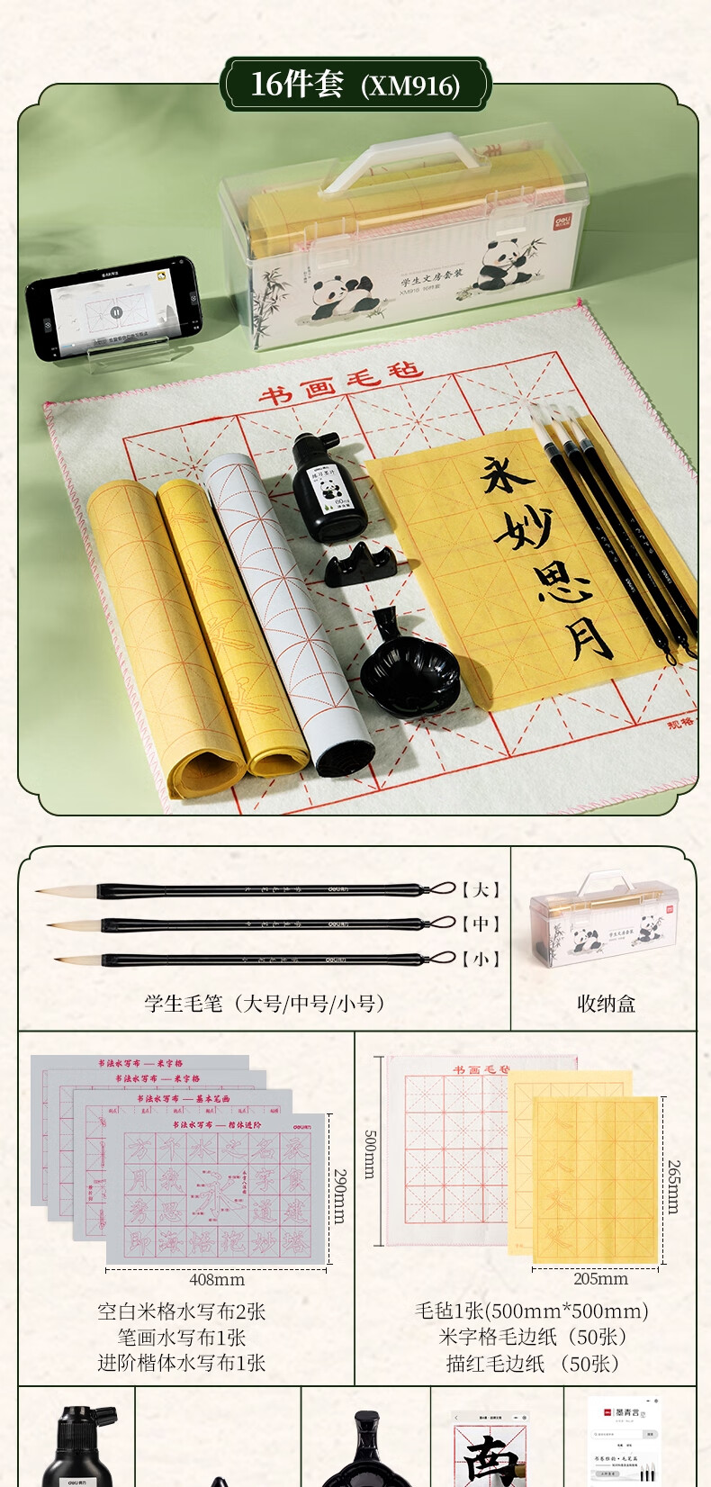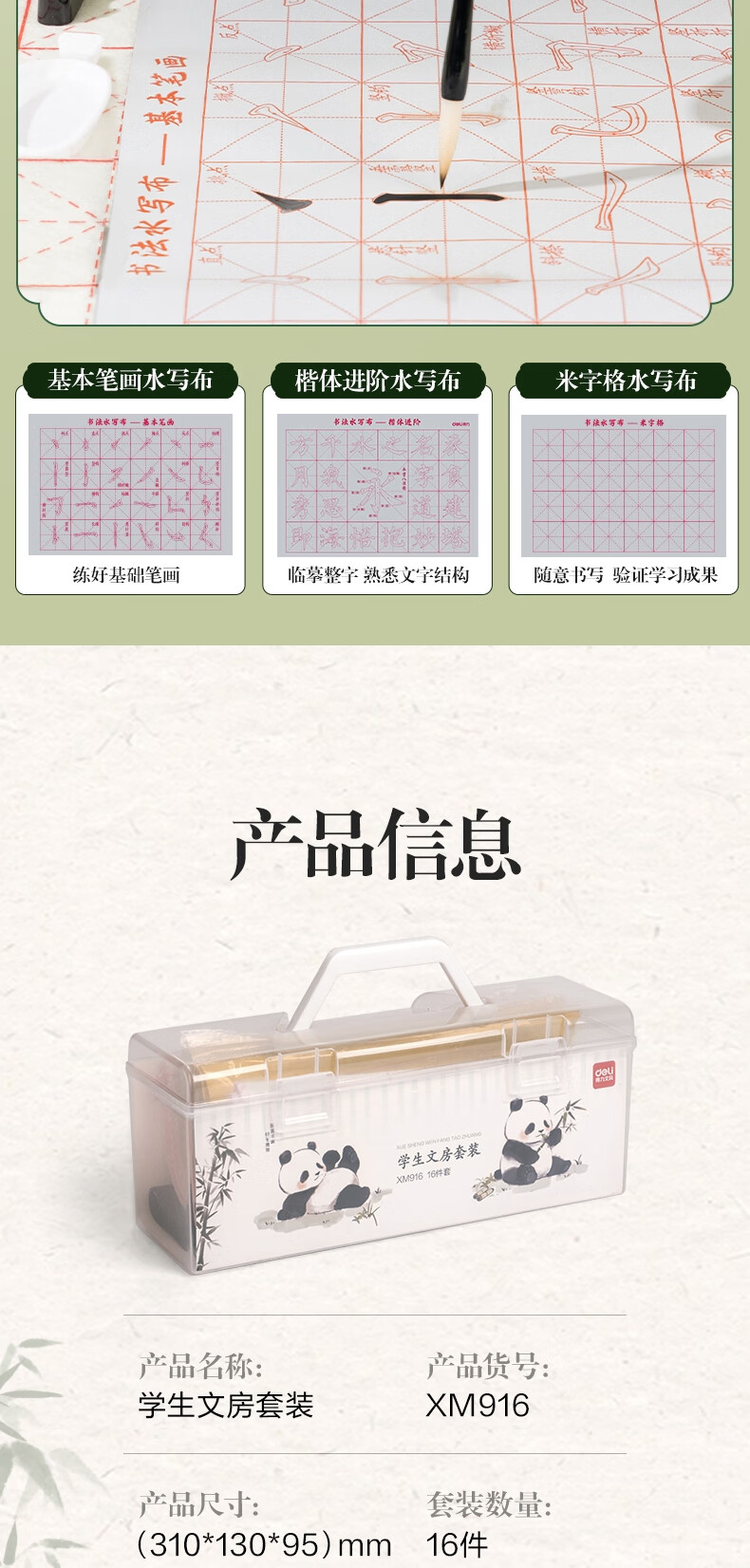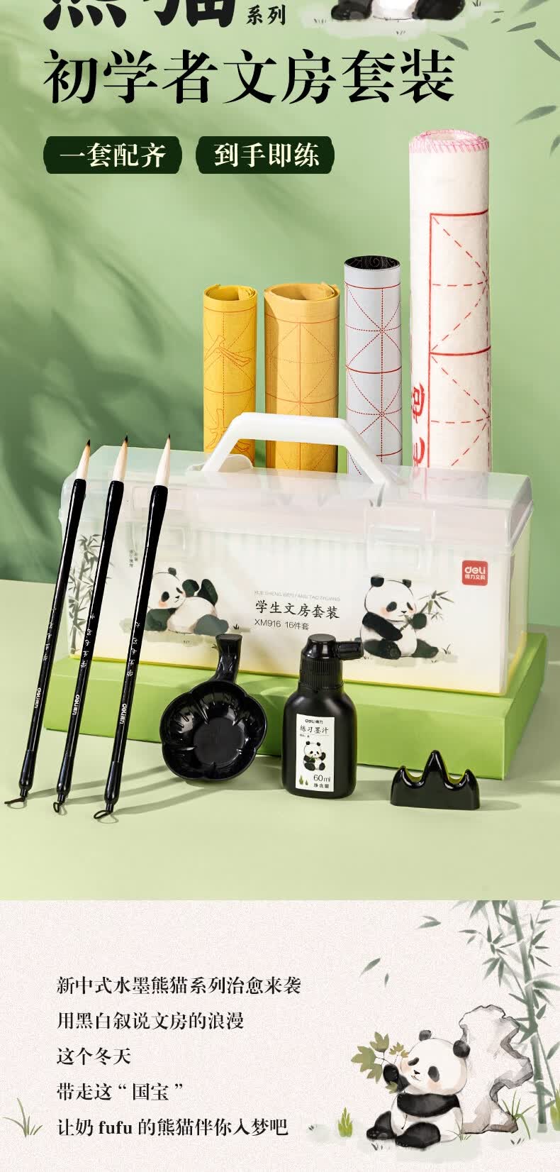 得力(deli)熊猫学生文房书法套装文房四宝毛笔砚台宣纸开学礼物初学者入门临摹书法收纳箱16件套开学用品