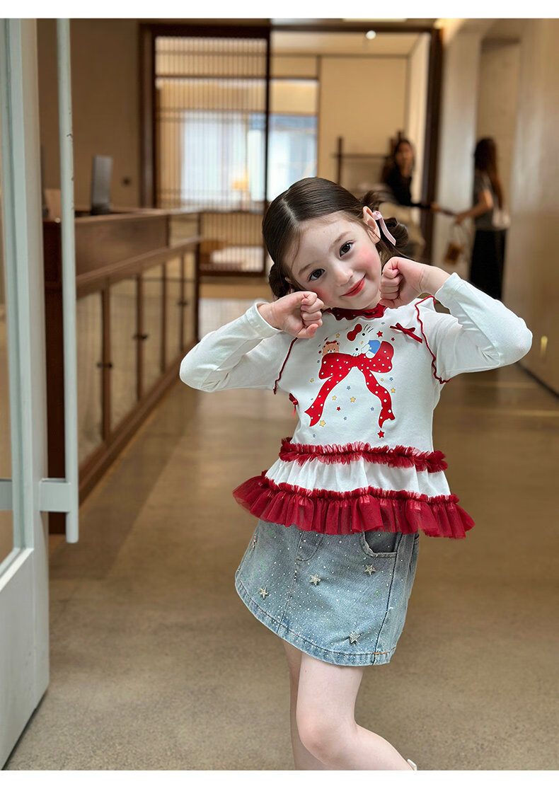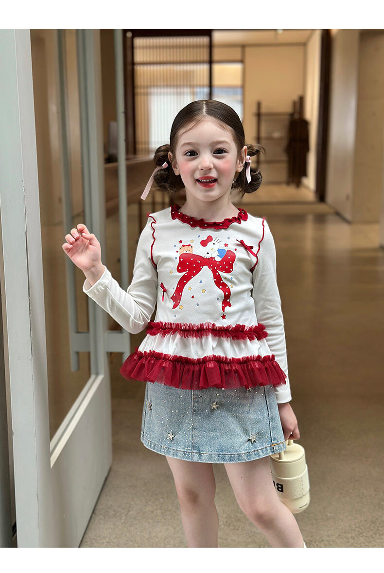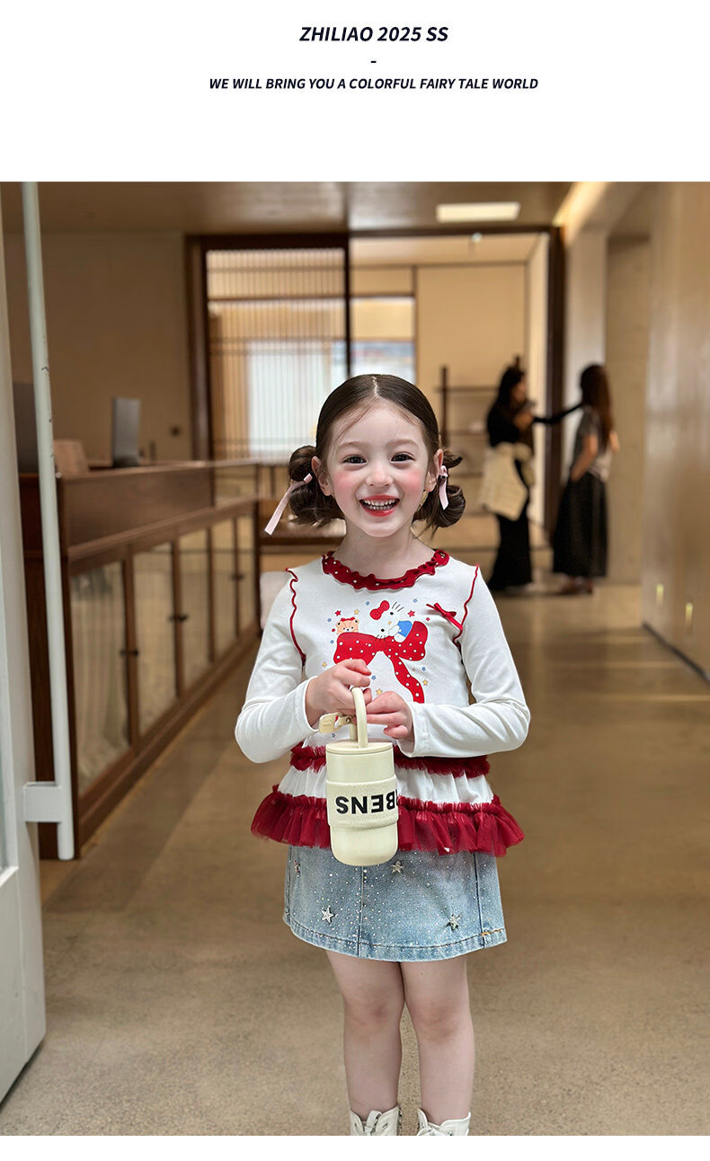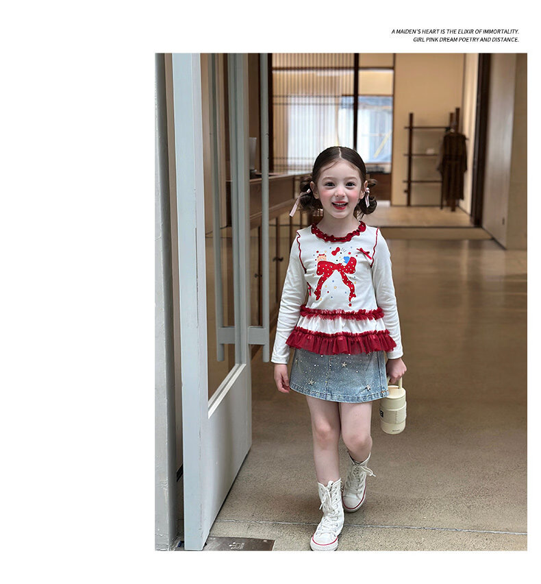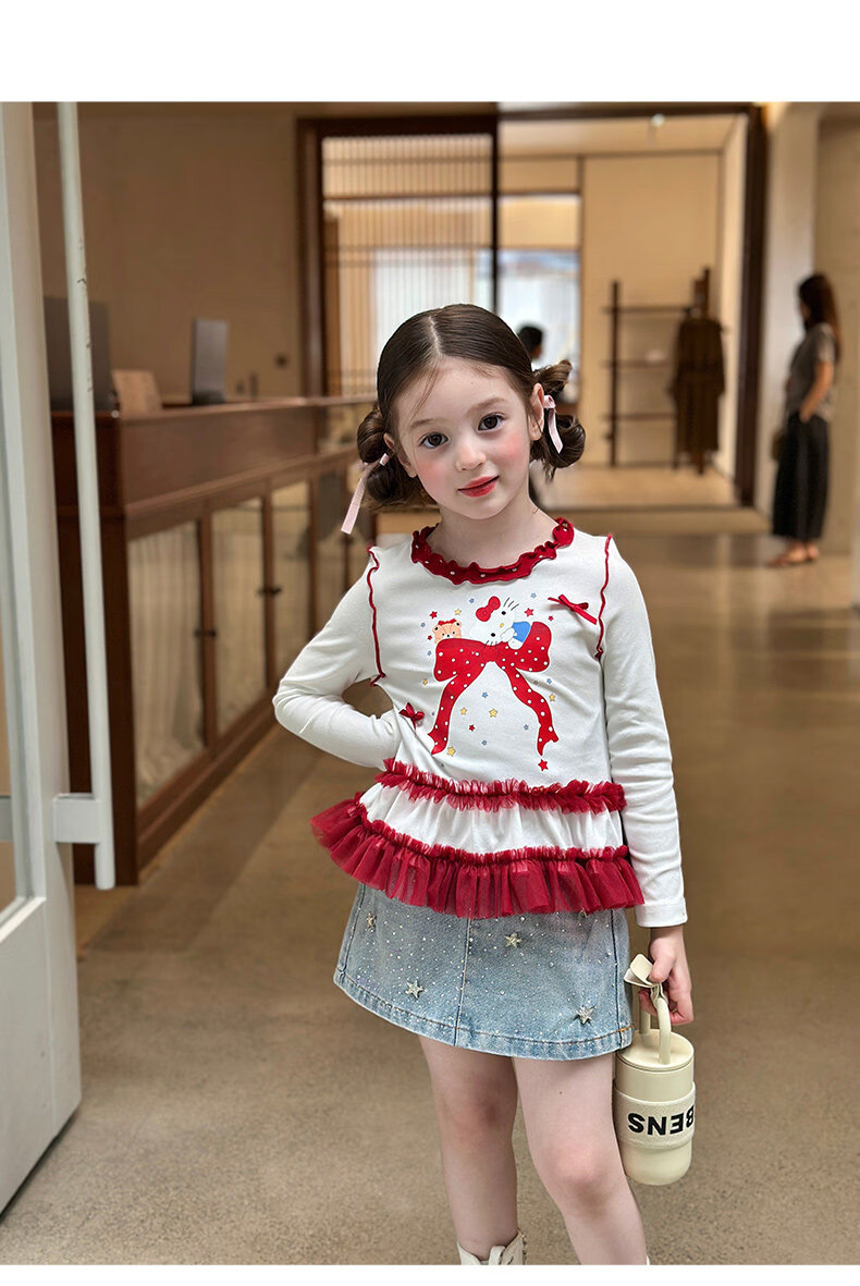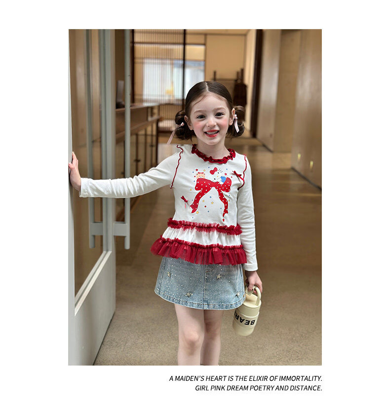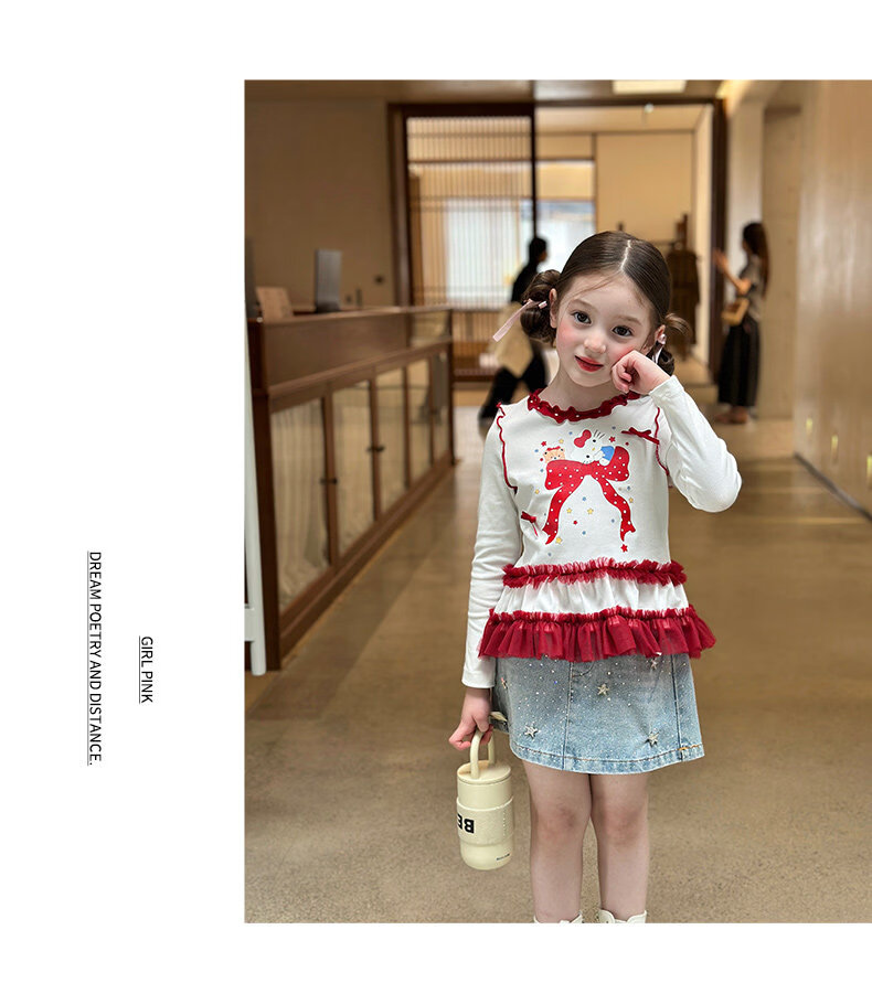 栀了成长记童装女童韩版甜美蝴蝶结上衣2026春季儿童可爱圆领T恤 蓝色 半身裙 130 cm