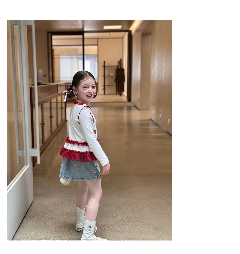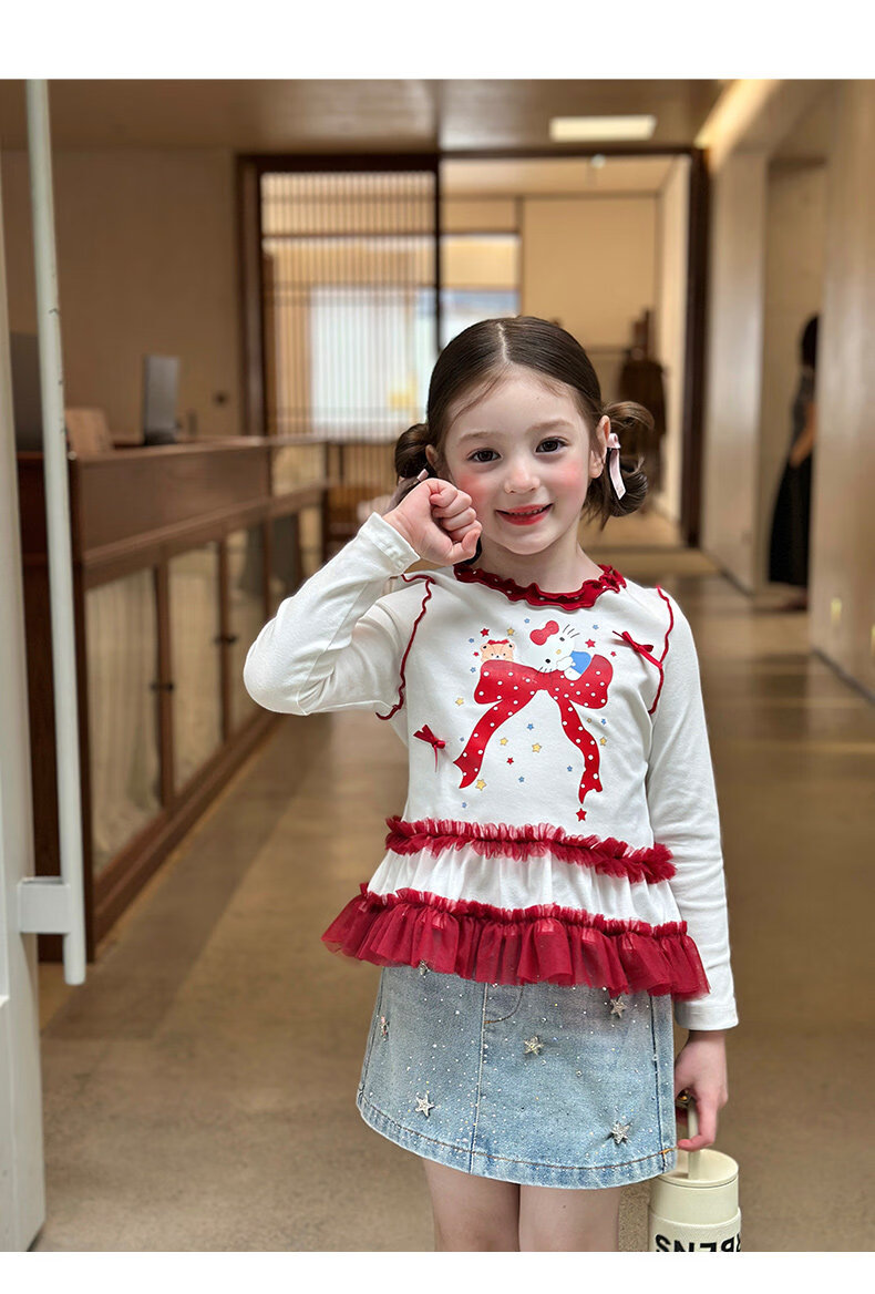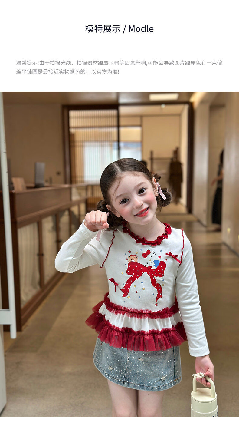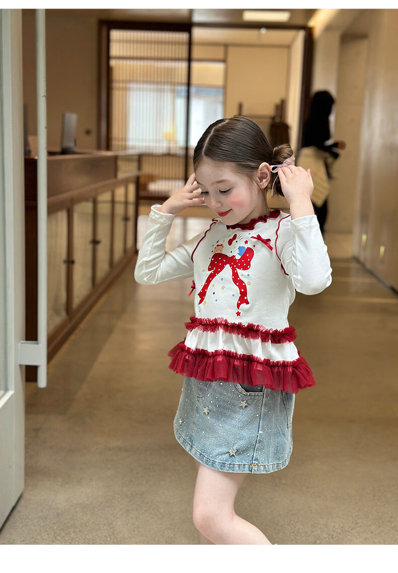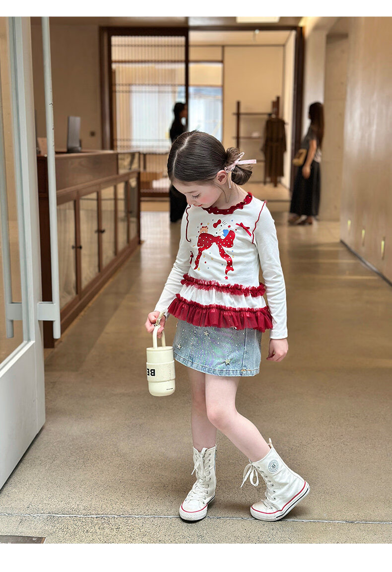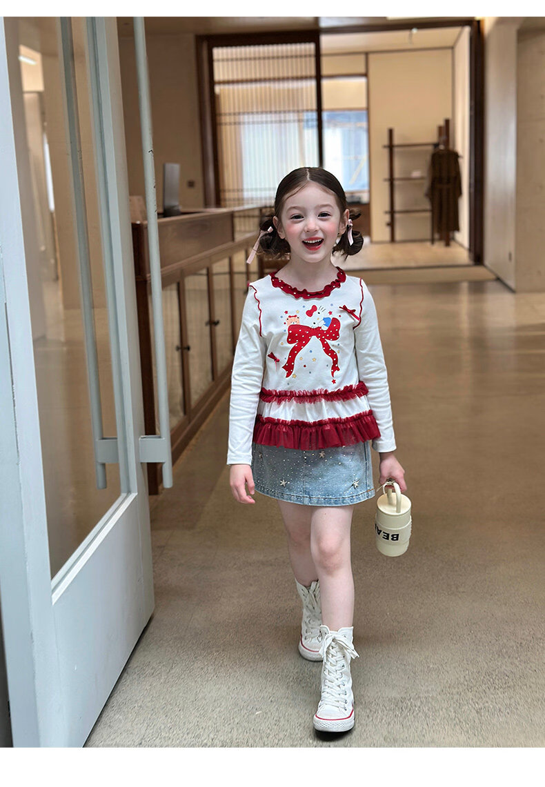 栀了成长记童装女童韩版甜美蝴蝶结上衣2026春季儿童可爱圆领T恤 蓝色 半身裙 130 cm