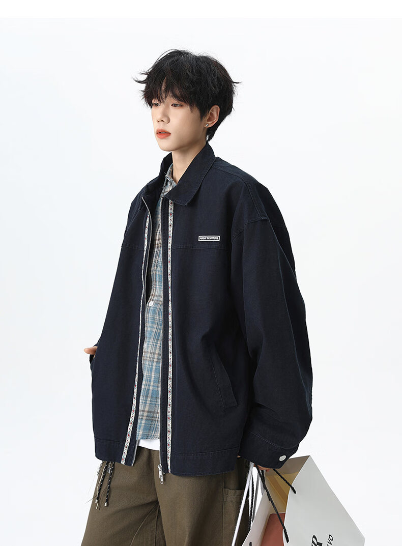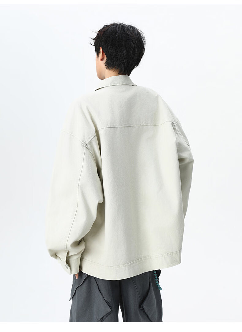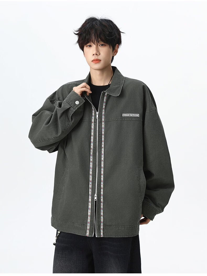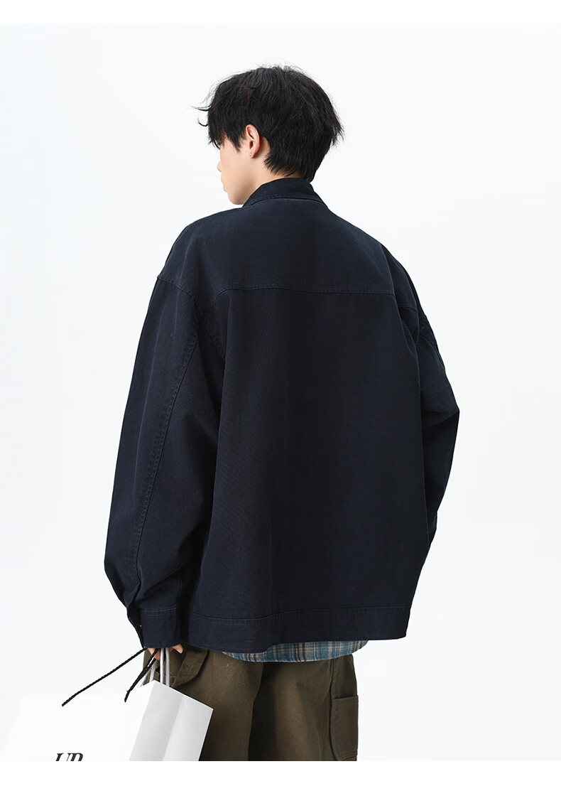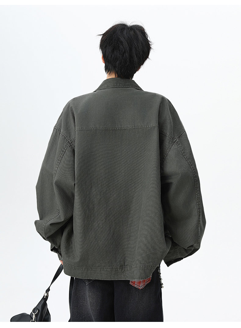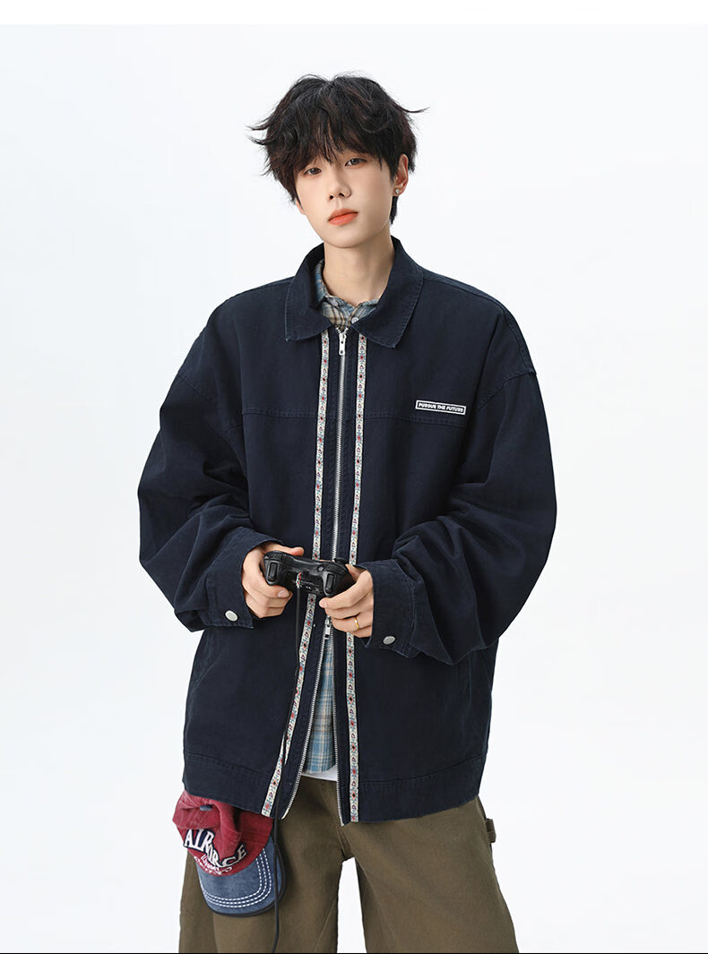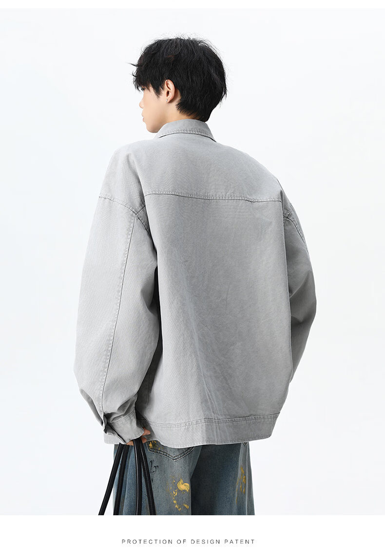 NEW OR MODE美式复古水洗纯棉工装外套男士春秋新款宽松拼接休闲翻领夹克上衣 灰兰色【高品质】 XL 【建议125-145斤】