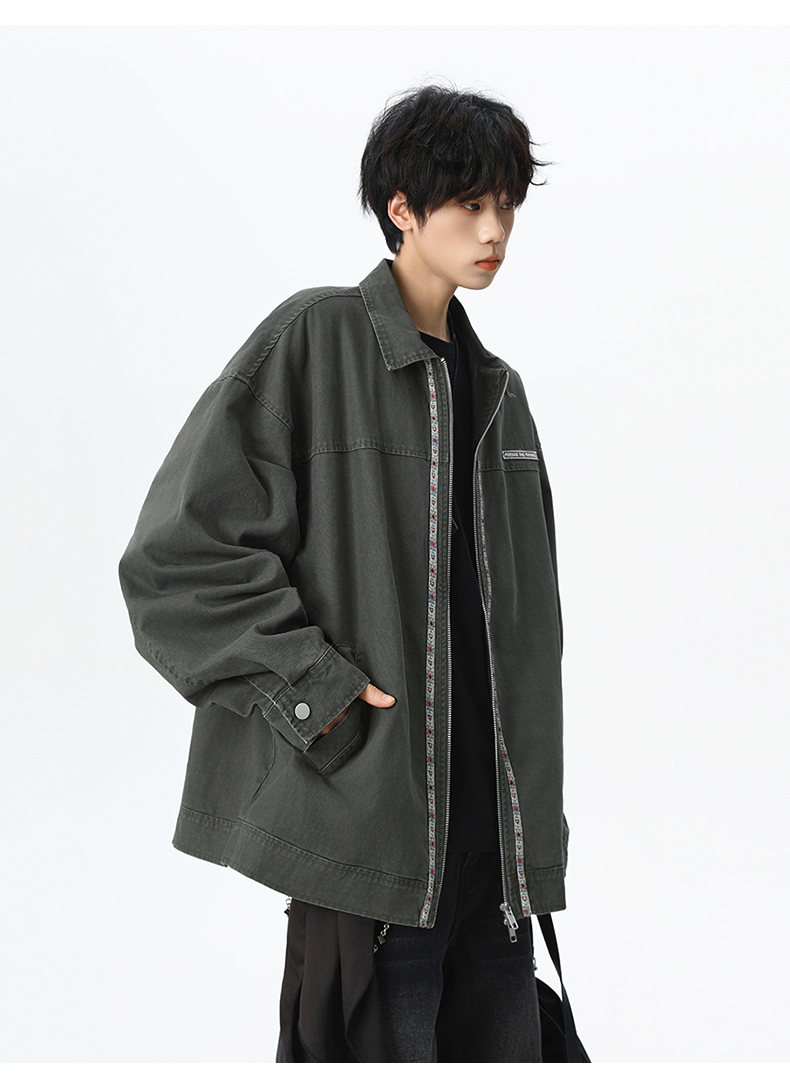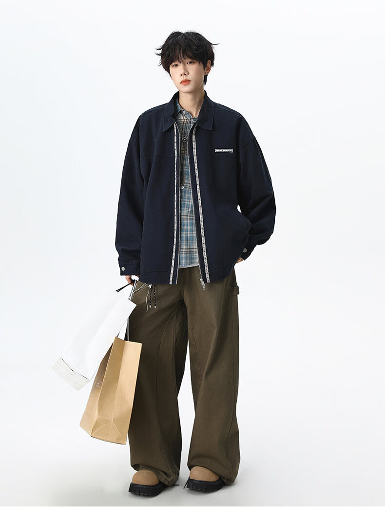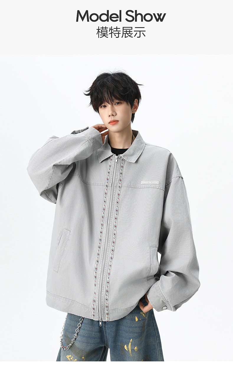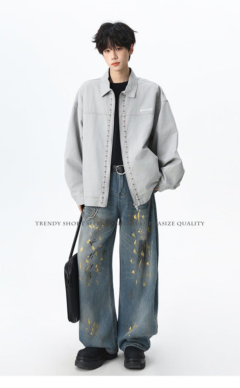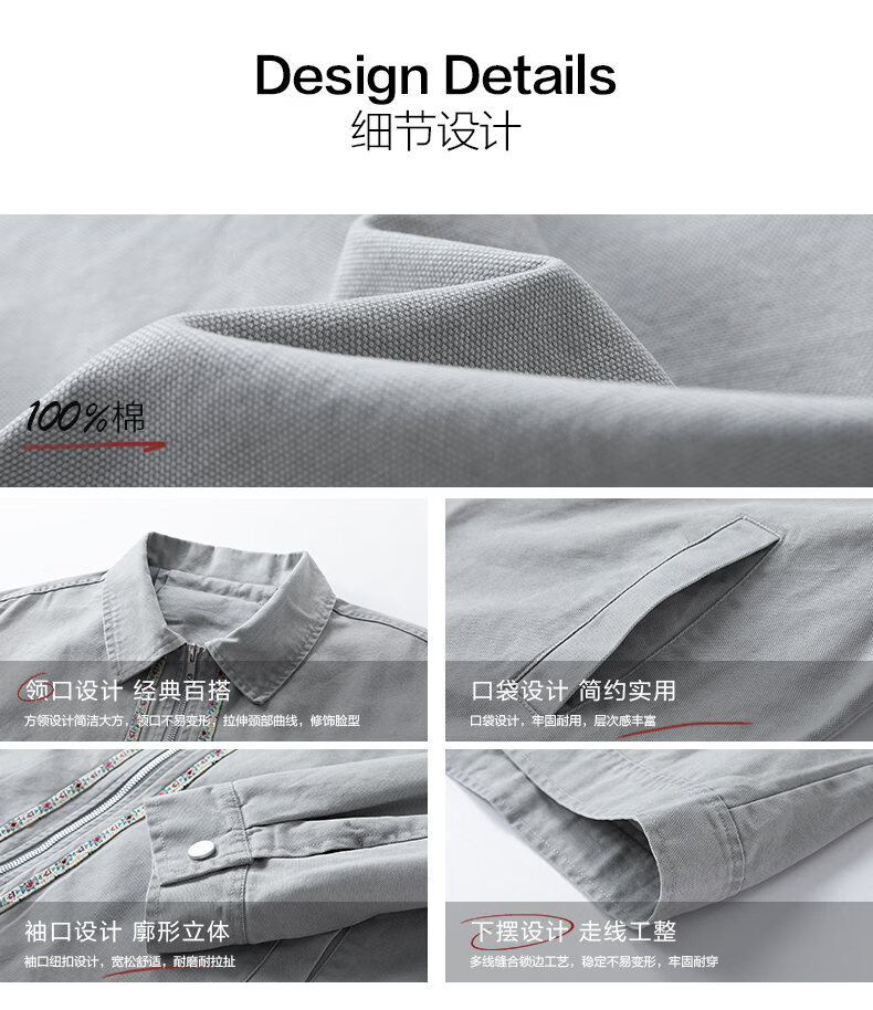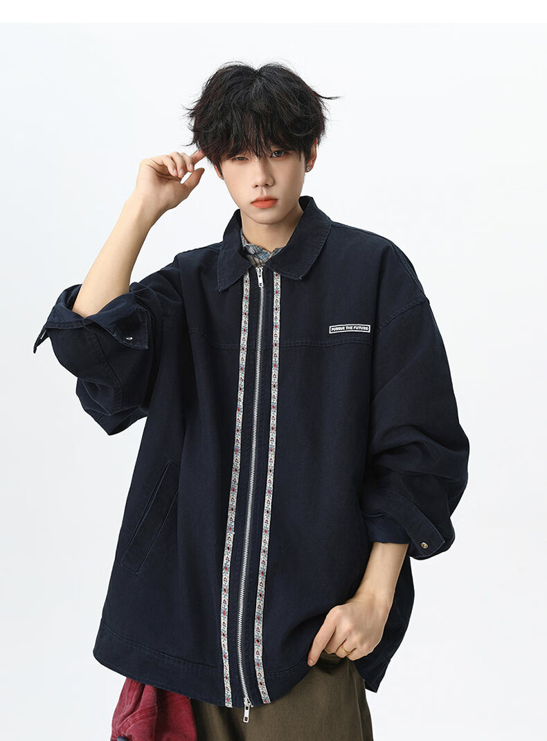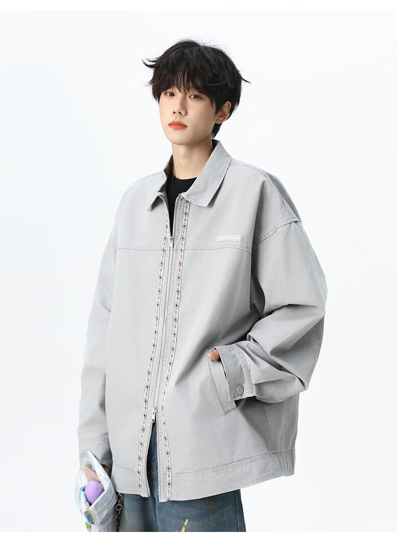 NEW OR MODE美式复古水洗纯棉工装外套男士春秋新款宽松拼接休闲翻领夹克上衣 灰兰色【高品质】 XL 【建议125-145斤】