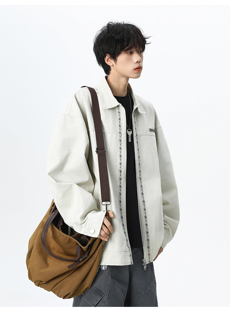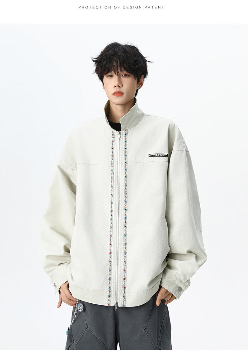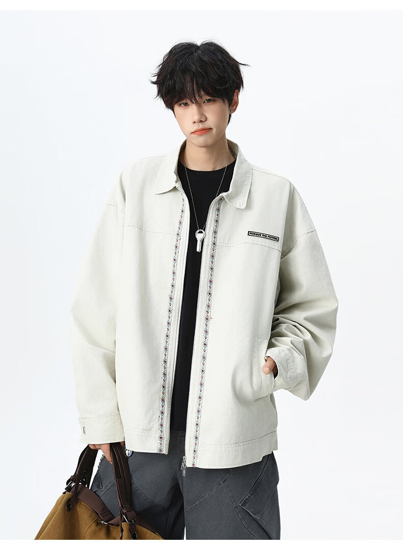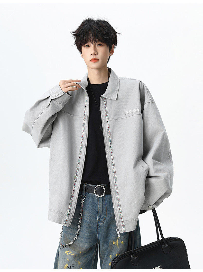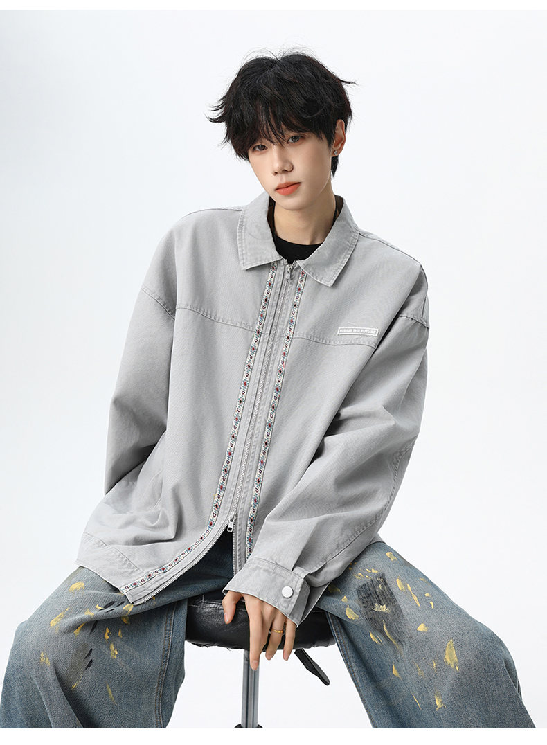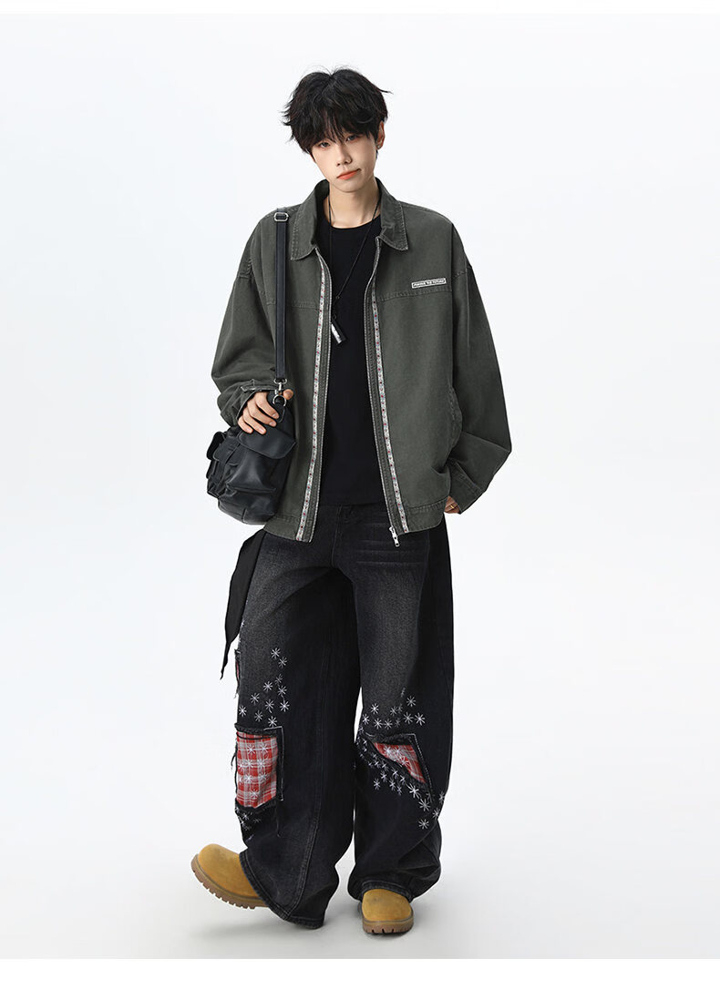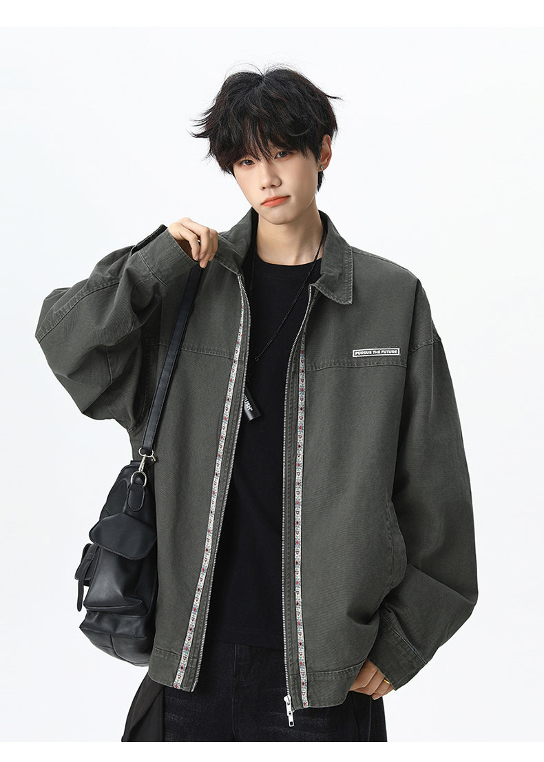 NEW OR MODE美式复古水洗纯棉工装外套男士春秋新款宽松拼接休闲翻领夹克上衣 灰兰色【高品质】 XL 【建议125-145斤】