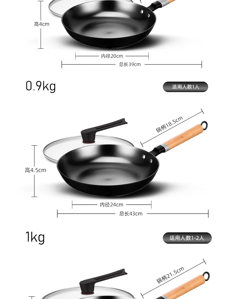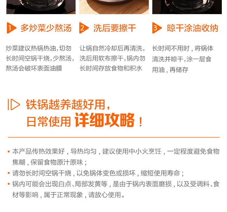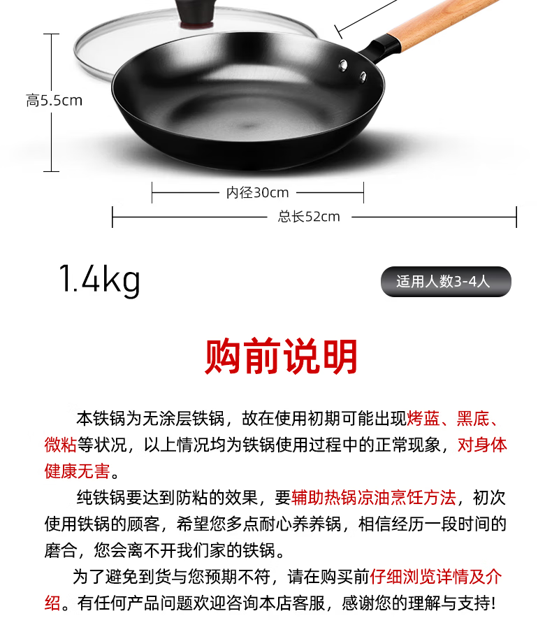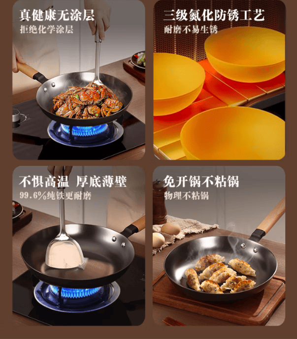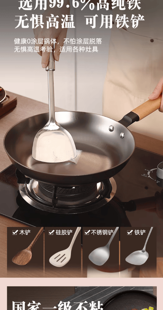 章状元手工铁锅圆底炒锅无涂层炒菜锅燃气灶家用熟铁锅精铁防锈防穿孔 超轻铁锅+盖子铲子 32cm