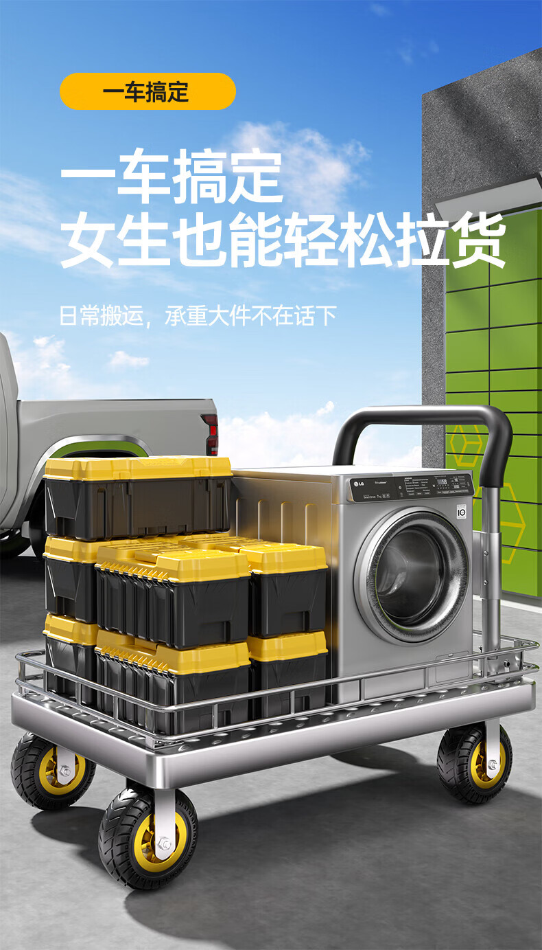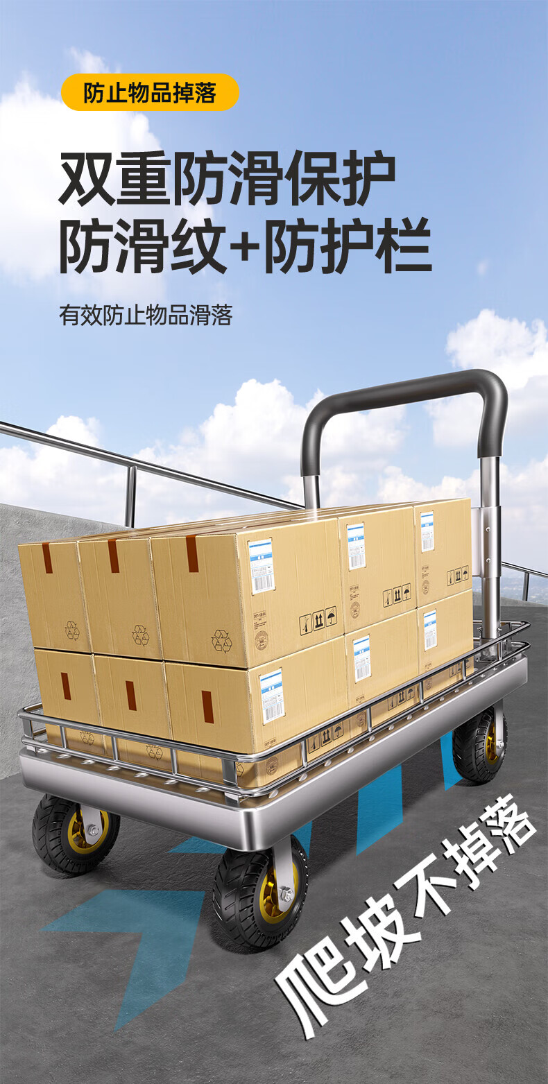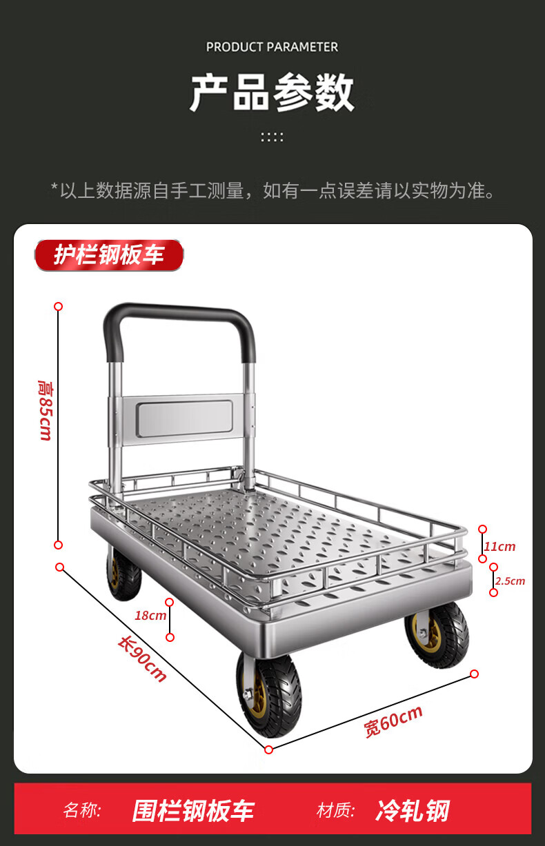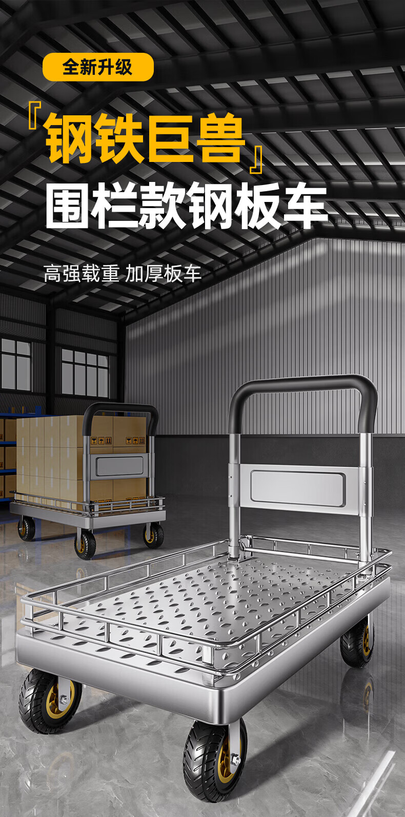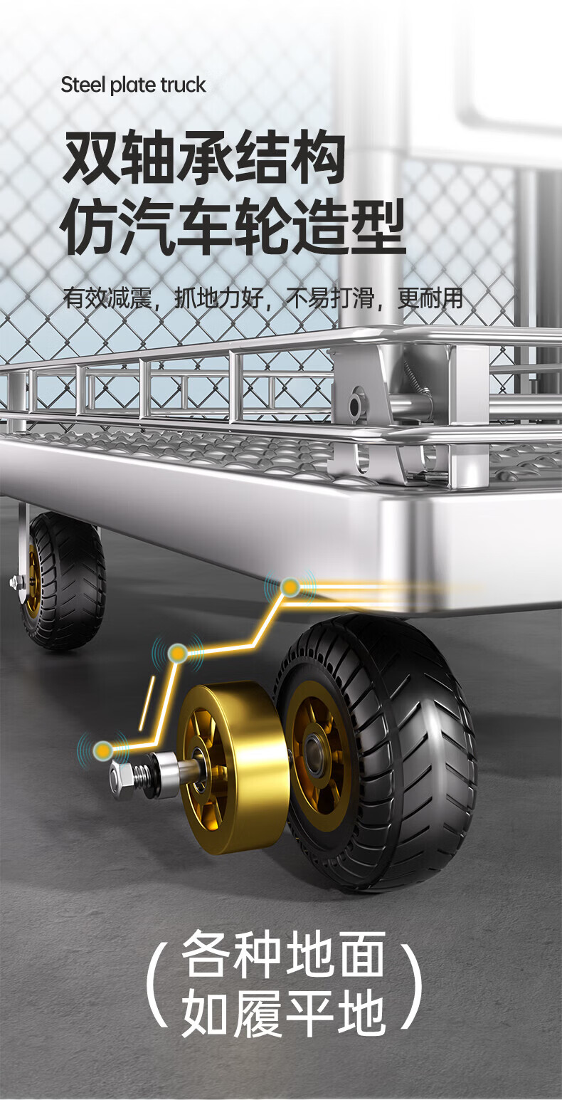 亚伦大力士围栏钢板小推车静音手推车搬运家用平板车便携拖车折叠快递手拉车 特厚钢板【110*65】6寸烽火轮+承重900斤 【护栏强加固-货物不倾倒】