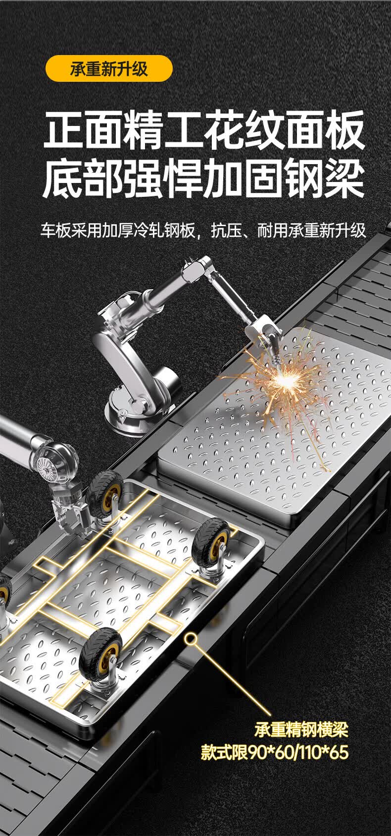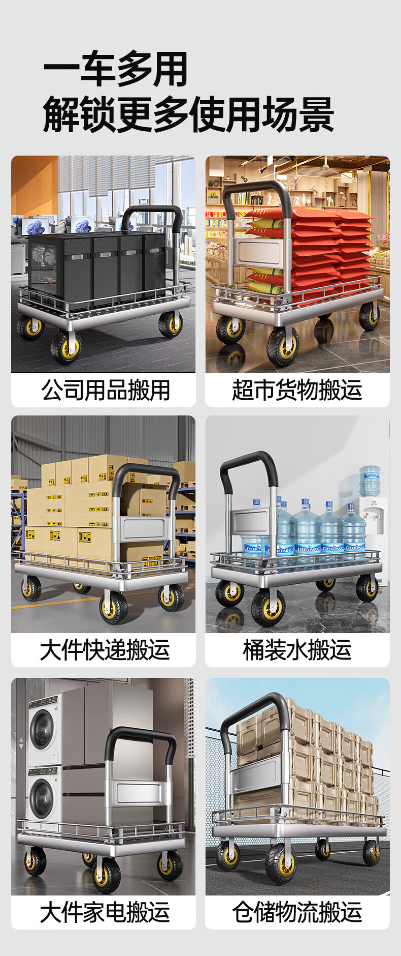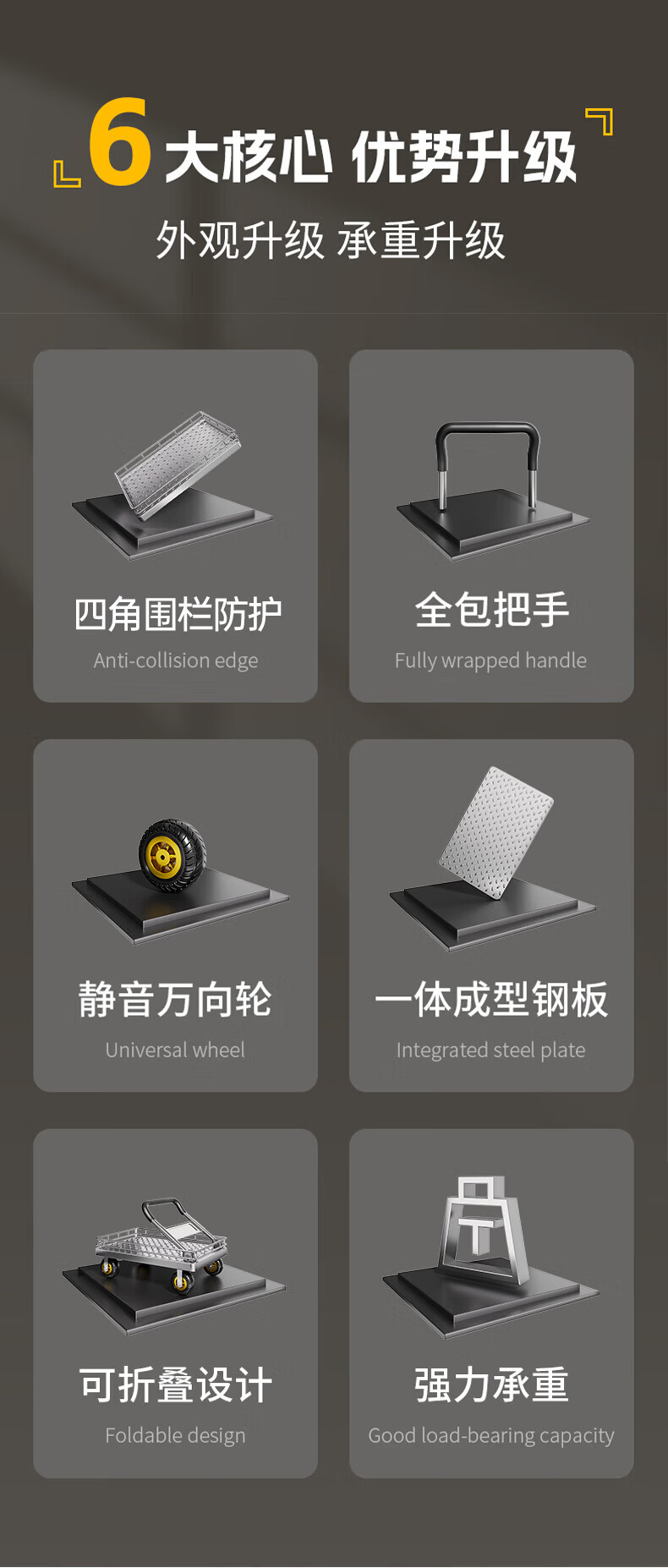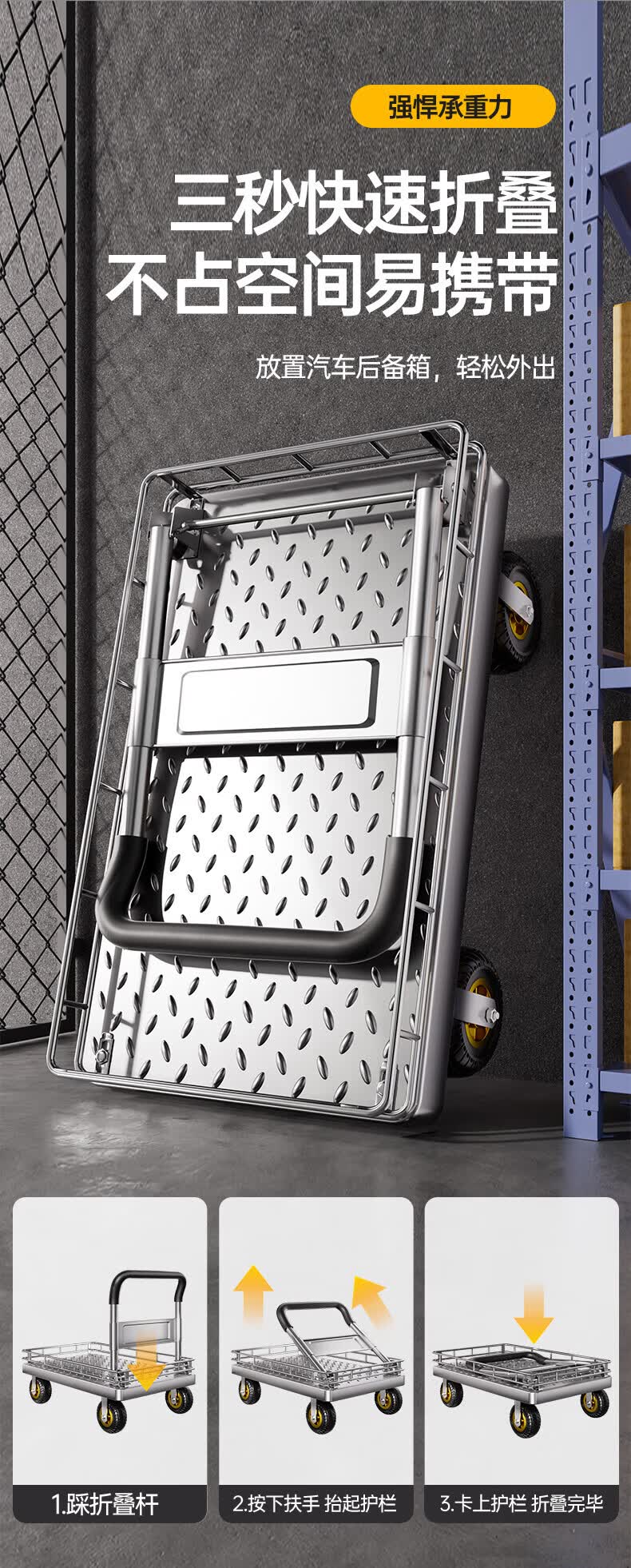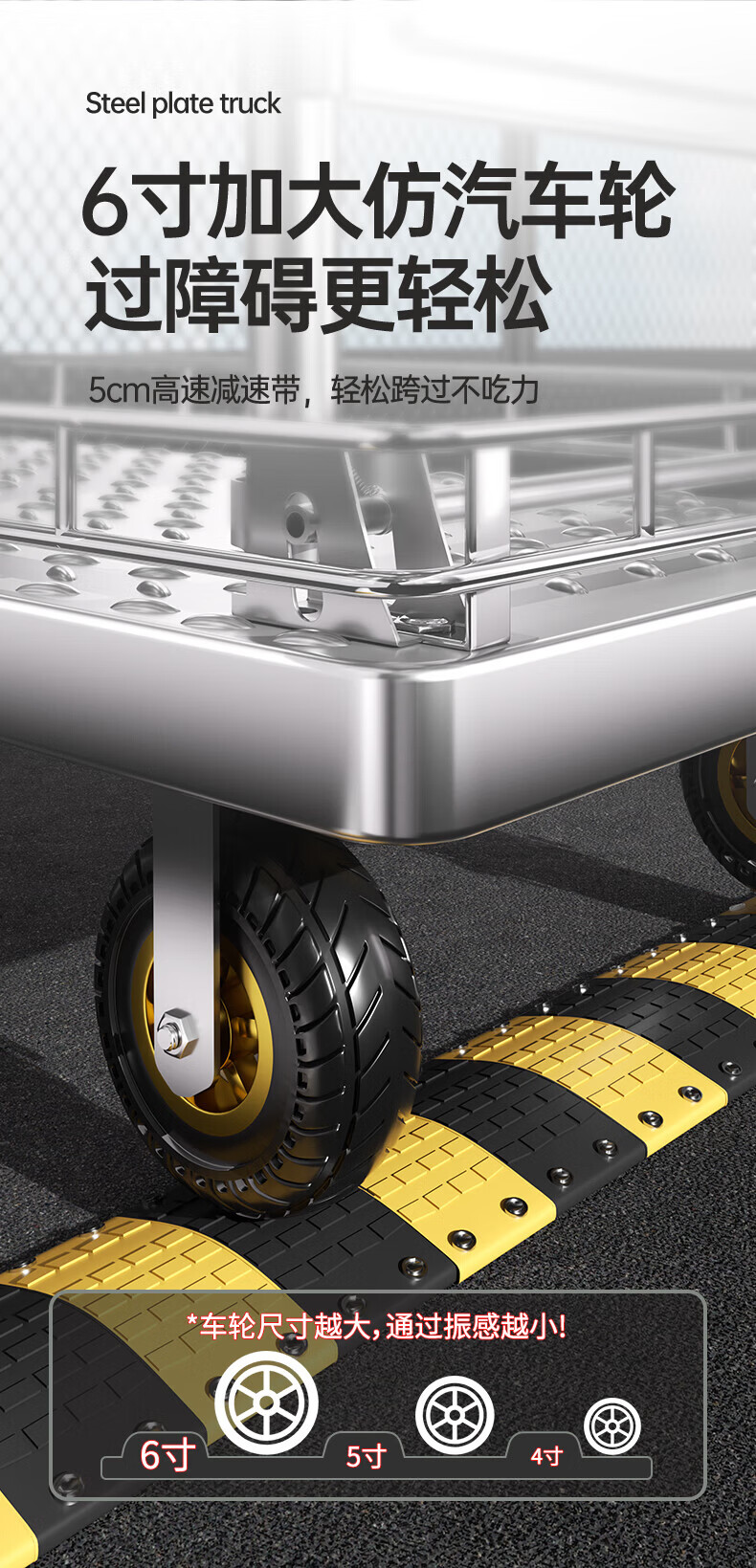 亚伦大力士围栏钢板小推车静音手推车搬运家用平板车便携拖车折叠快递手拉车 特厚钢板【110*65】6寸烽火轮+承重900斤 【护栏强加固-货物不倾倒】