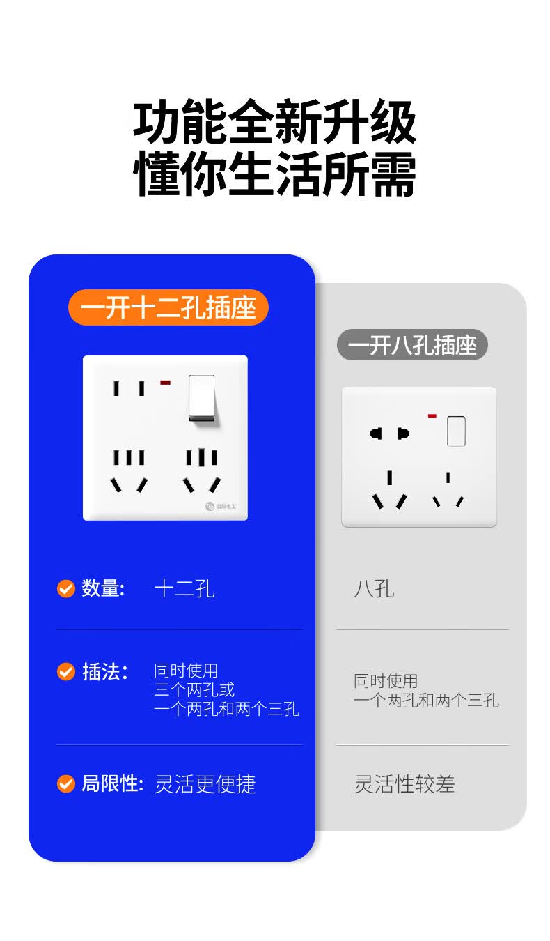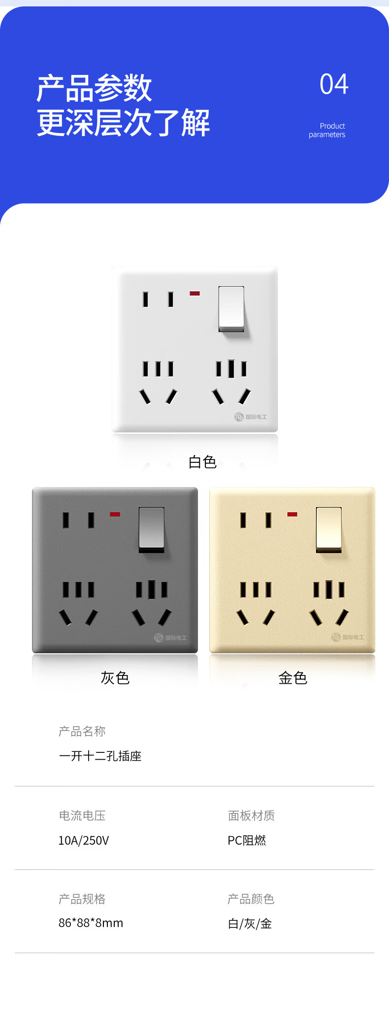 国际电工明装86型16A一开十二孔10A多八孔厨房空调墙壁明线插座面板带开关 一开十二孔+明盒【白色】
