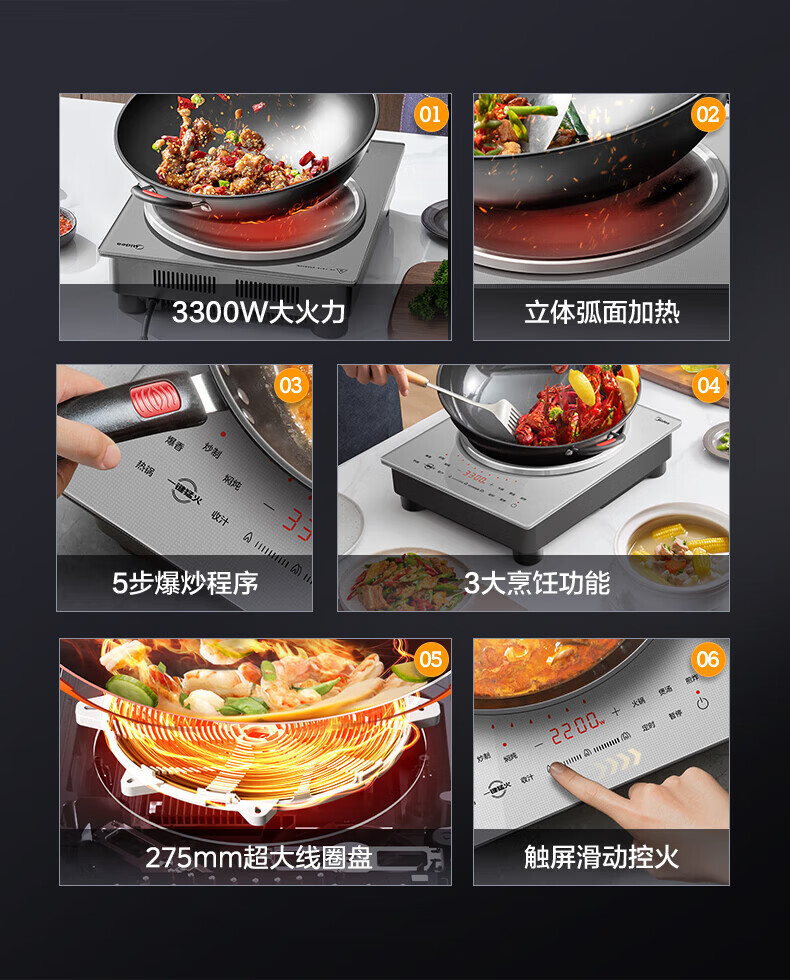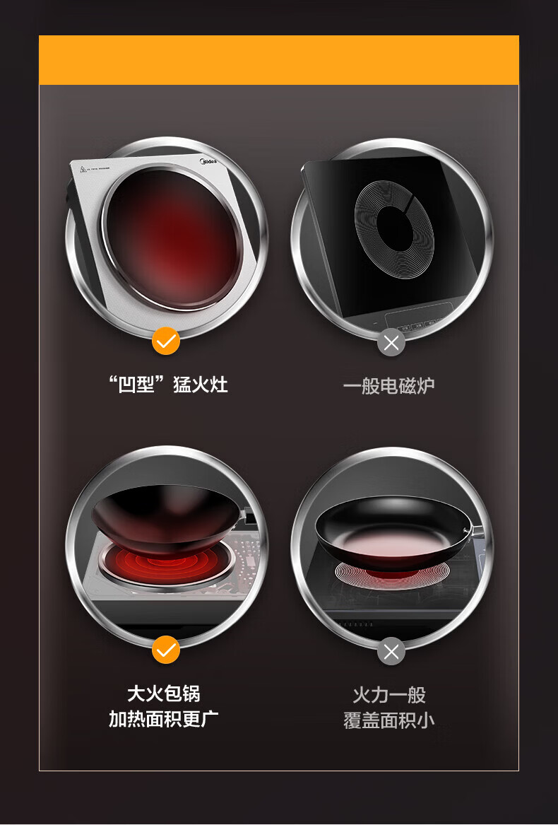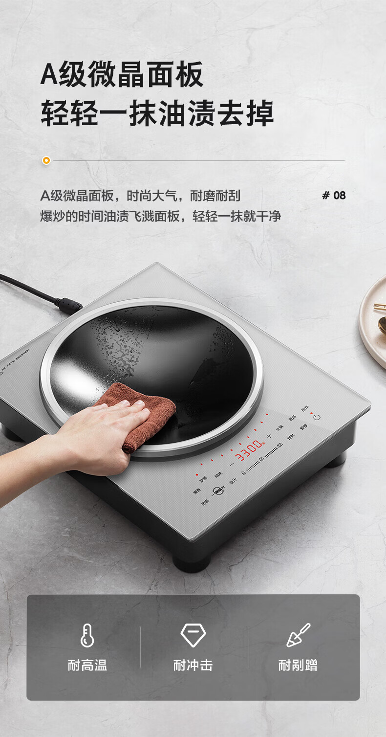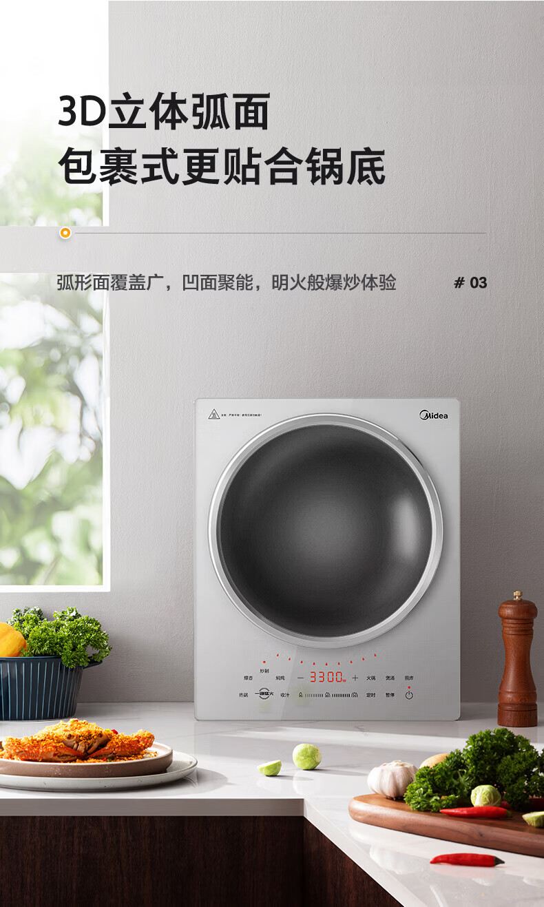 美的(Midea)凹面电磁炉 家用3500W大功率多功能大面板电陶炉电磁灶火锅炉烧水炒菜锅智能预约定时速热炒锅一体 【银色裸机款】3300W/3500W+凹灶