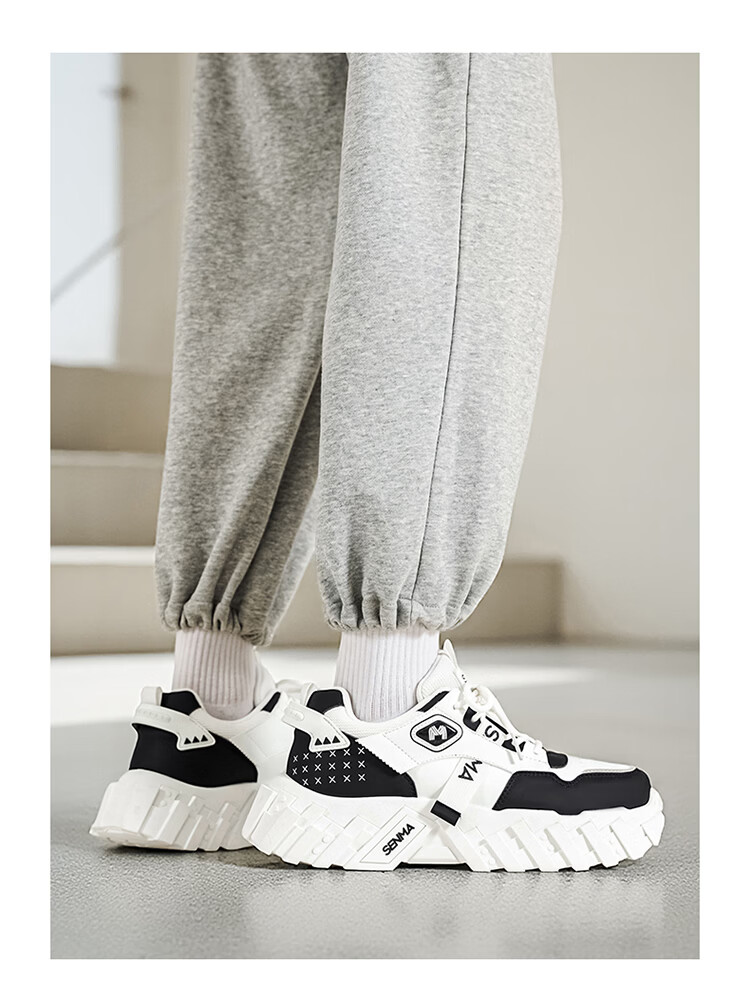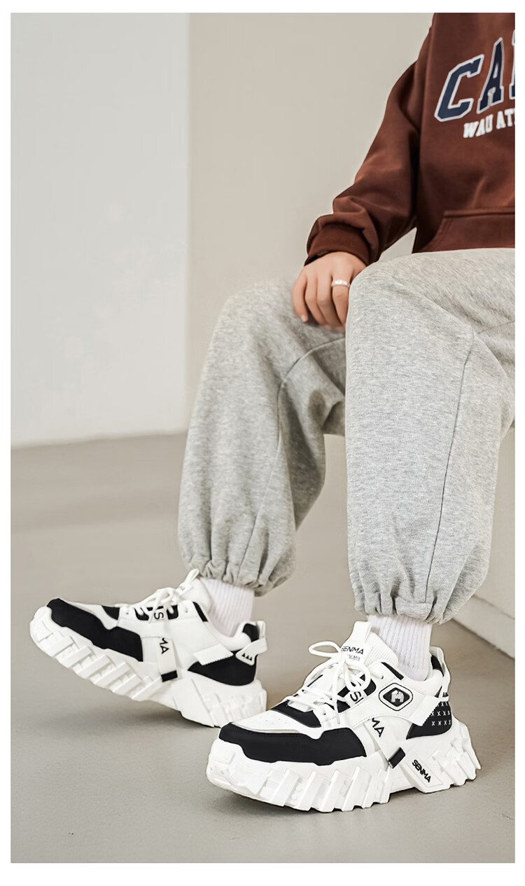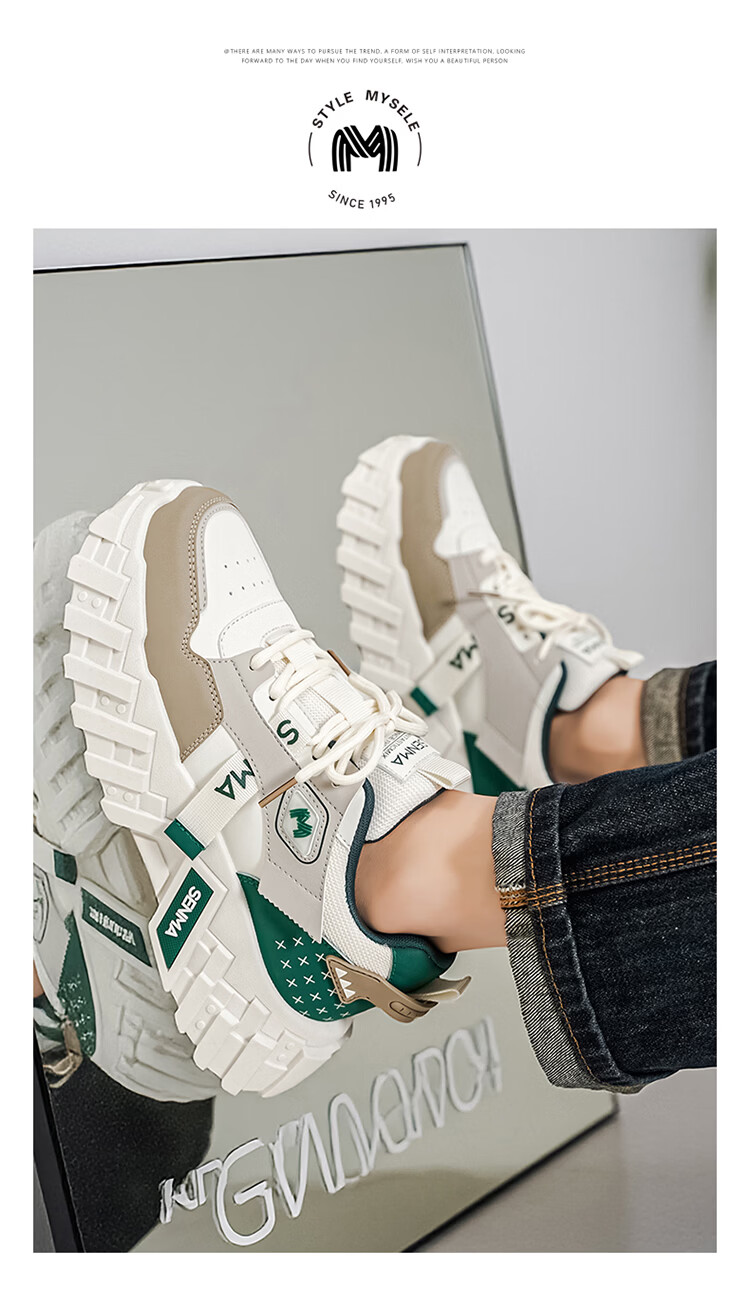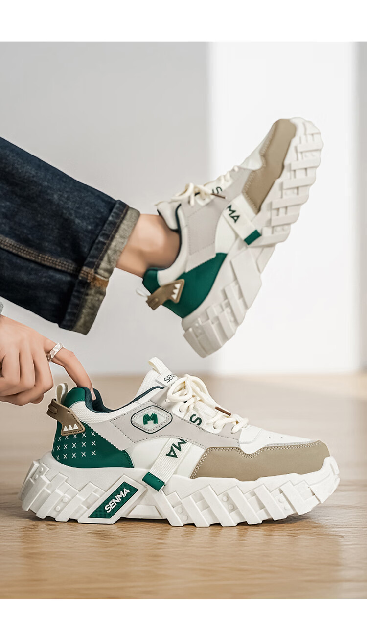 森馬网红爆款男鞋2026春季运动休闲跑步鞋男士厚底增高皮面百搭老爹鞋 白绿【基础款】 39 标准码数/现货秒发