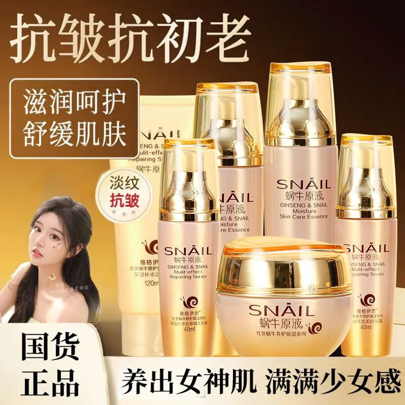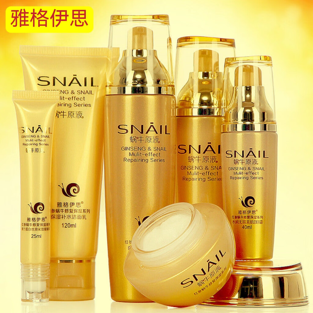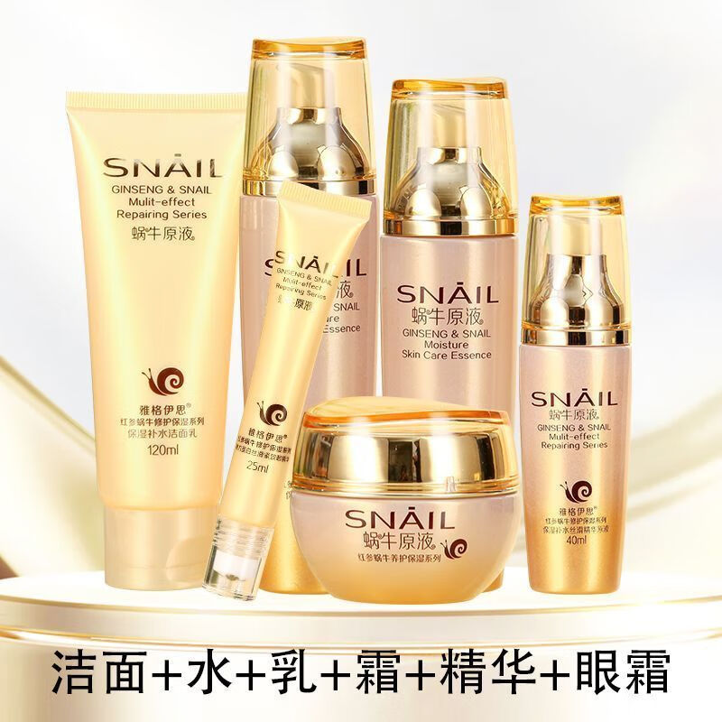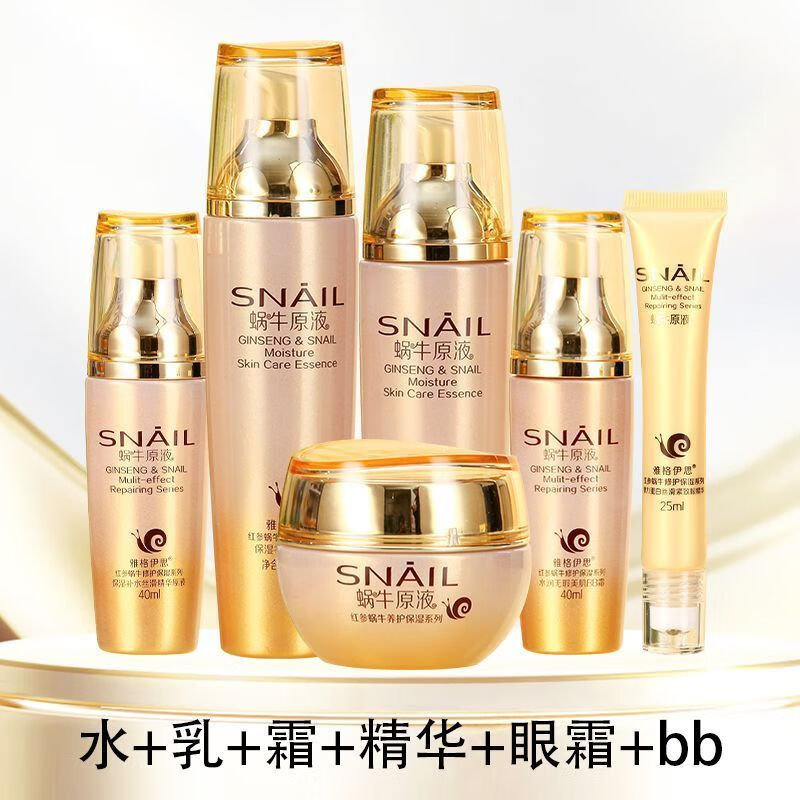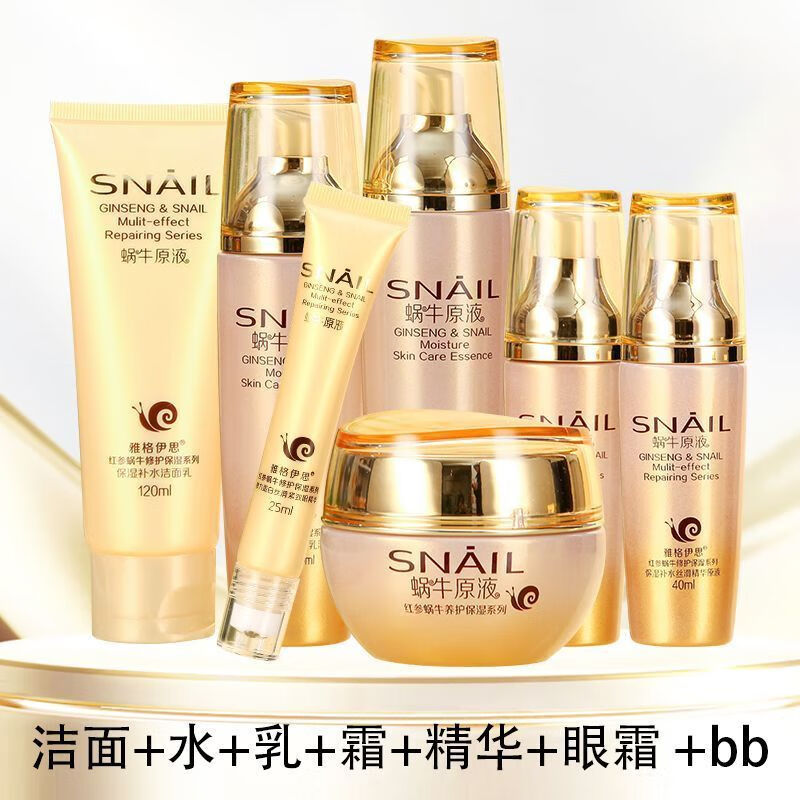 雅格伊思红参蜗牛原液精华护肤品水乳套装清爽保湿补水化妆品美妆女修护 5件套 面奶+水+乳+霜+BB+送面膜