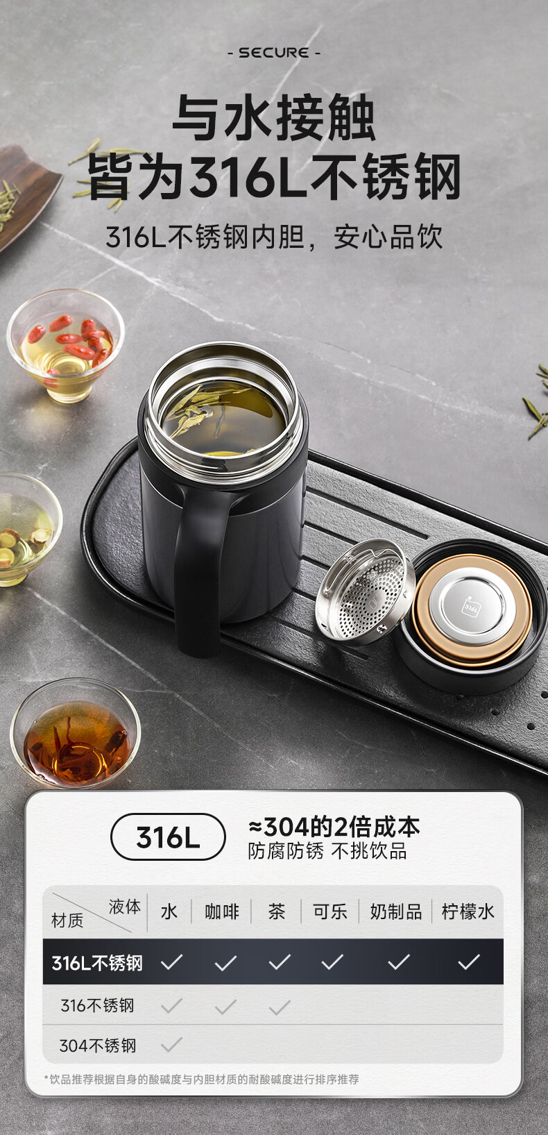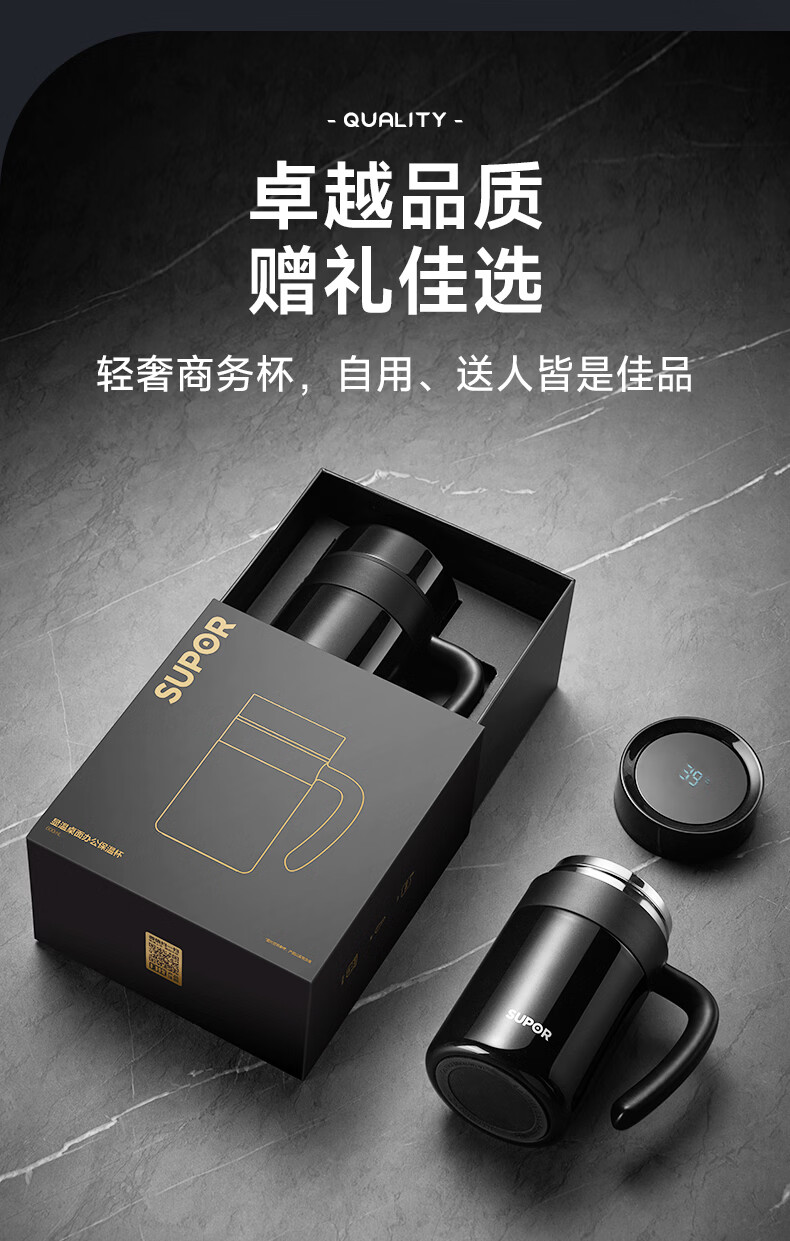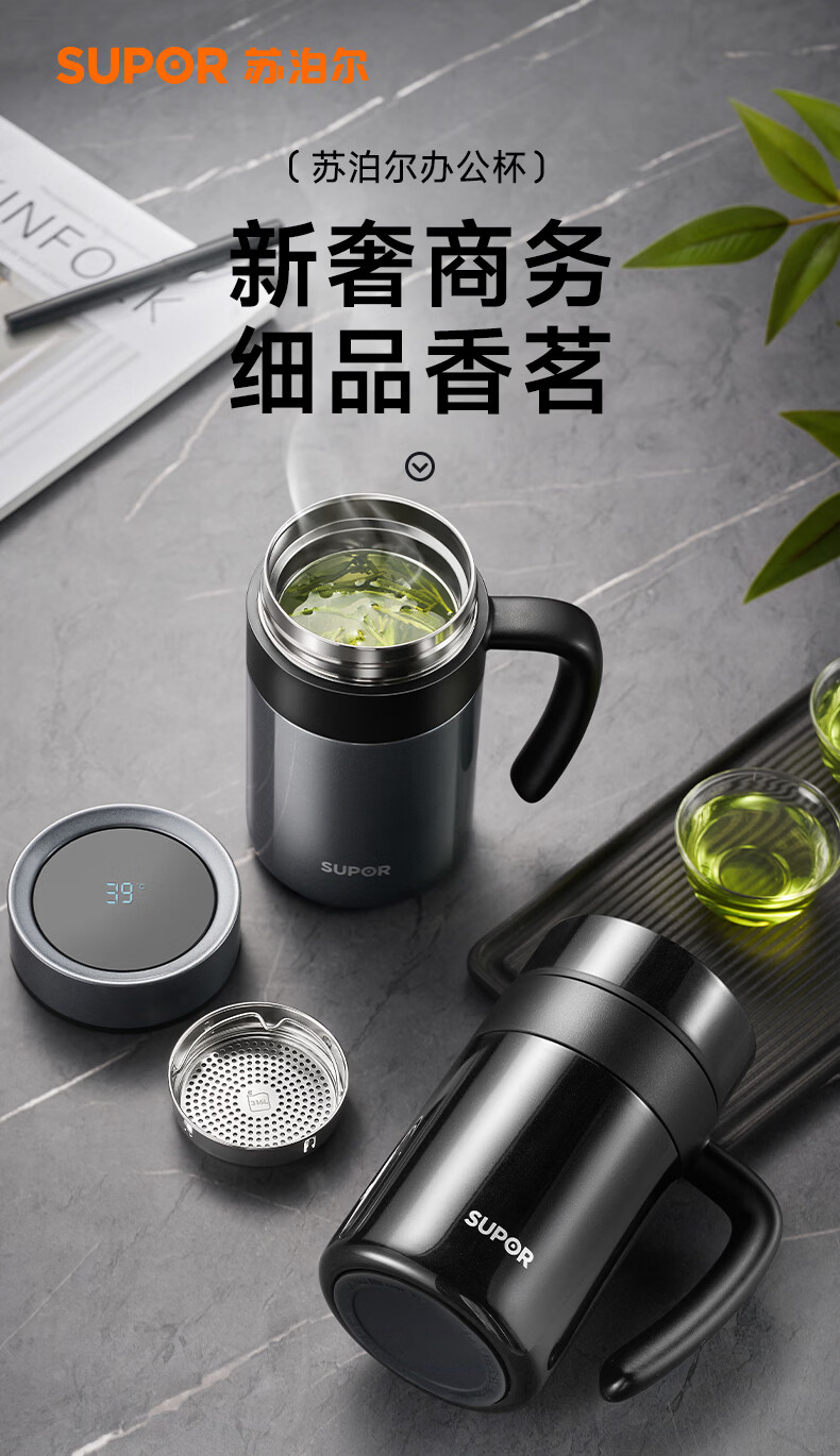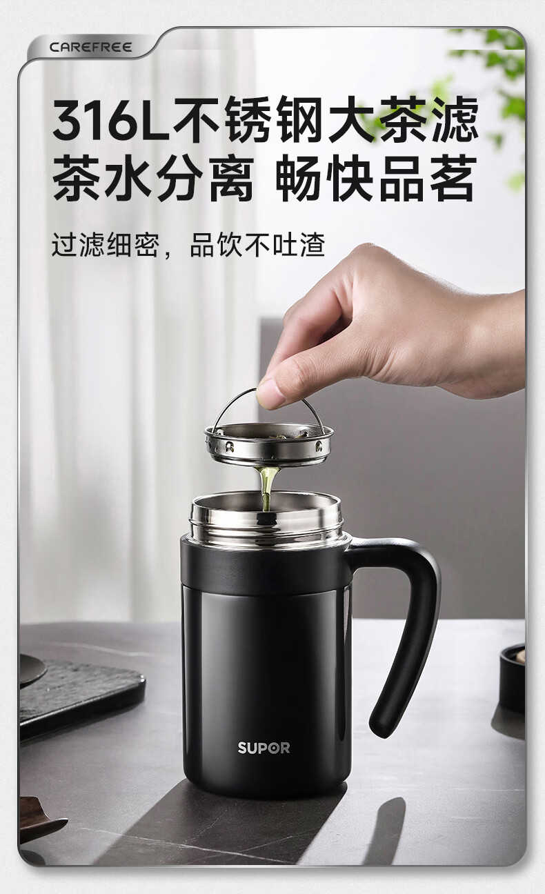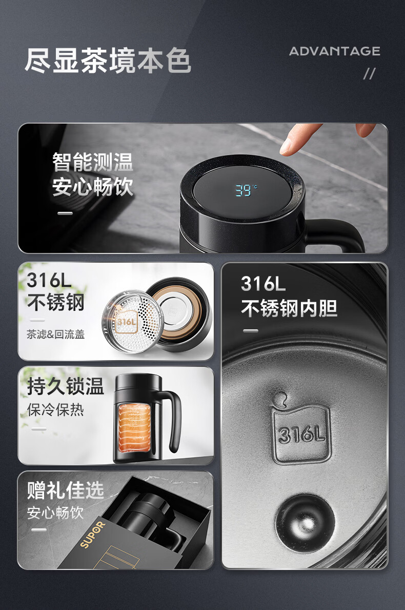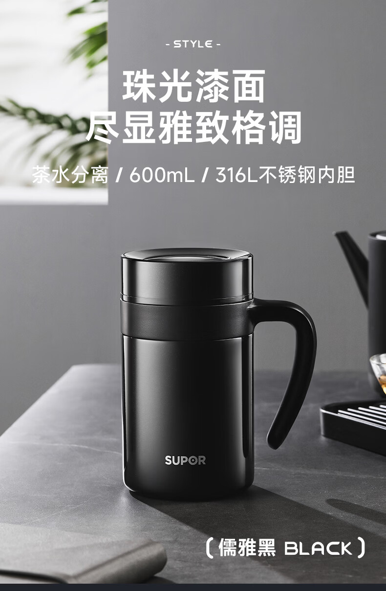 苏泊尔(SUPOR)保温杯男士桌面不锈钢办公室泡茶水杯子大容量定制长辈礼物伴手礼 儒雅黑600ml【316L不锈钢】