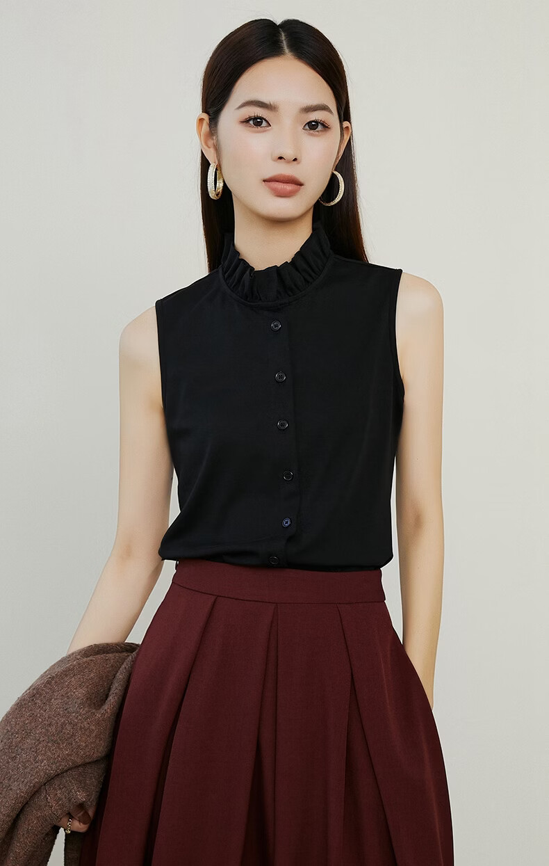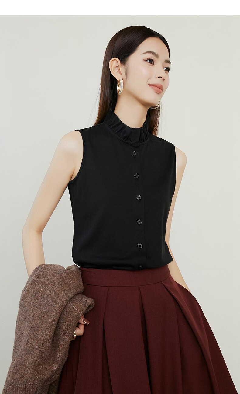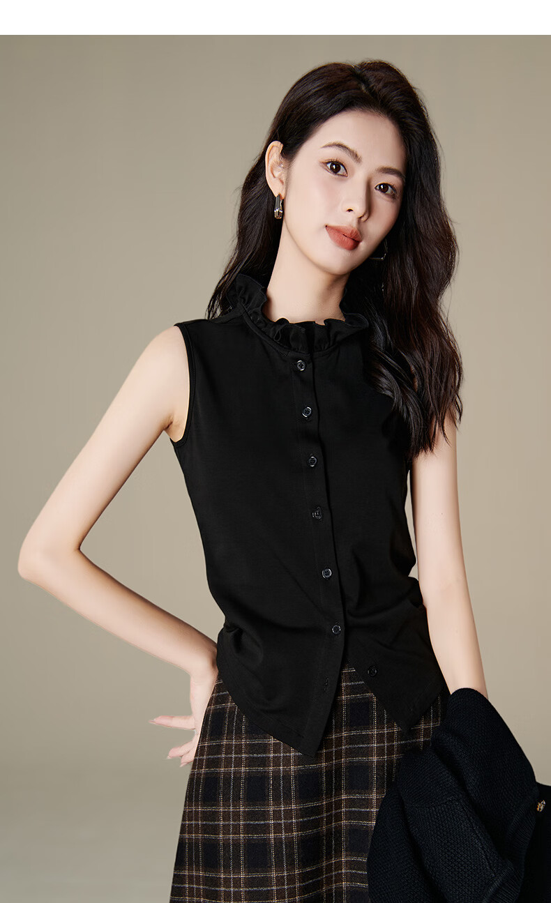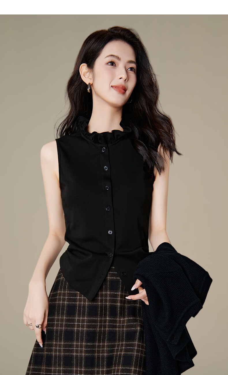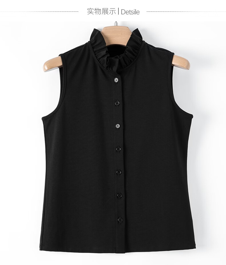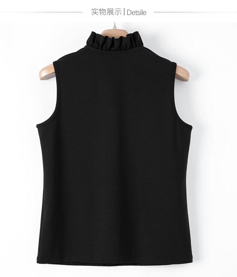 晚白【新品】2026年春款时尚立领棉料上衣亲肤舒适叠穿打底无袖衬衫女 黑色 M