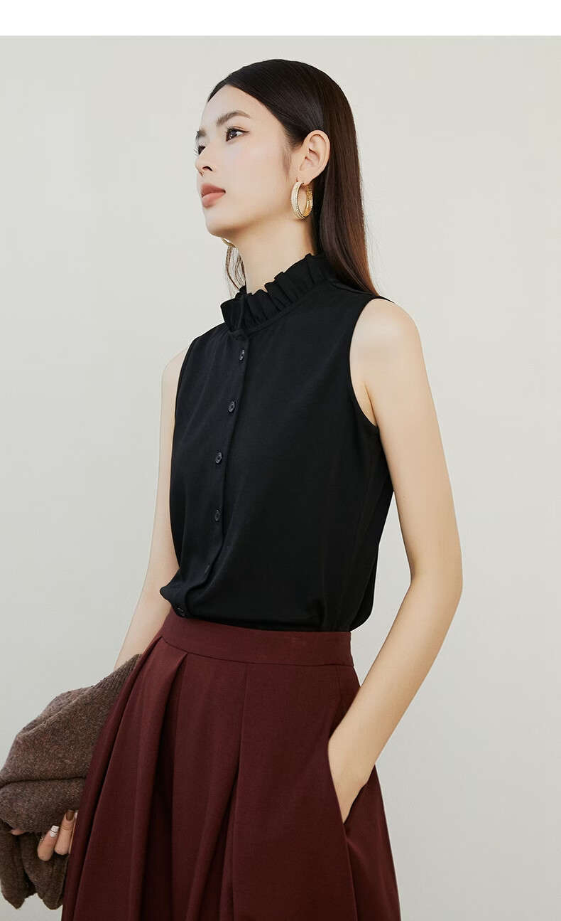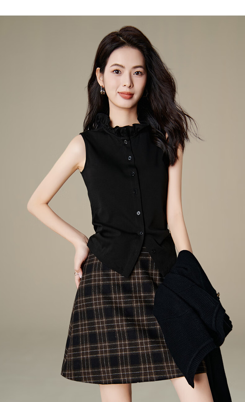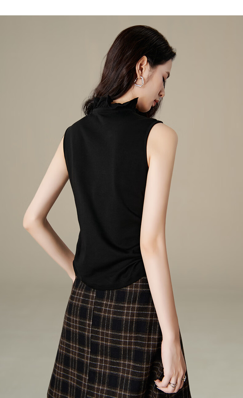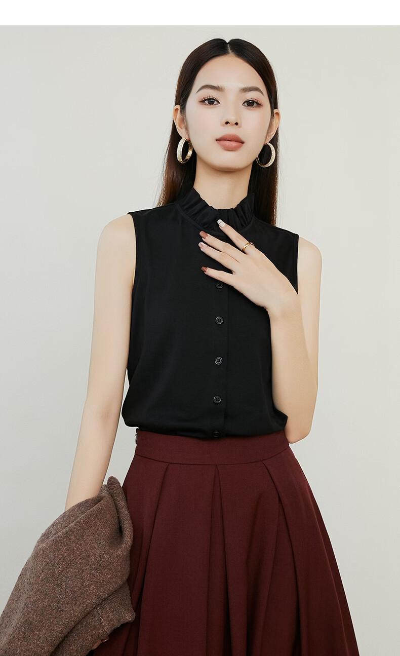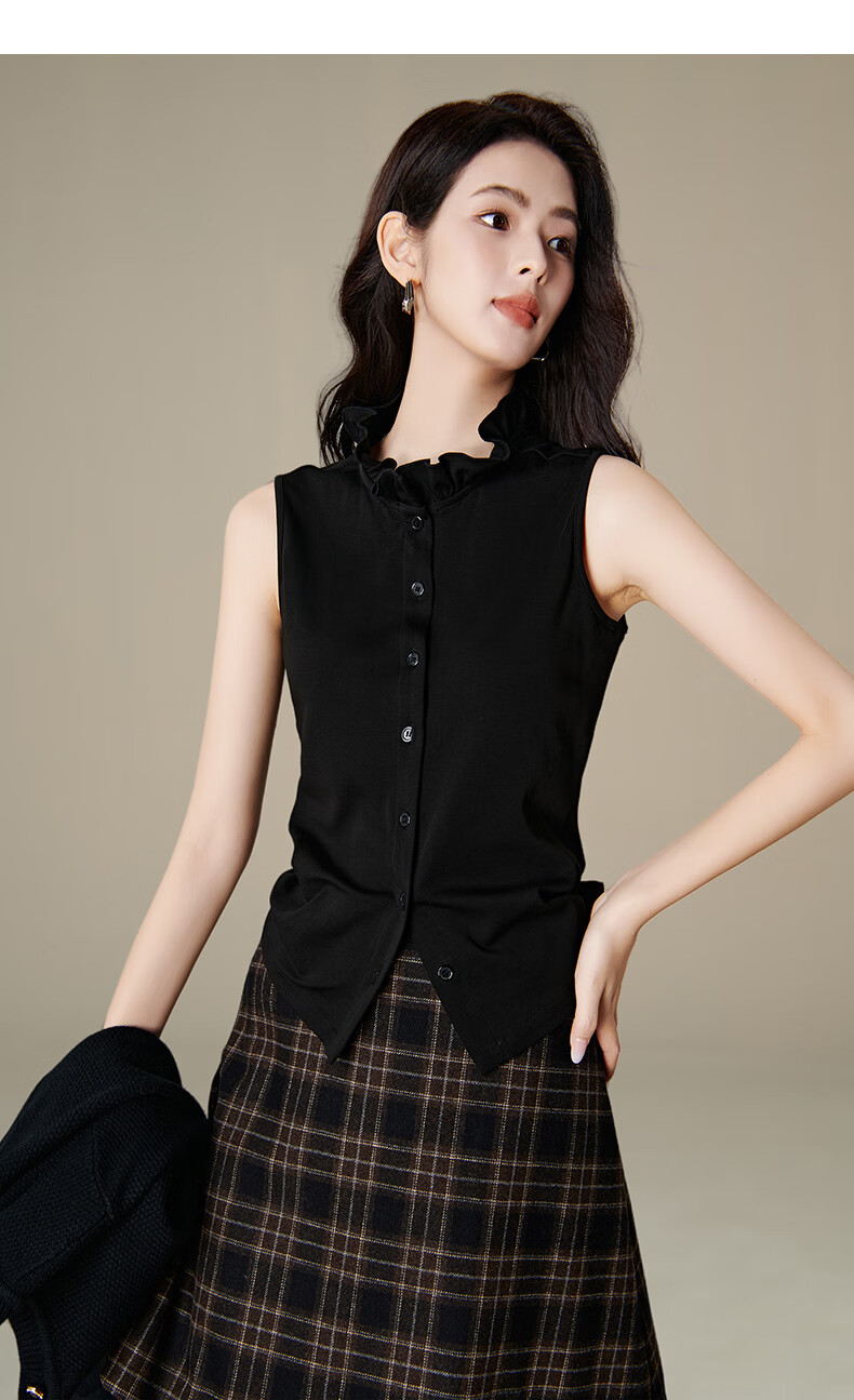 晚白【新品】2026年春款时尚立领棉料上衣亲肤舒适叠穿打底无袖衬衫女 黑色 M