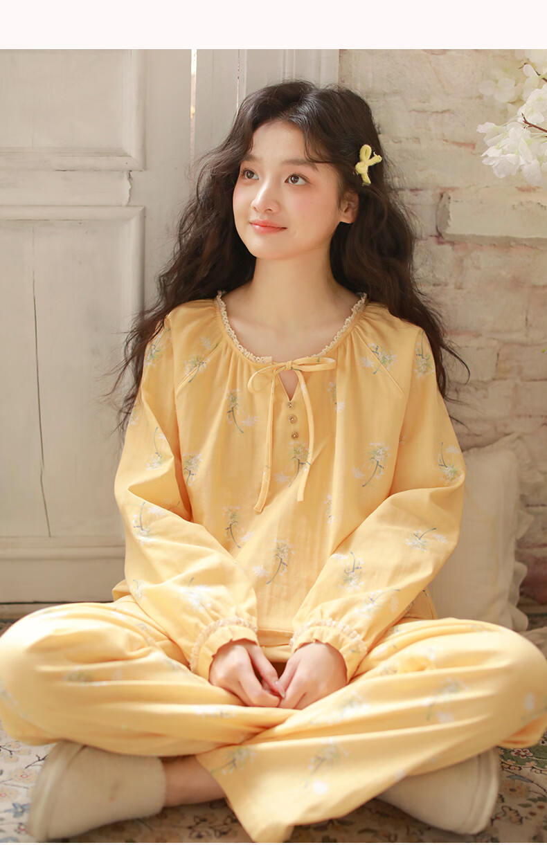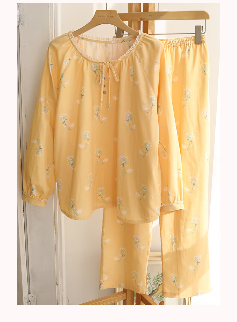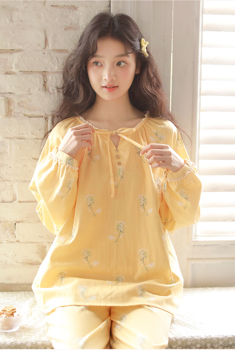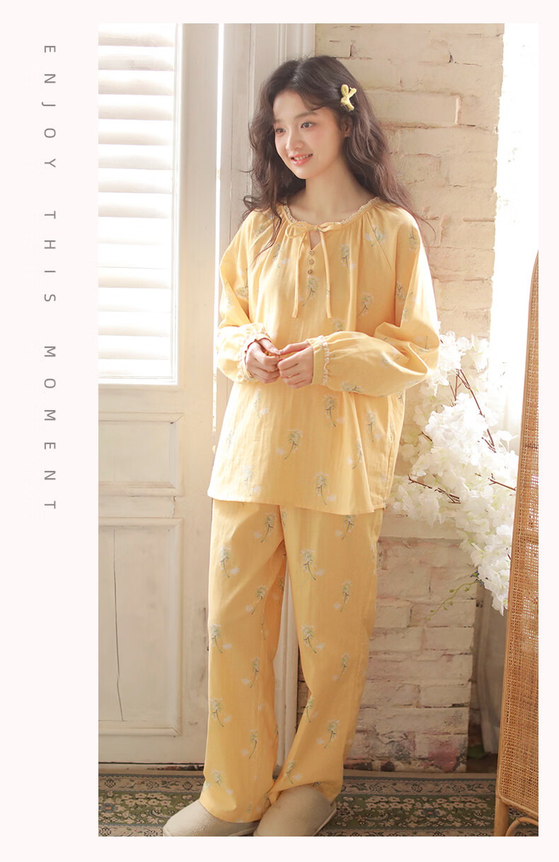 蔓秋 MEJU《蒲公英》圆领长袖女士家居服套装 黄色 M 110斤以内