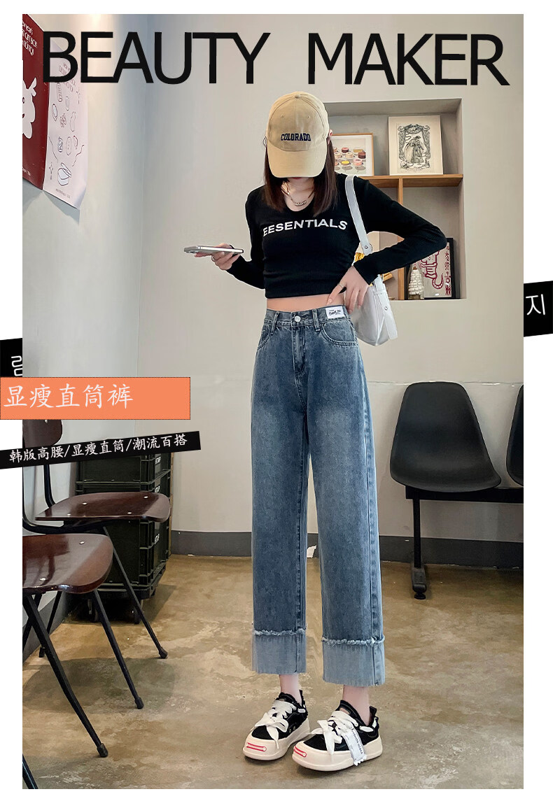 MODX直筒牛仔裤女2026年春秋薄款卷边松紧腰烟管裤150八分九分小个子 蓝色【八分】 XS