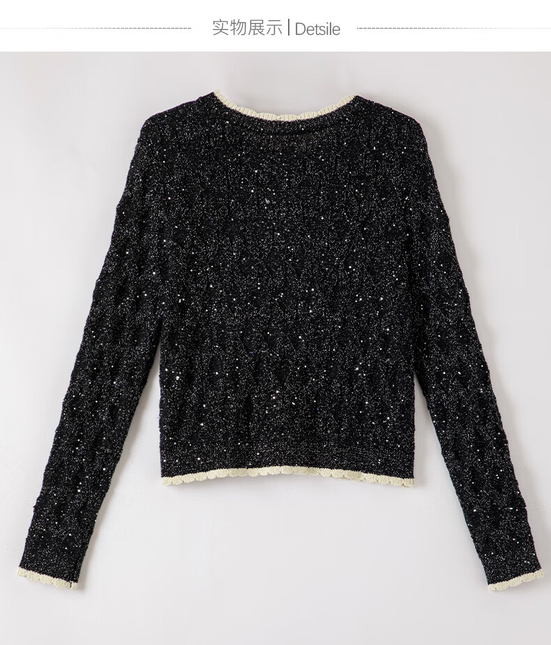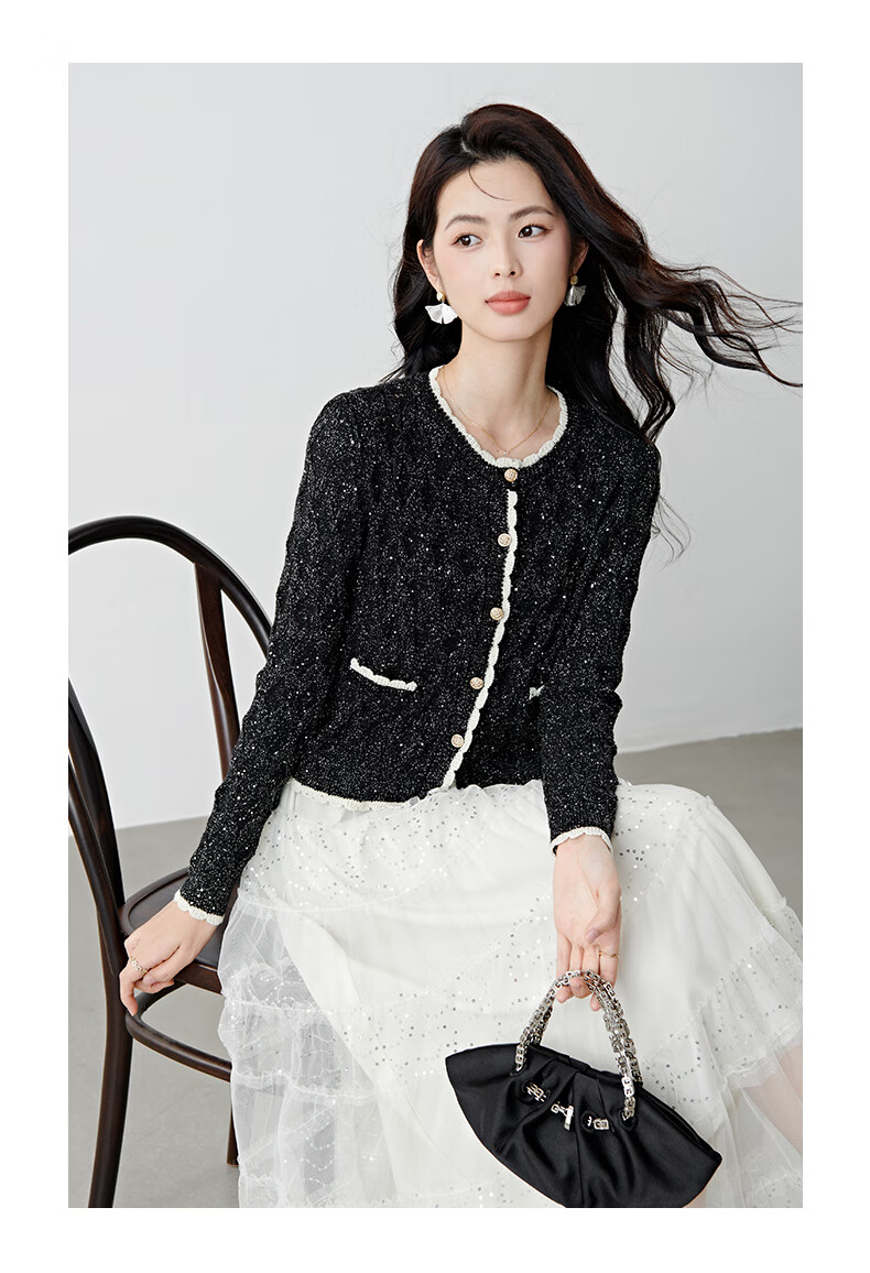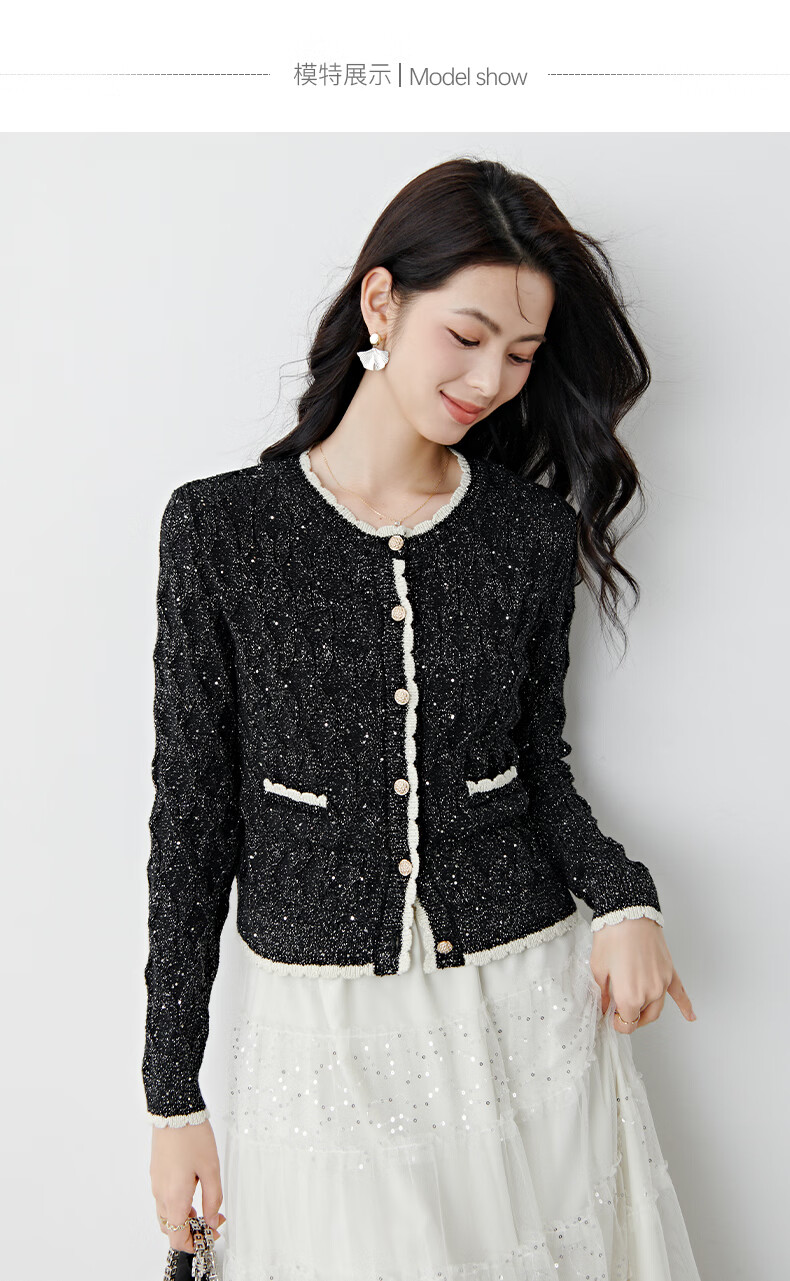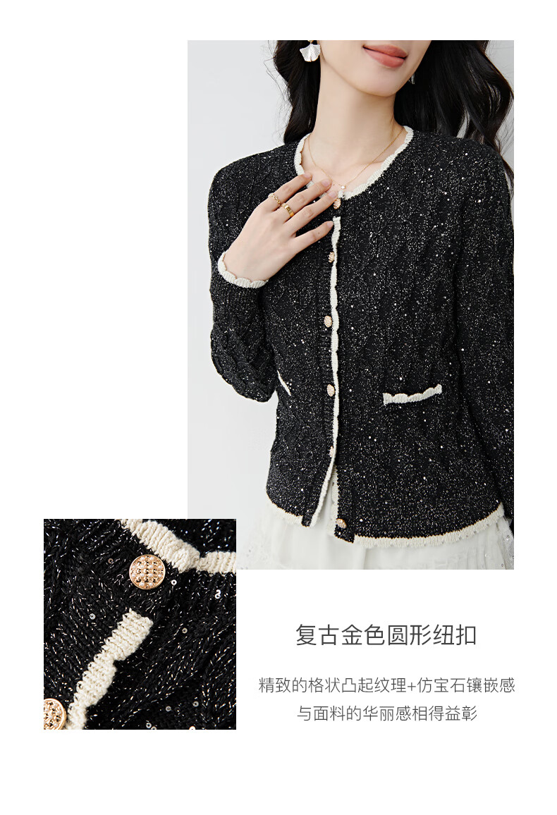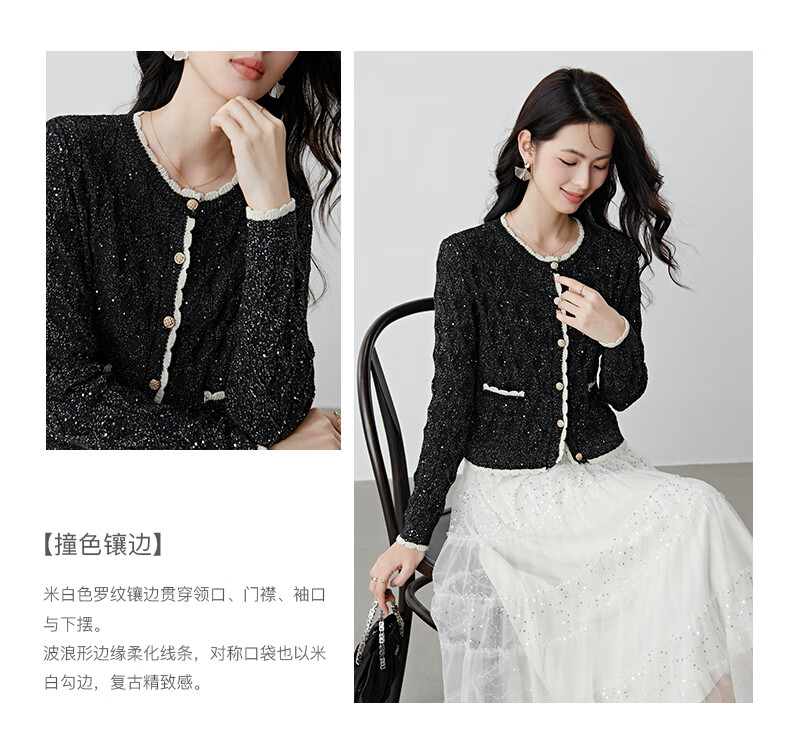 晚白2026春款亮闪闪星河系列重工甄奢撞色花边上衣气质小香风针织外套 黑色 M