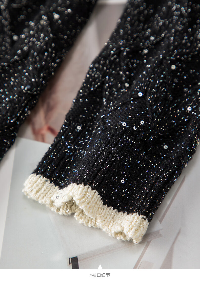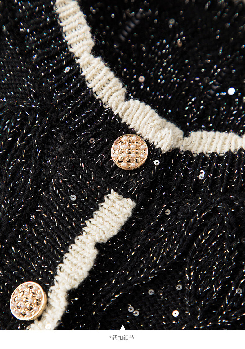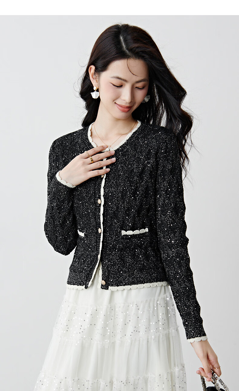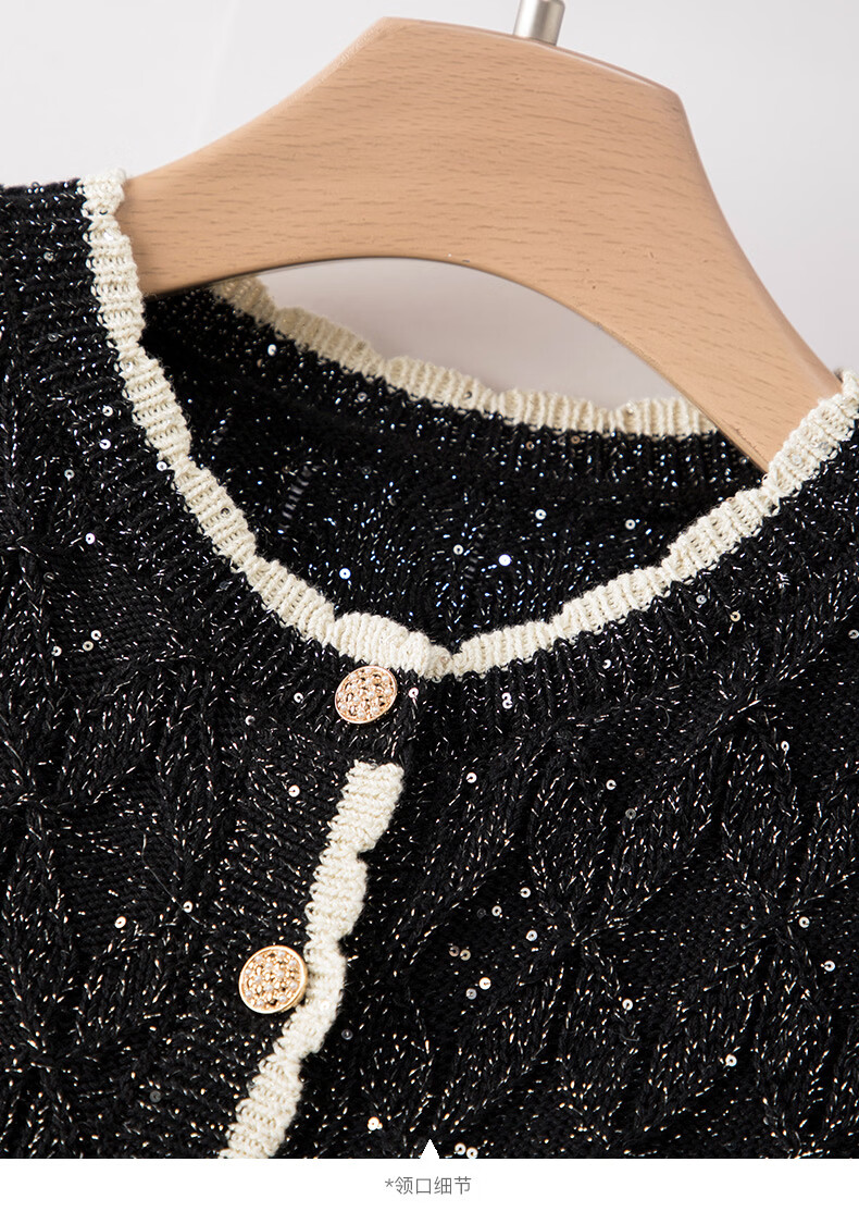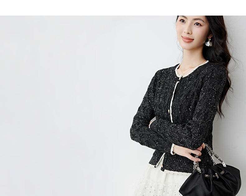 晚白2026春款亮闪闪星河系列重工甄奢撞色花边上衣气质小香风针织外套 黑色 M