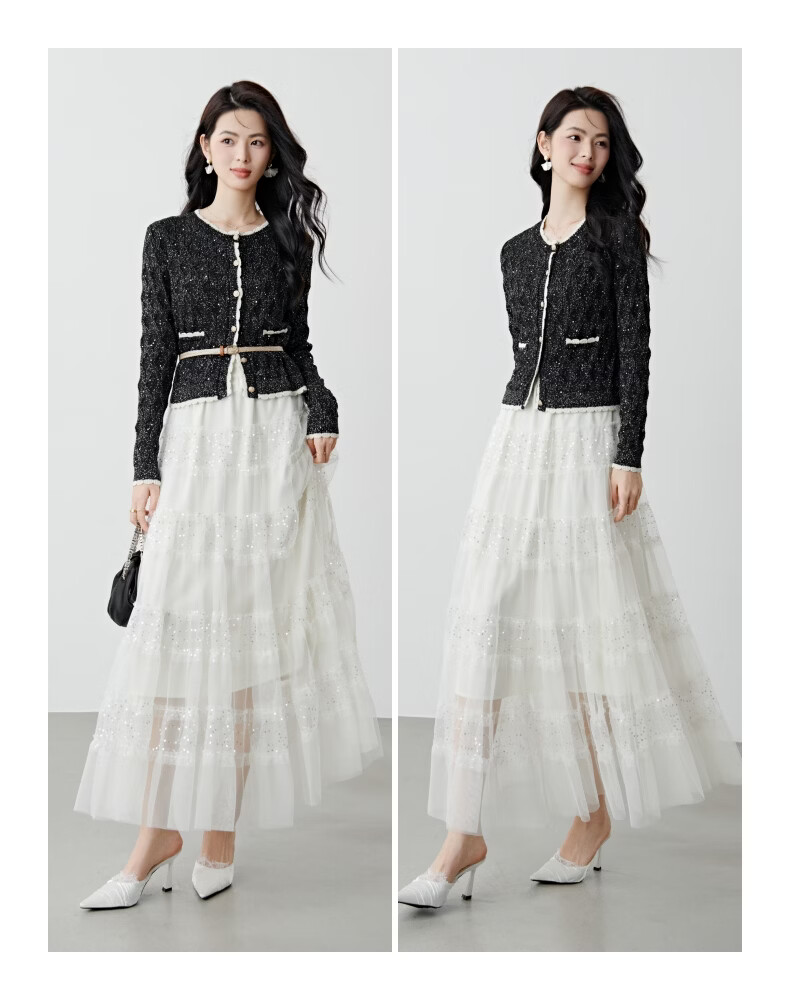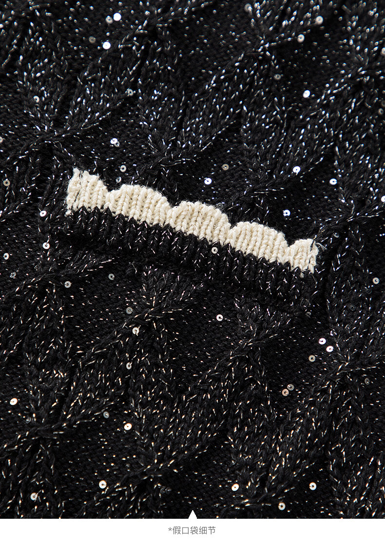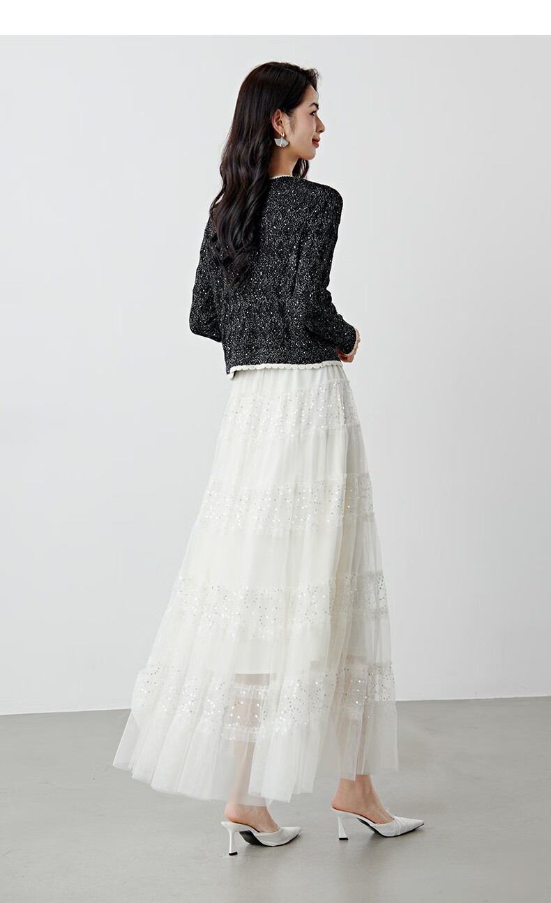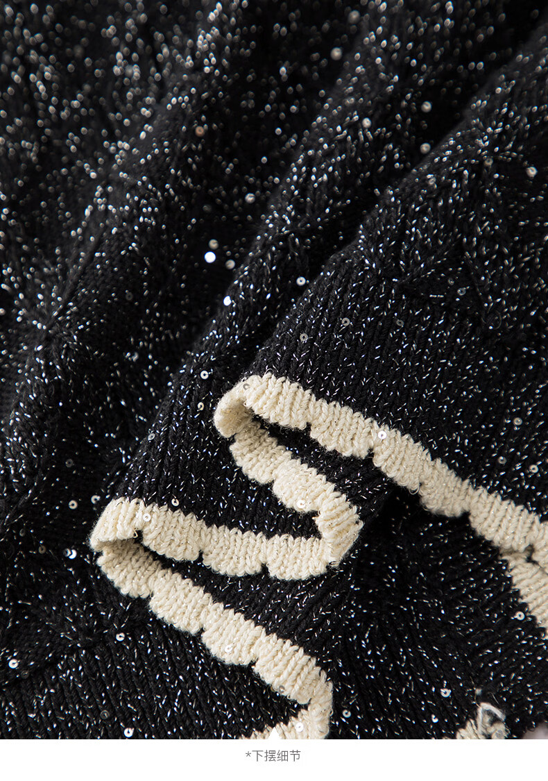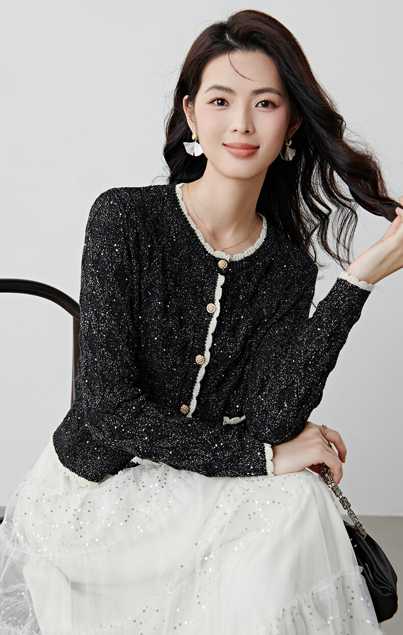 晚白2026春款亮闪闪星河系列重工甄奢撞色花边上衣气质小香风针织外套 黑色 M