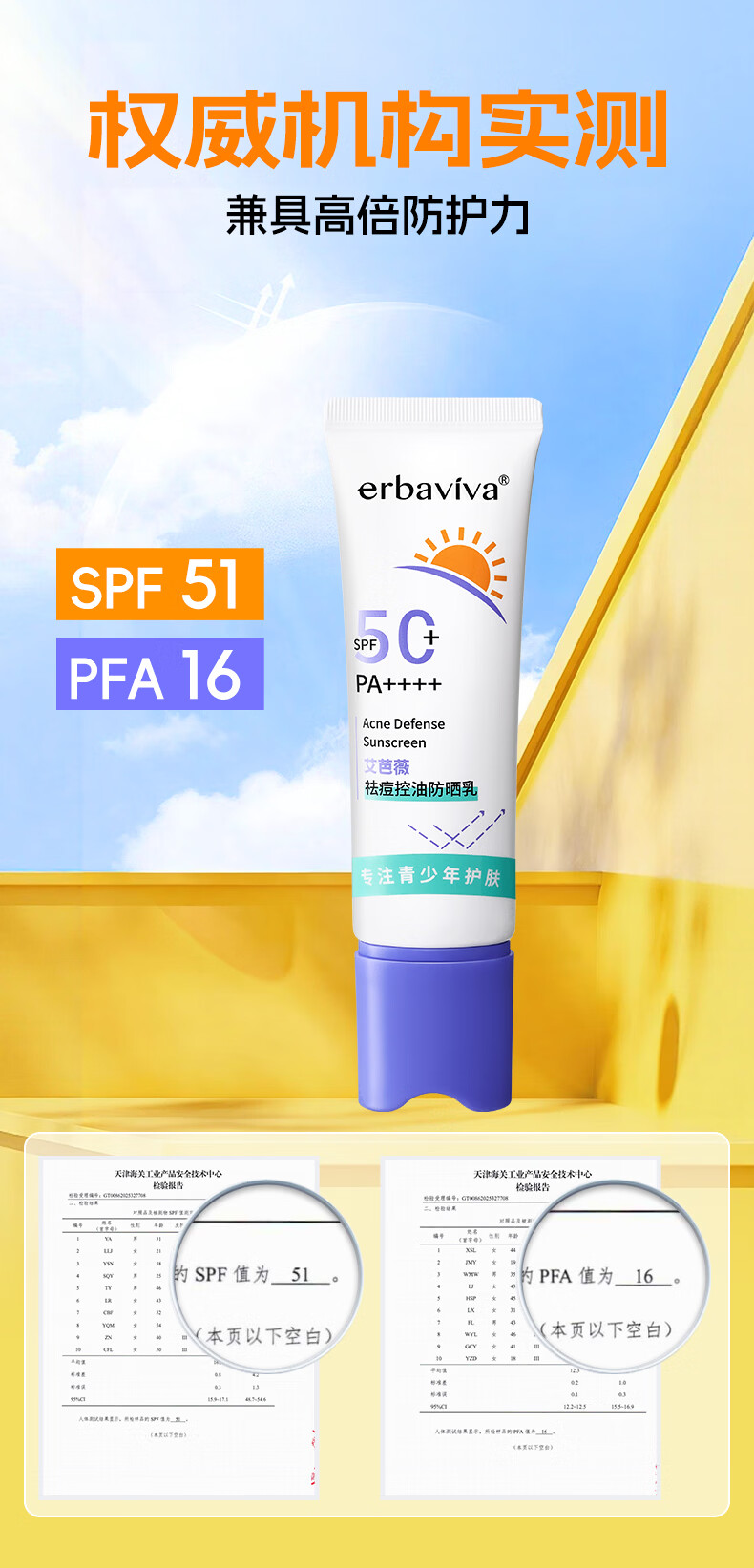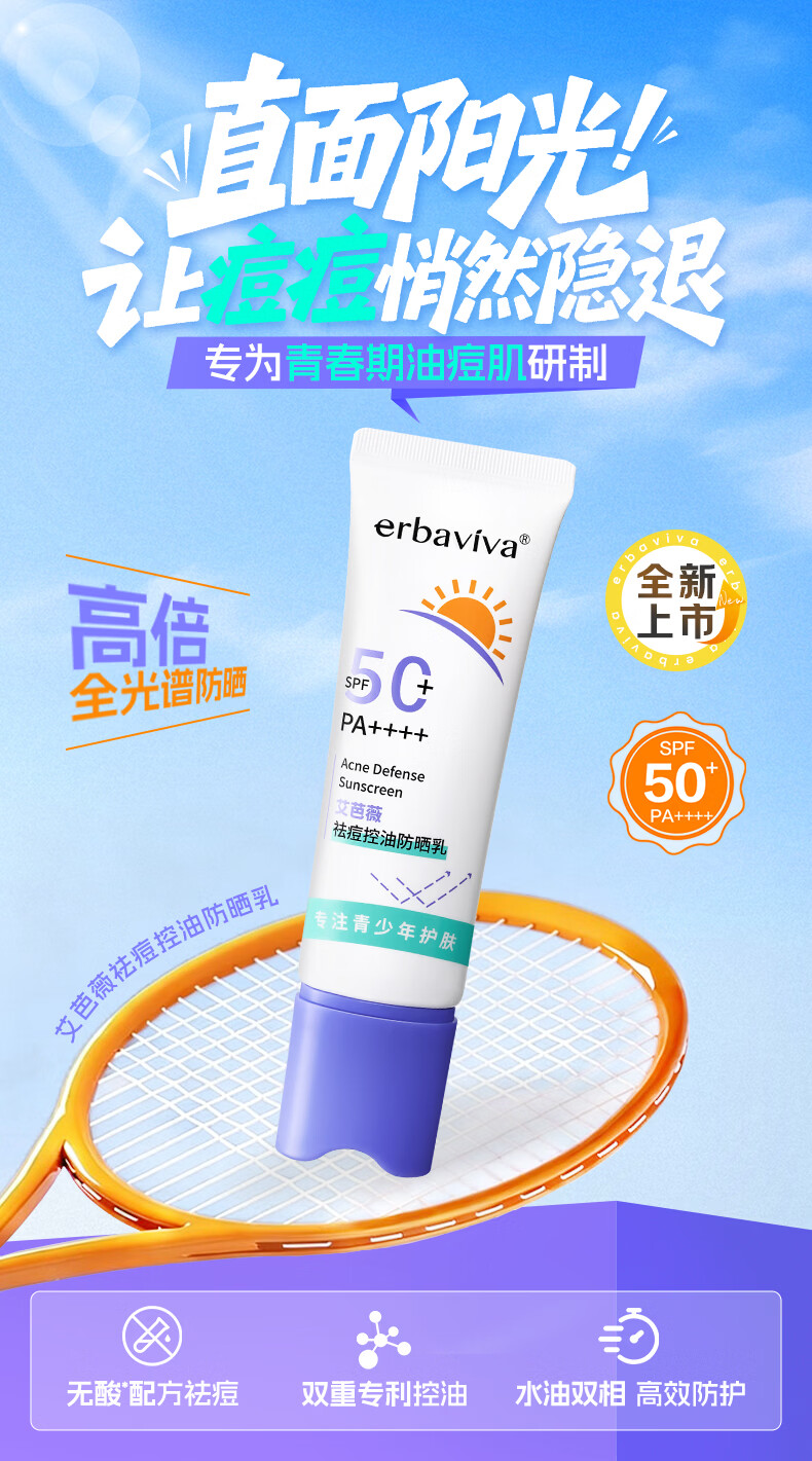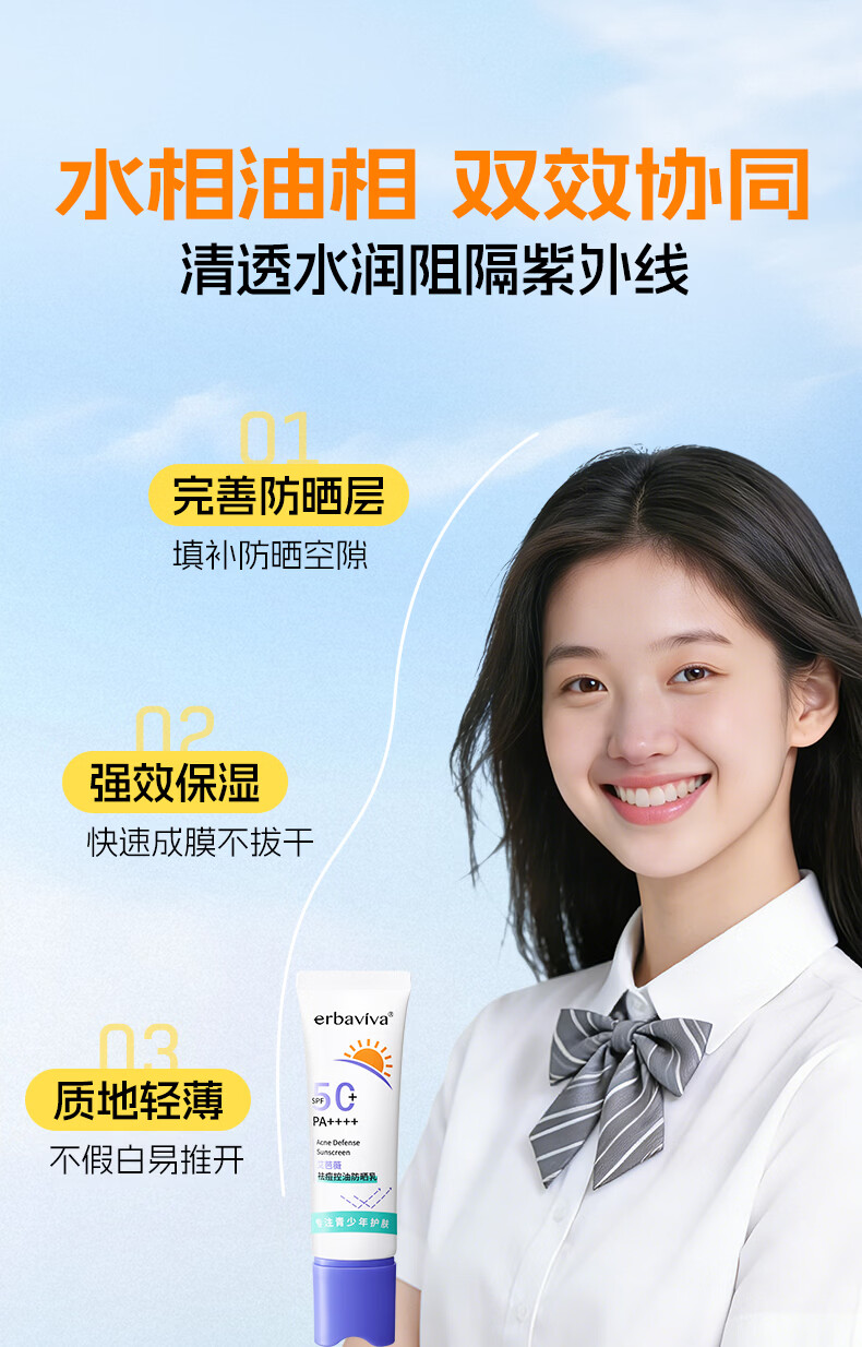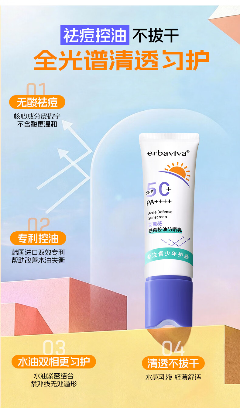 艾芭薇青少年祛痘防晒 控油保湿舒缓祛痘清透不拔干 初高中学生痘肌适用 50ml