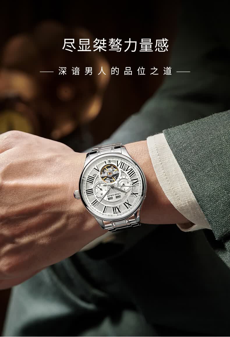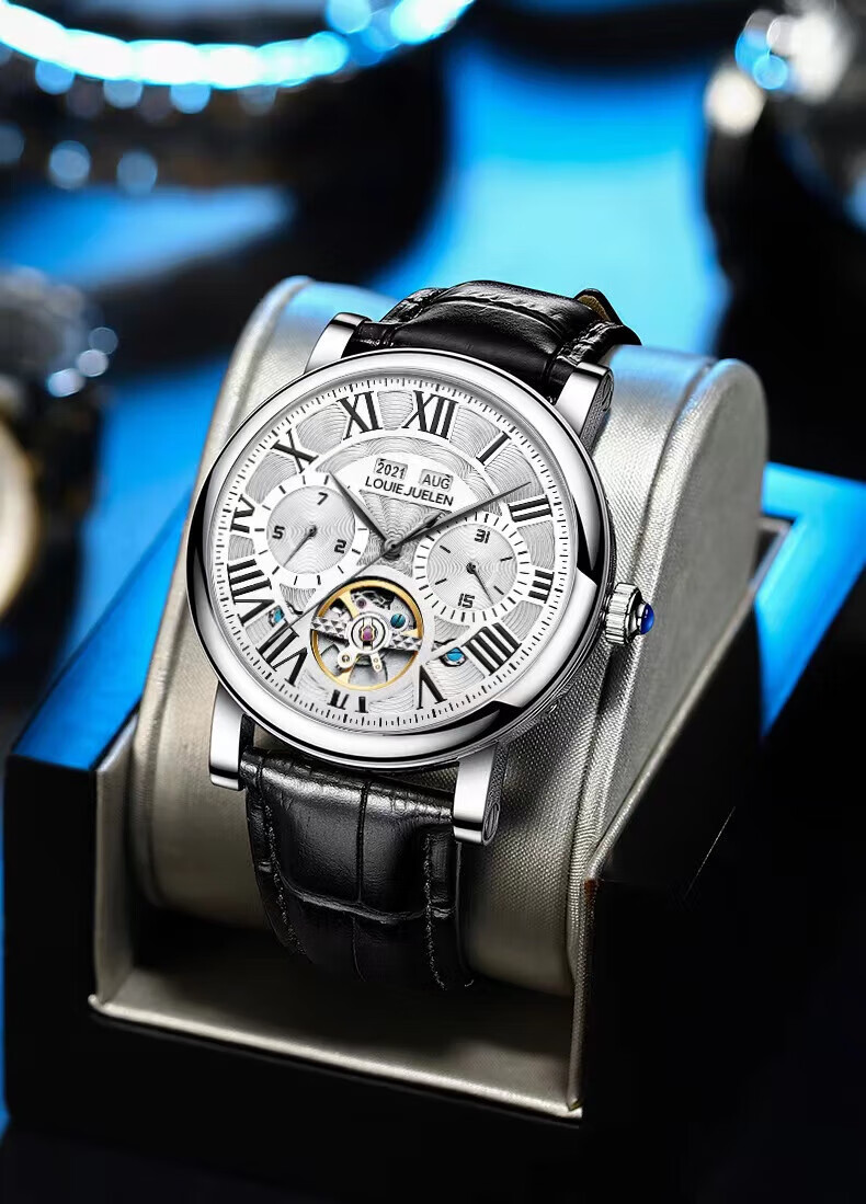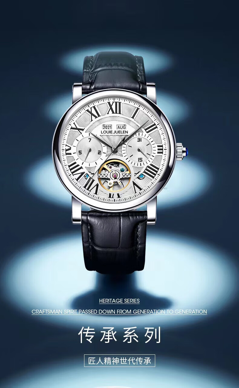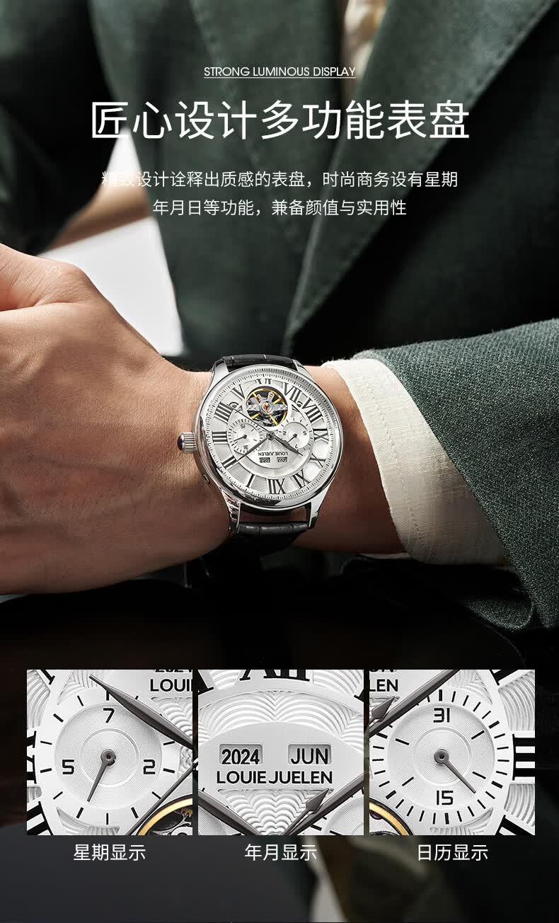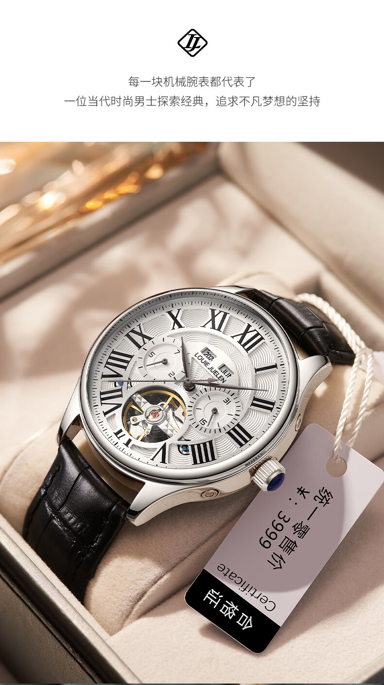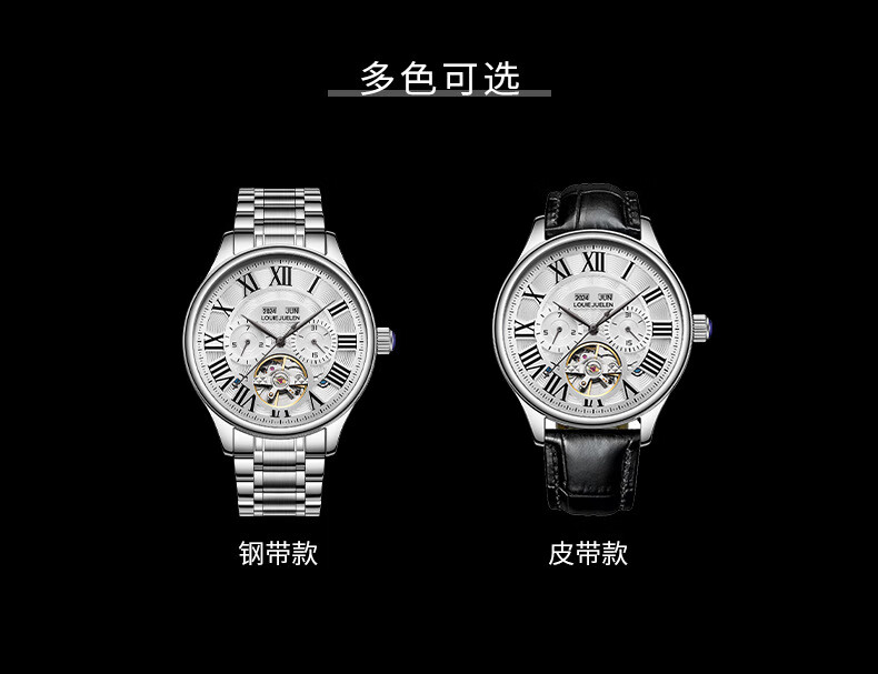 路易爵伦(LOUIE JUELEN)多功能陀飞轮机械表防水男表真皮表带全自动机芯学生考试手表礼物 L-9162银壳白面钢带【多功能机械表】
