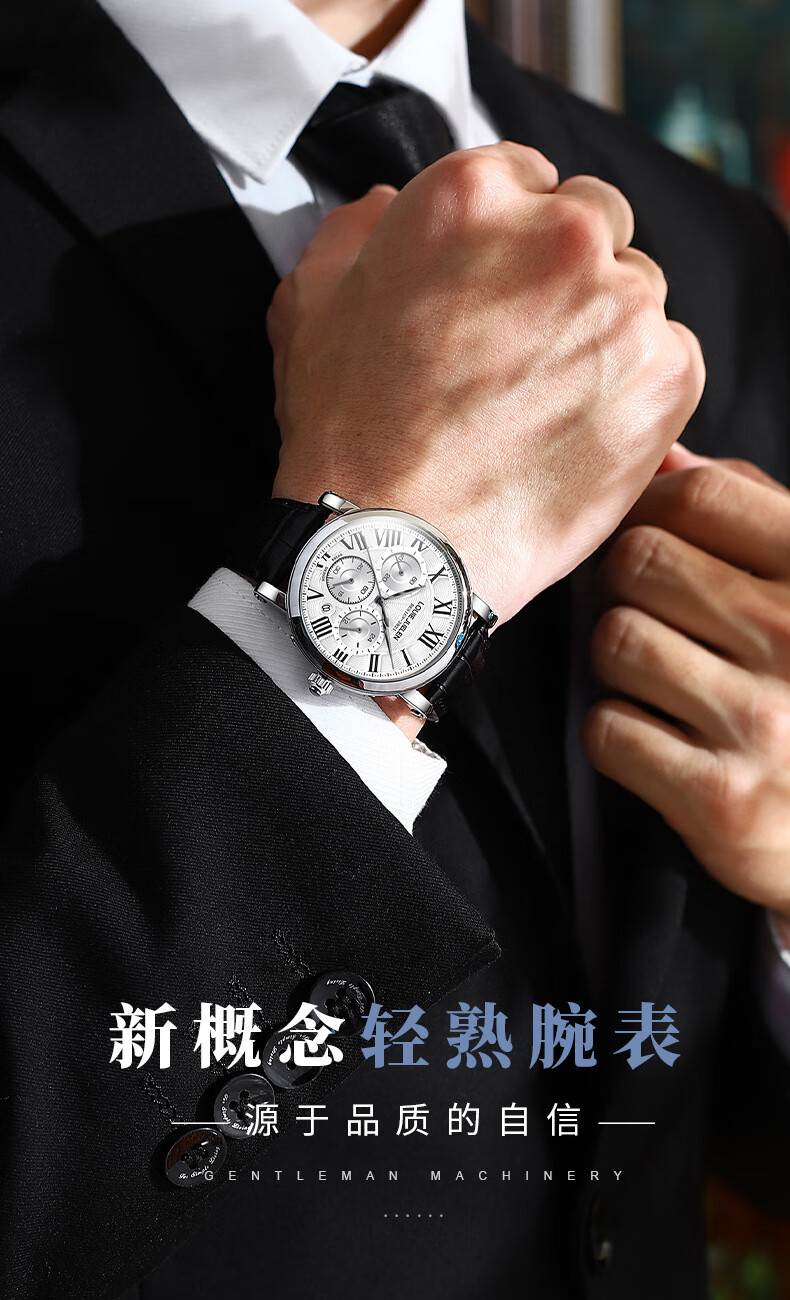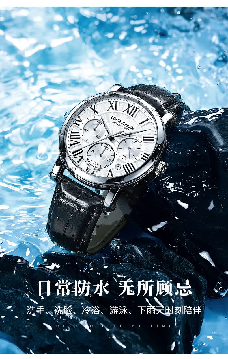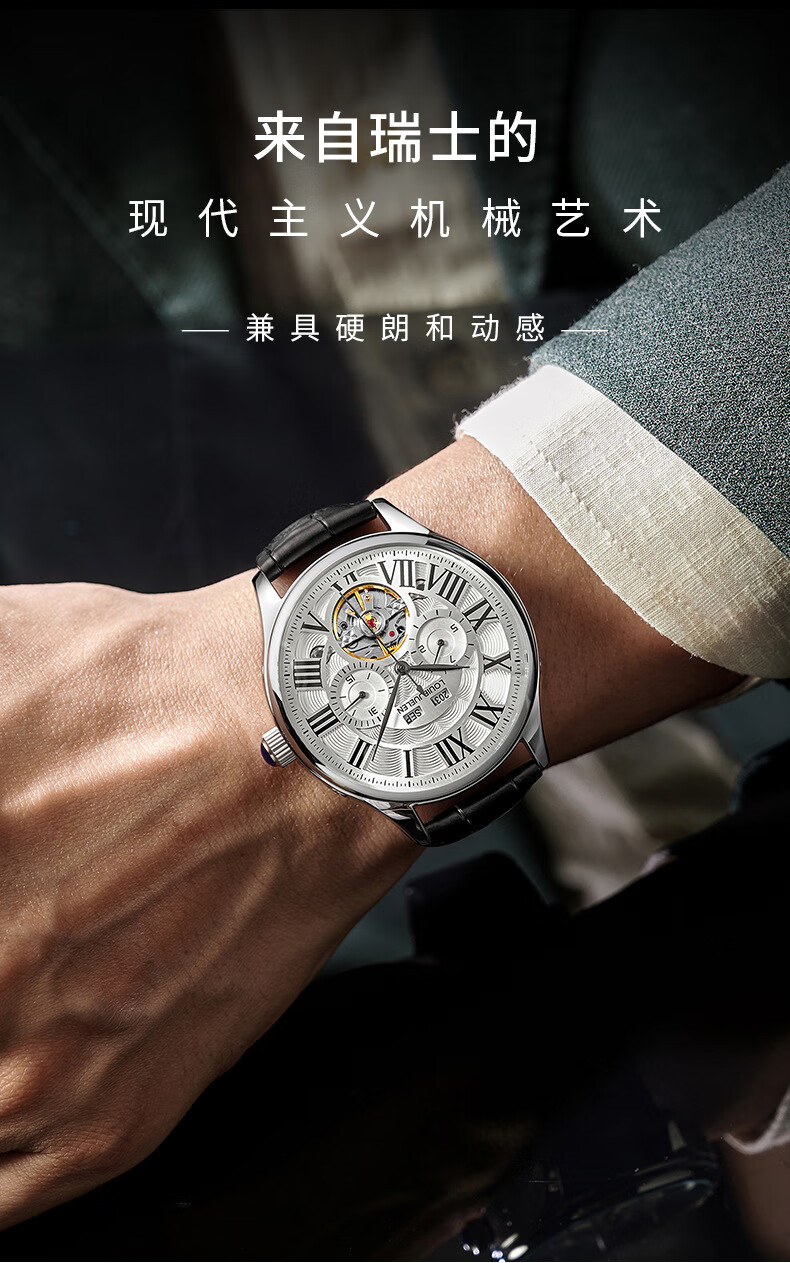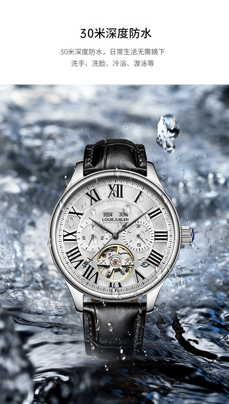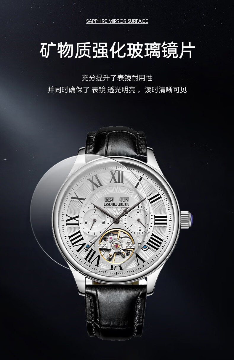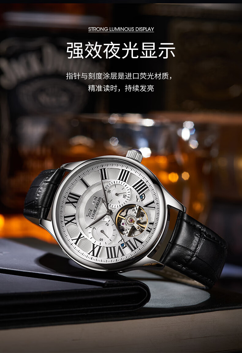 路易爵伦(LOUIE JUELEN)多功能陀飞轮机械表防水男表真皮表带全自动机芯学生考试手表礼物 L-9162银壳白面钢带【多功能机械表】