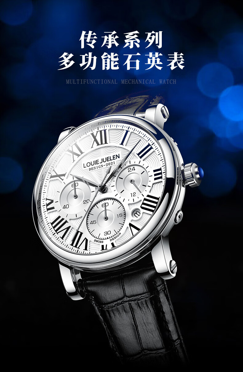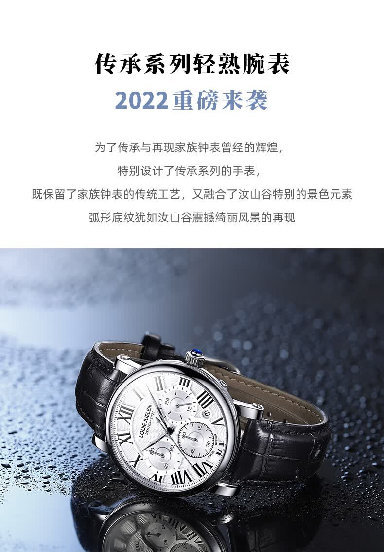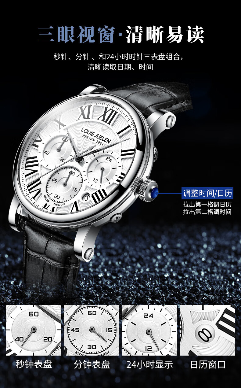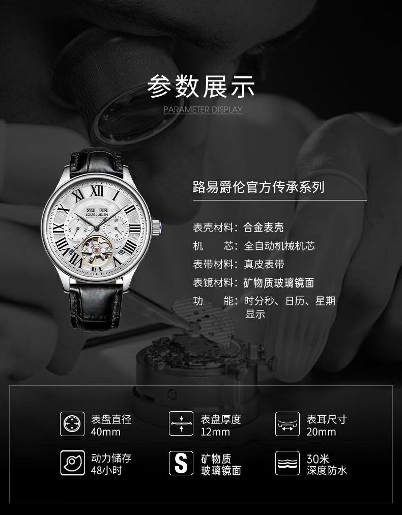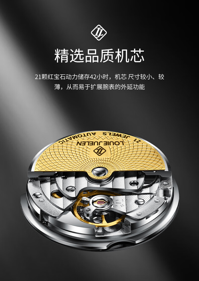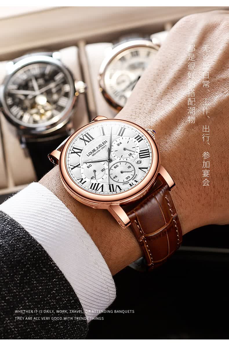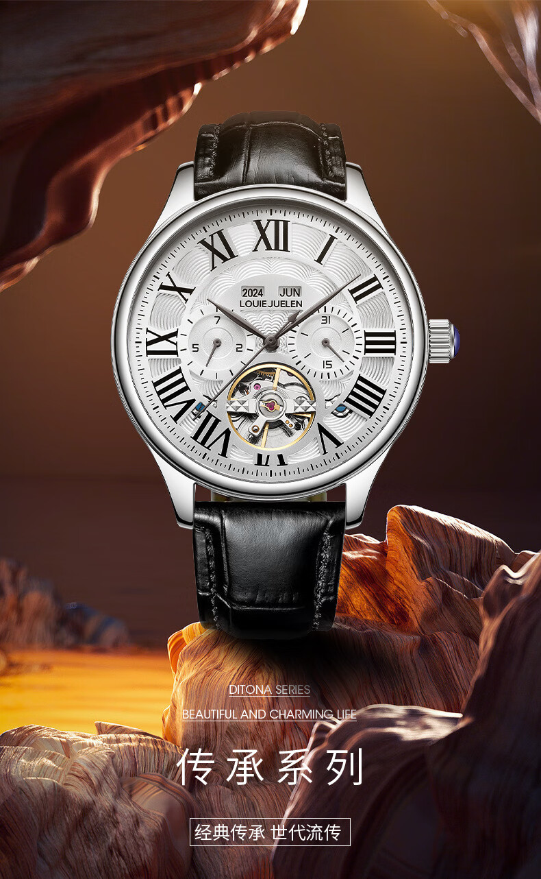 路易爵伦(LOUIE JUELEN)多功能陀飞轮机械表防水男表真皮表带全自动机芯学生考试手表礼物 L-9162银壳白面钢带【多功能机械表】