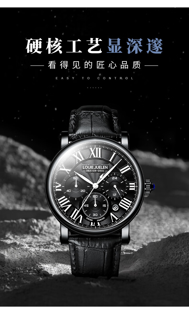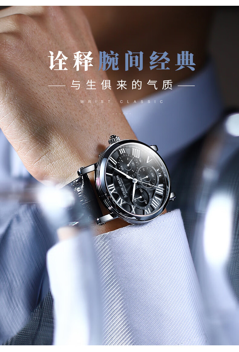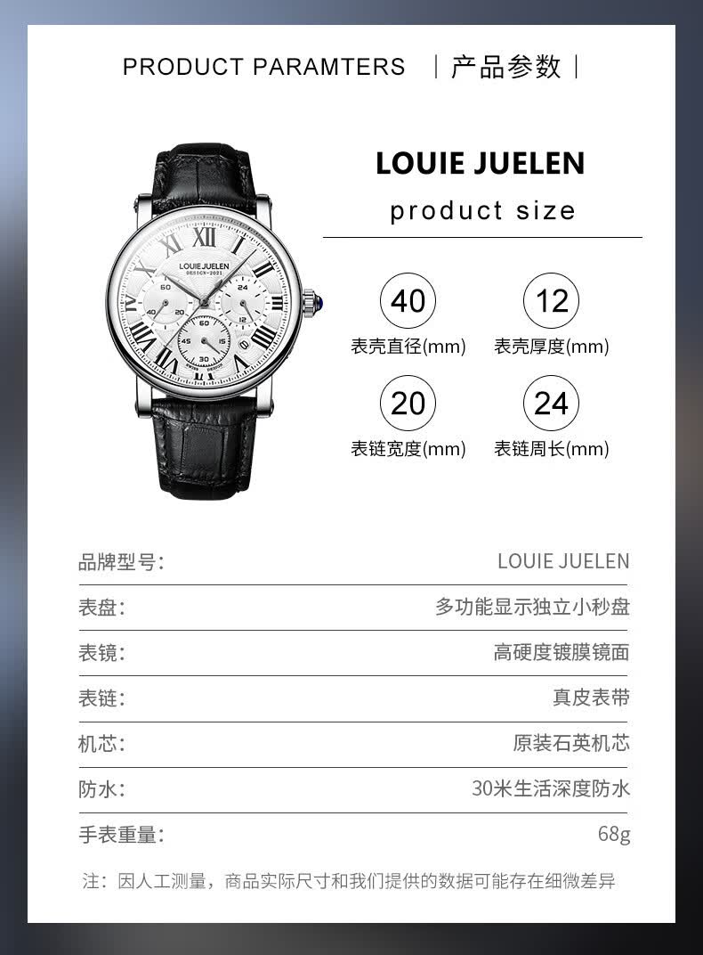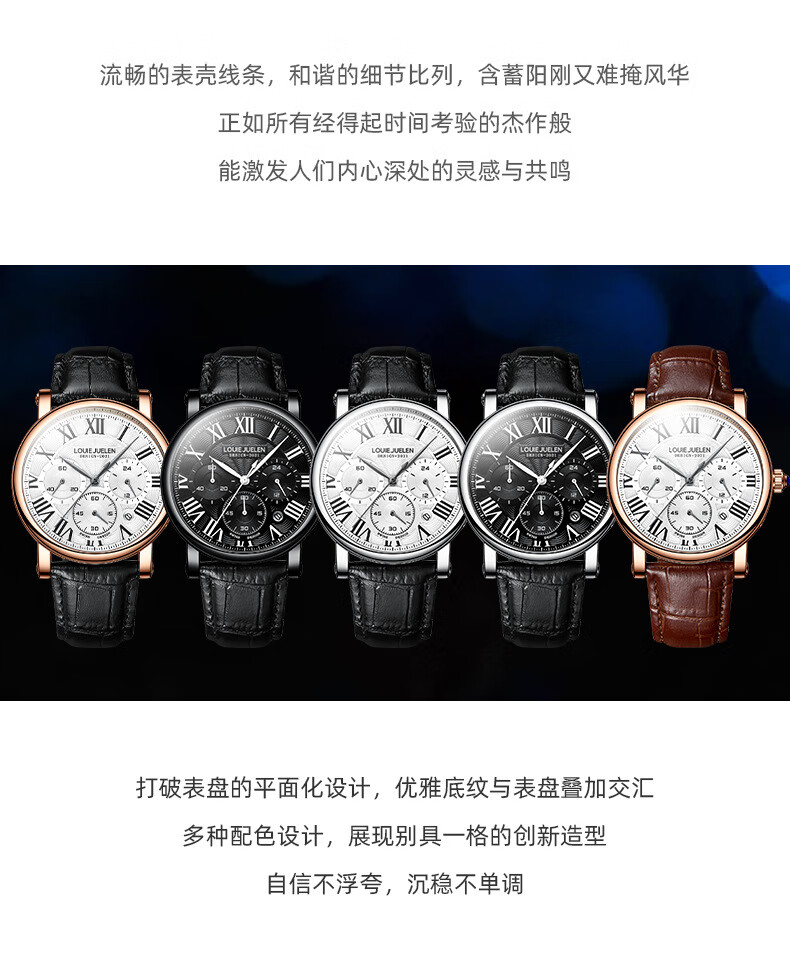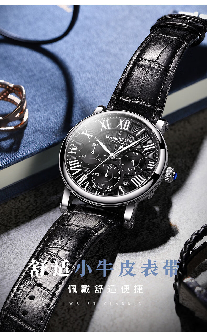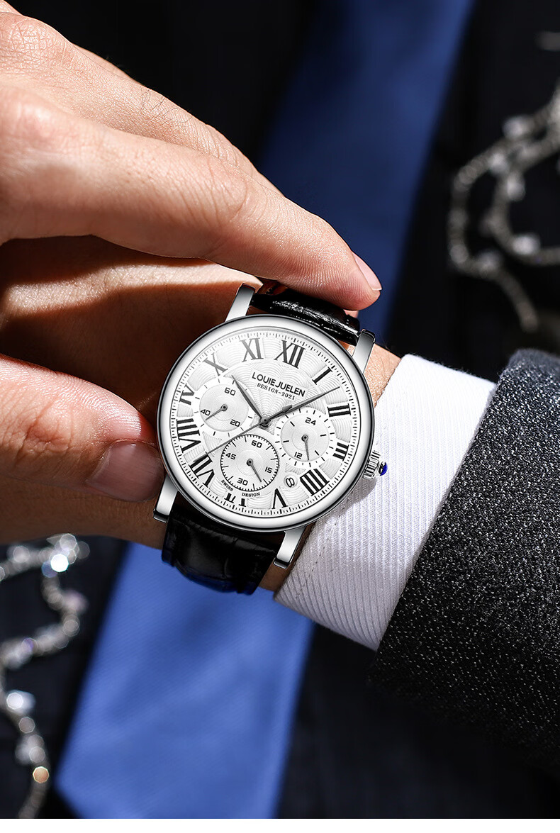 路易爵伦(LOUIE JUELEN)多功能陀飞轮机械表防水男表真皮表带全自动机芯学生考试手表礼物 L-9162银壳白面钢带【多功能机械表】