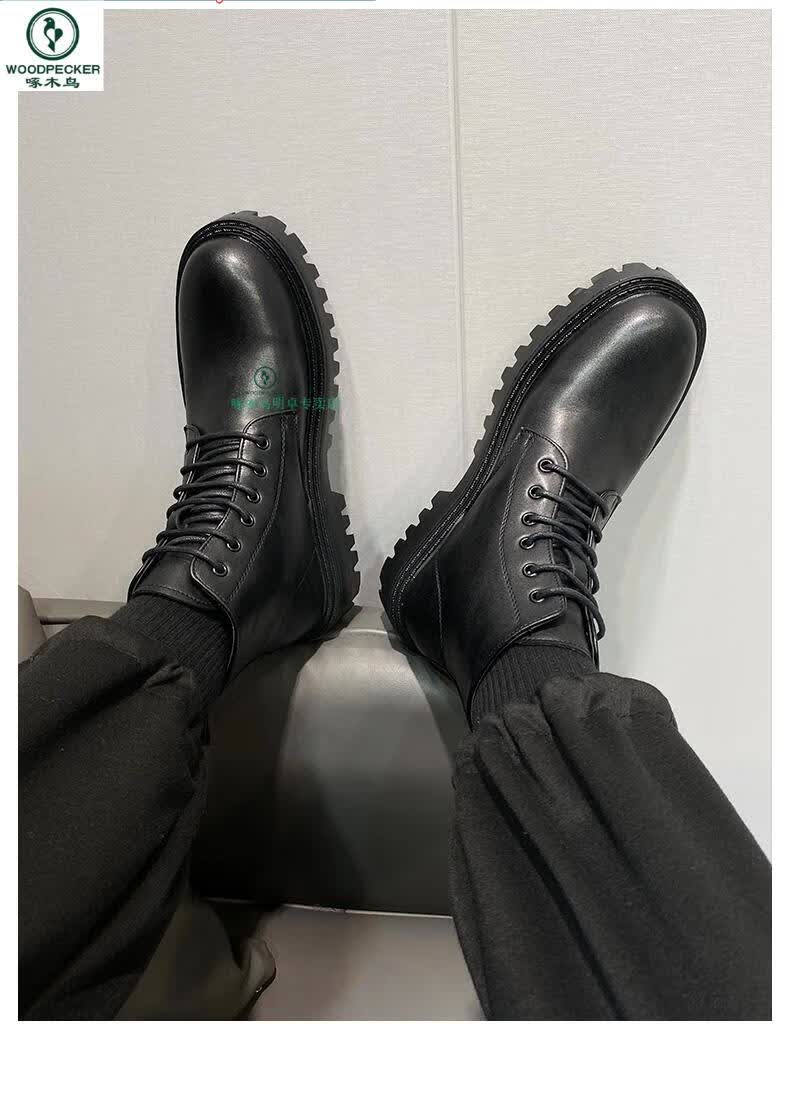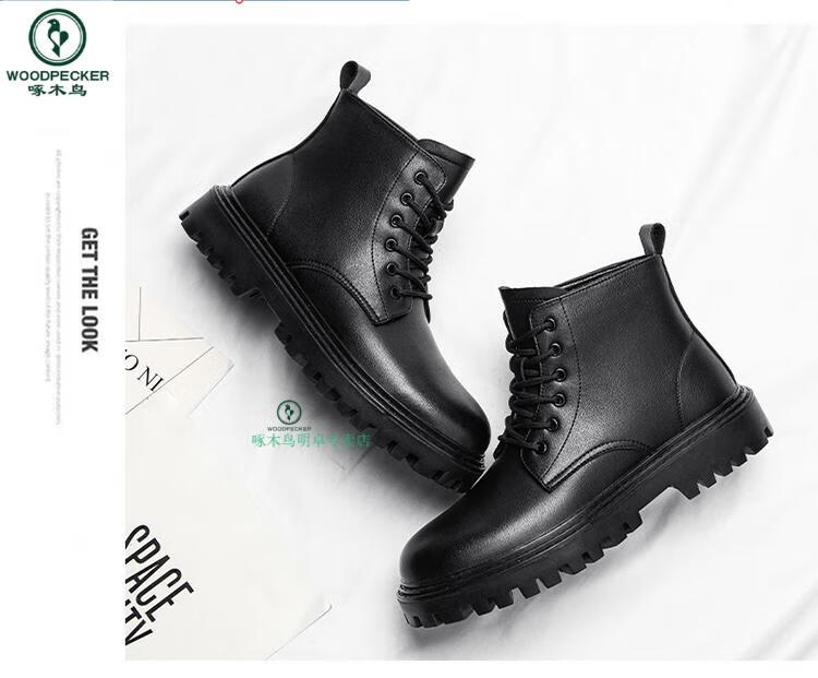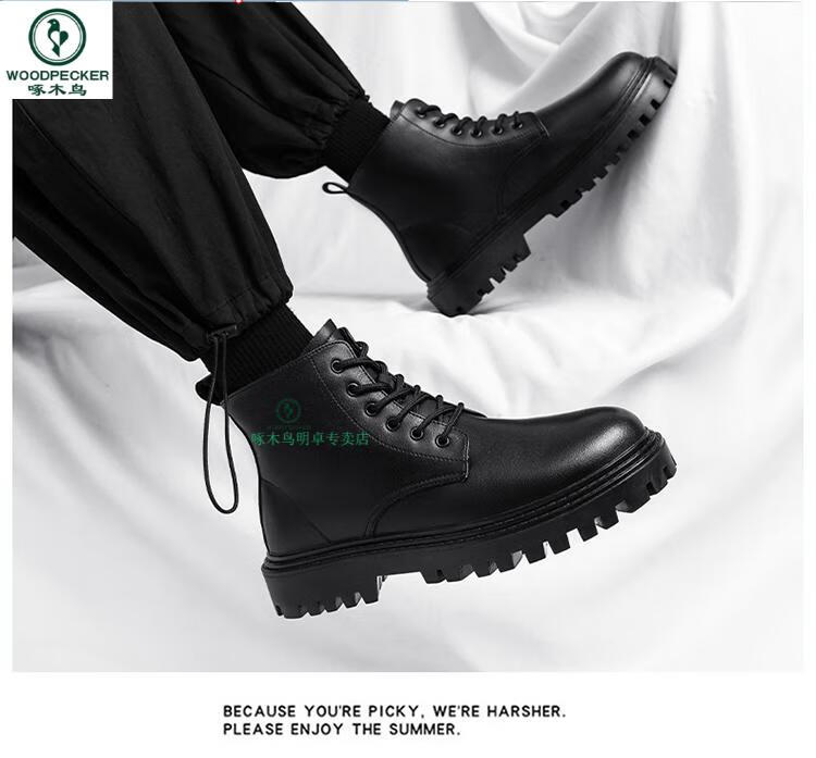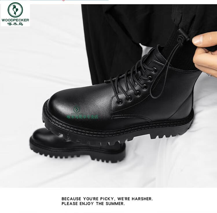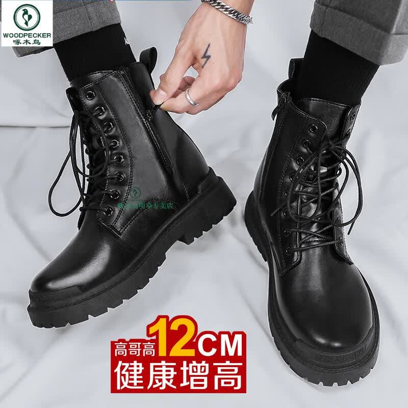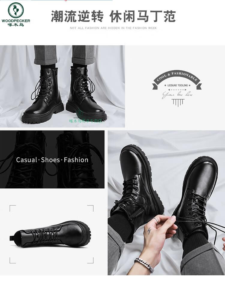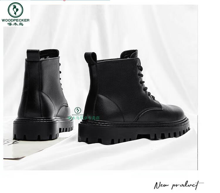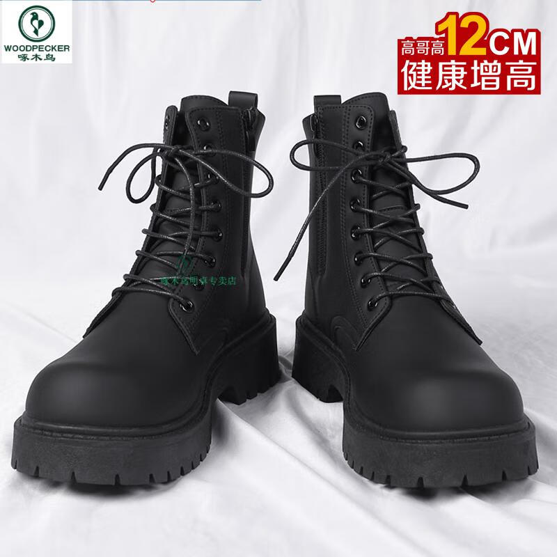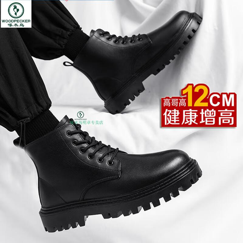 啄木鸟黑色鞋子休闲增高鞋12cm马丁靴男真皮英伦风隐形内增高机车靴 黑色直筒六孔 增高6cm 38