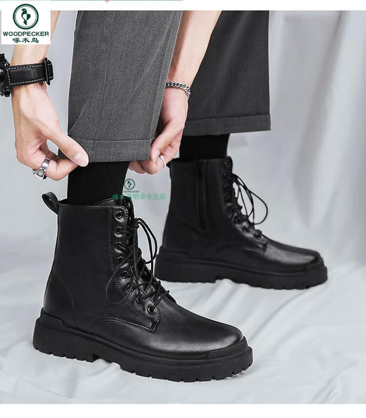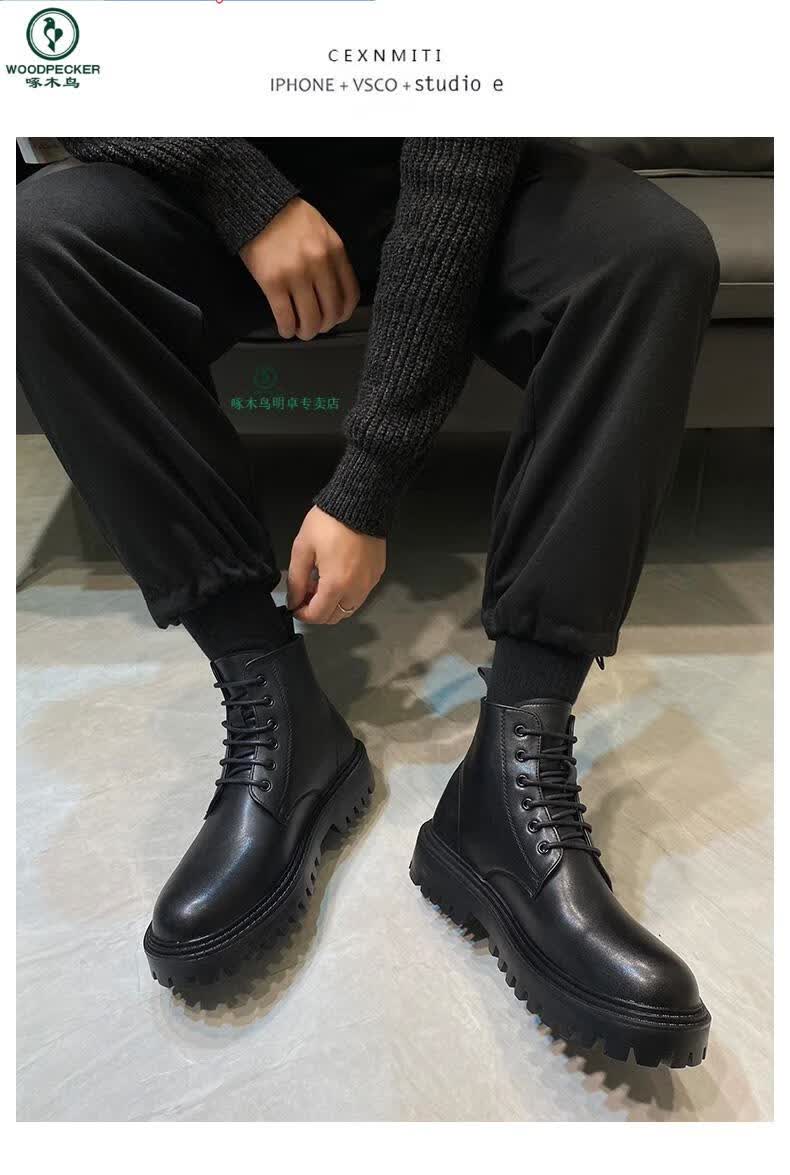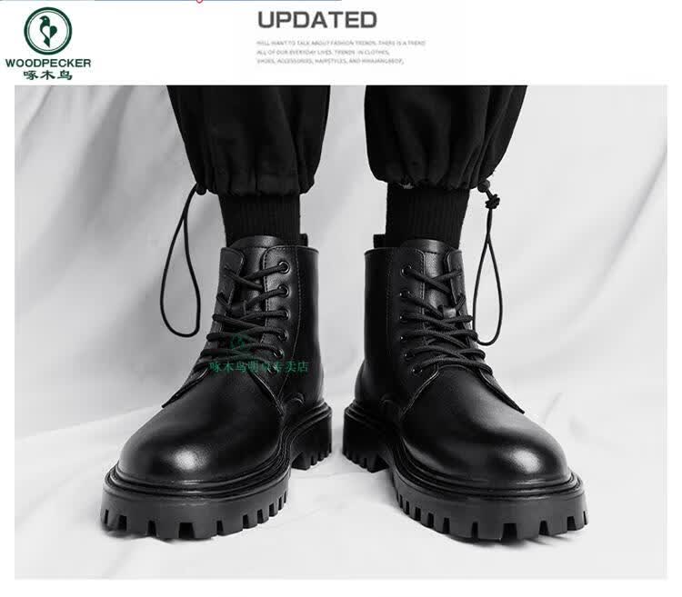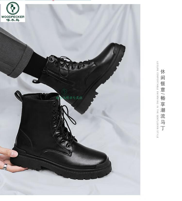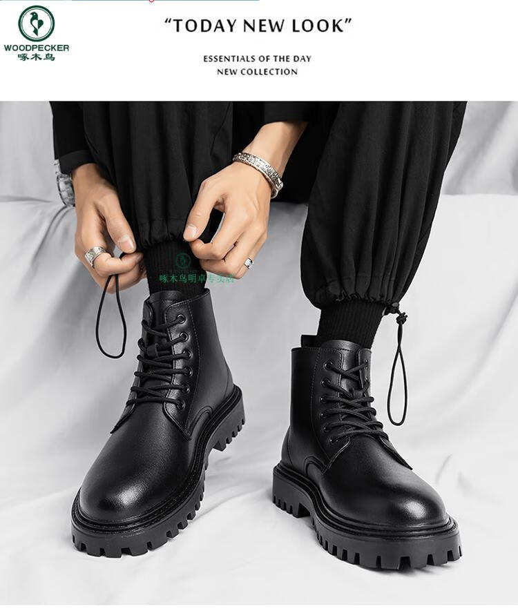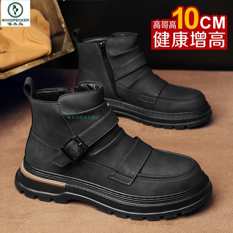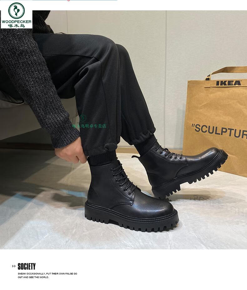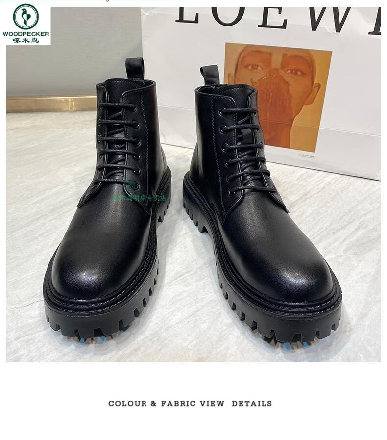 啄木鸟黑色鞋子休闲增高鞋12cm马丁靴男真皮英伦风隐形内增高机车靴 黑色直筒六孔 增高6cm 38