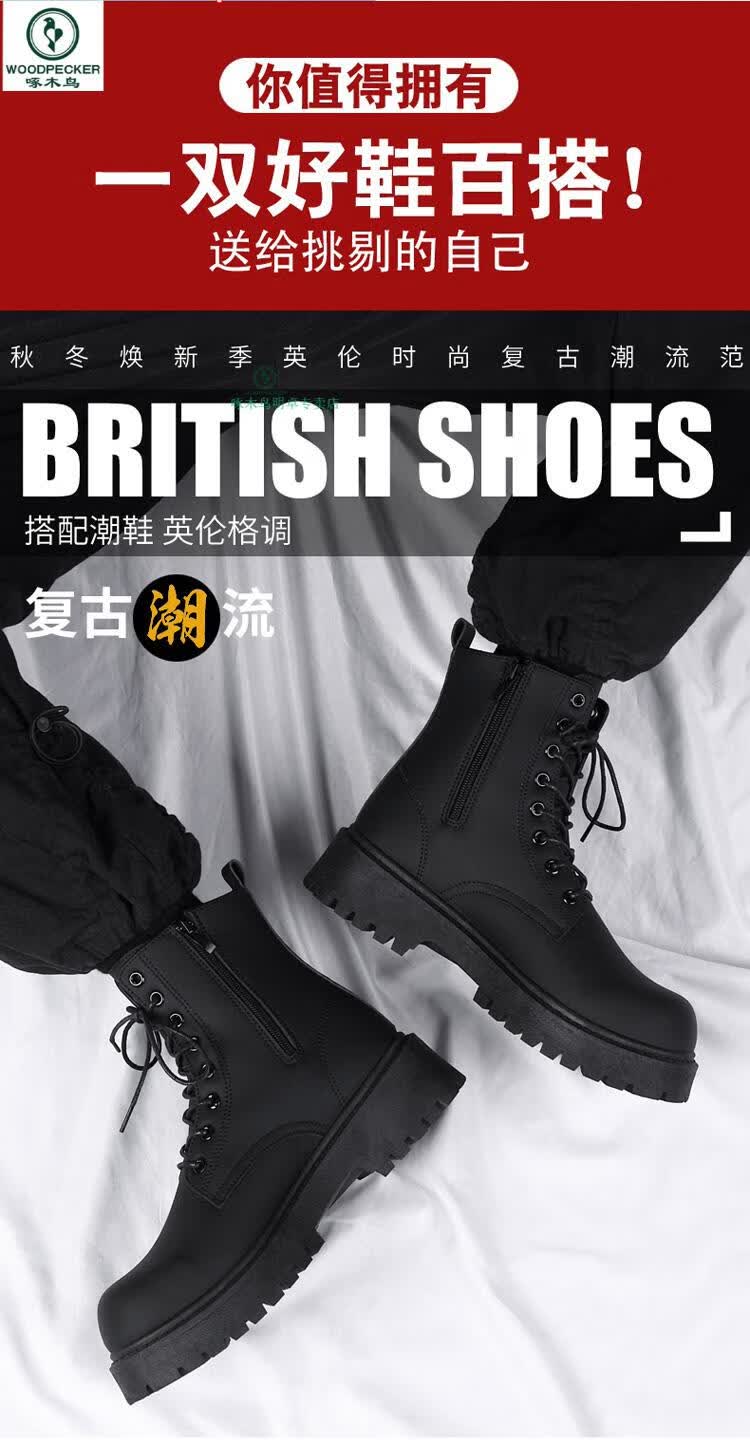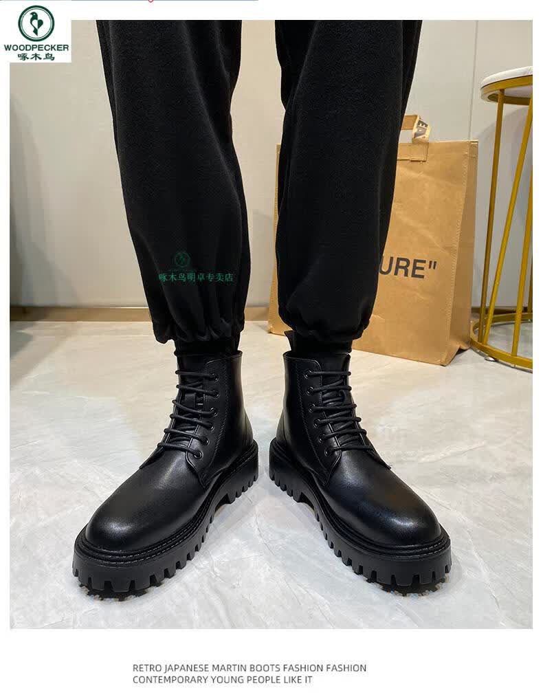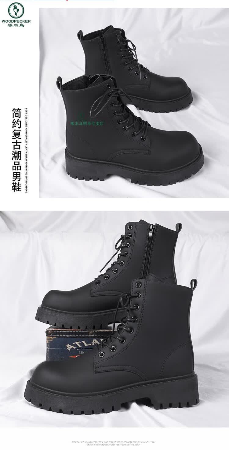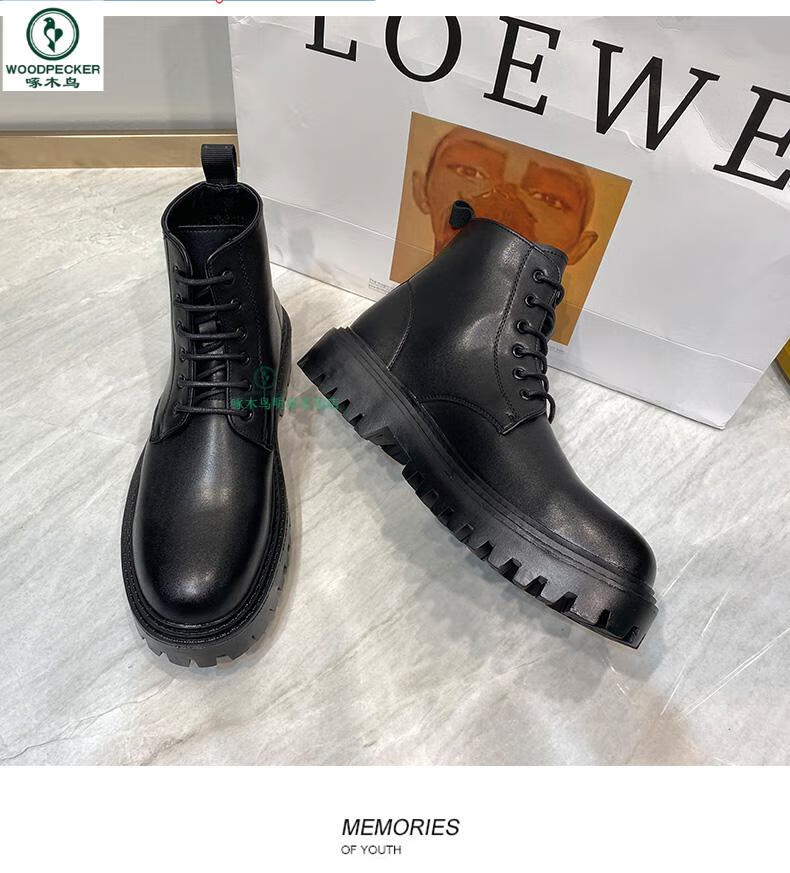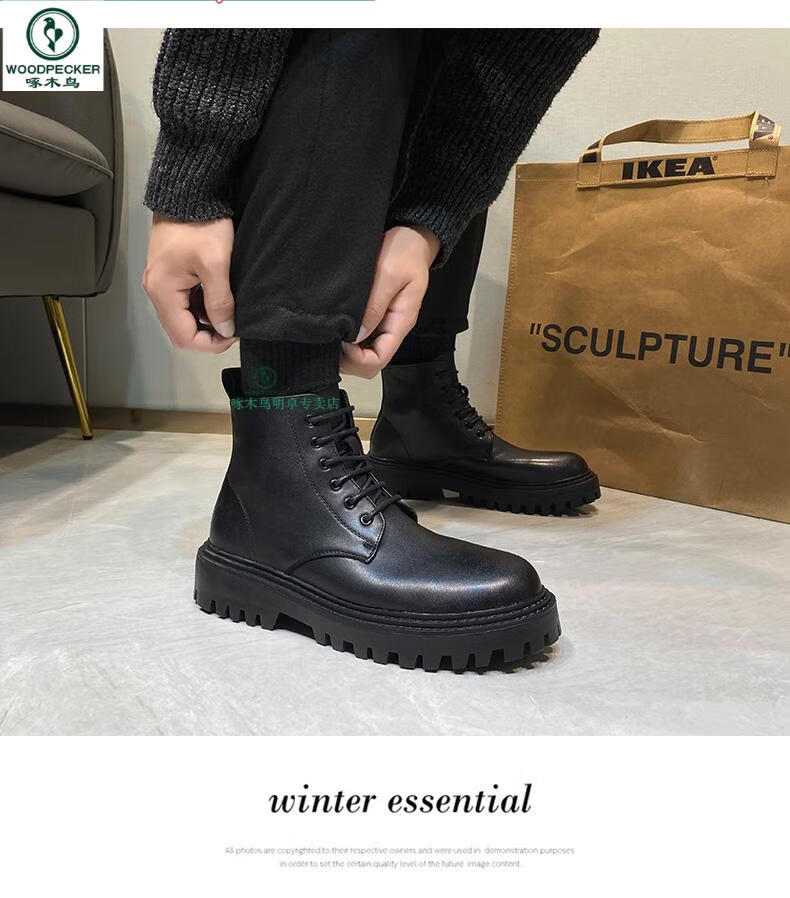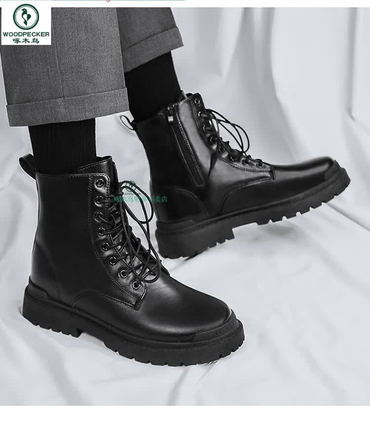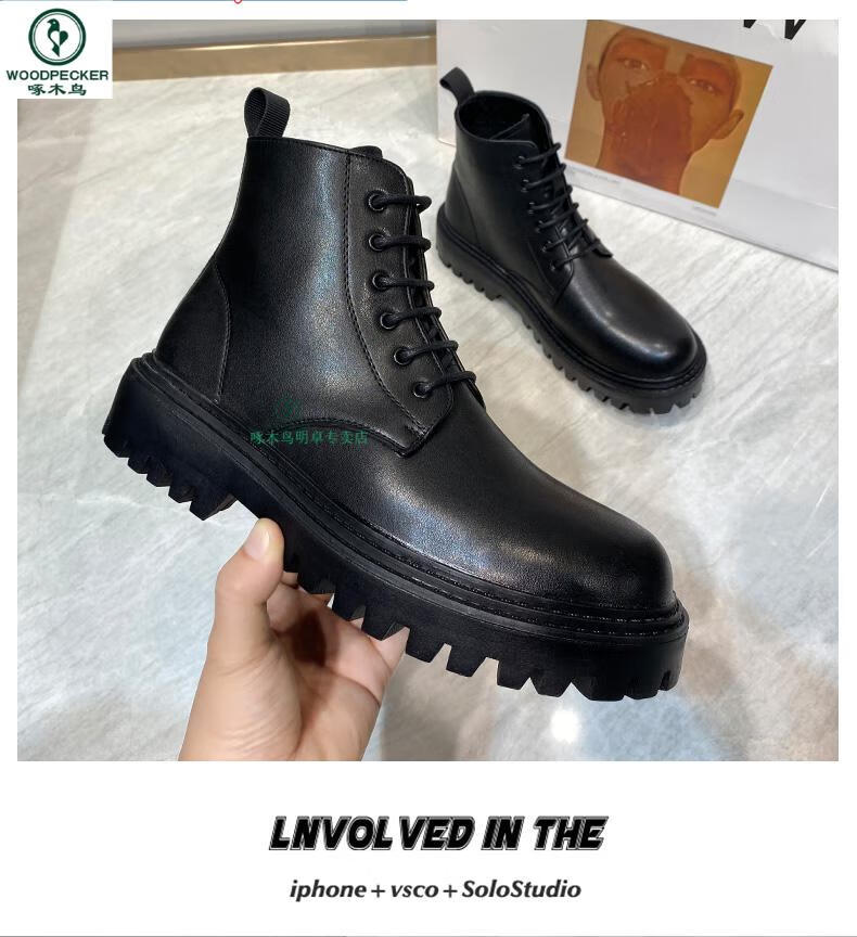 啄木鸟黑色鞋子休闲增高鞋12cm马丁靴男真皮英伦风隐形内增高机车靴 黑色直筒六孔 增高6cm 38