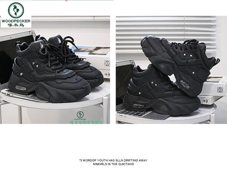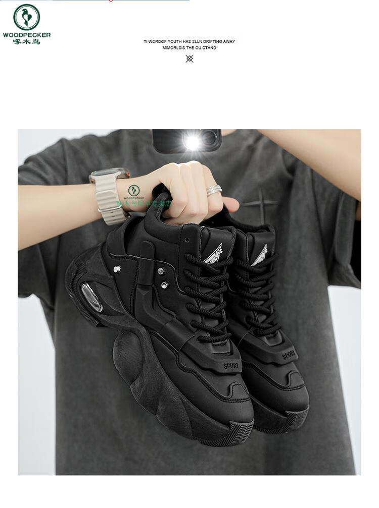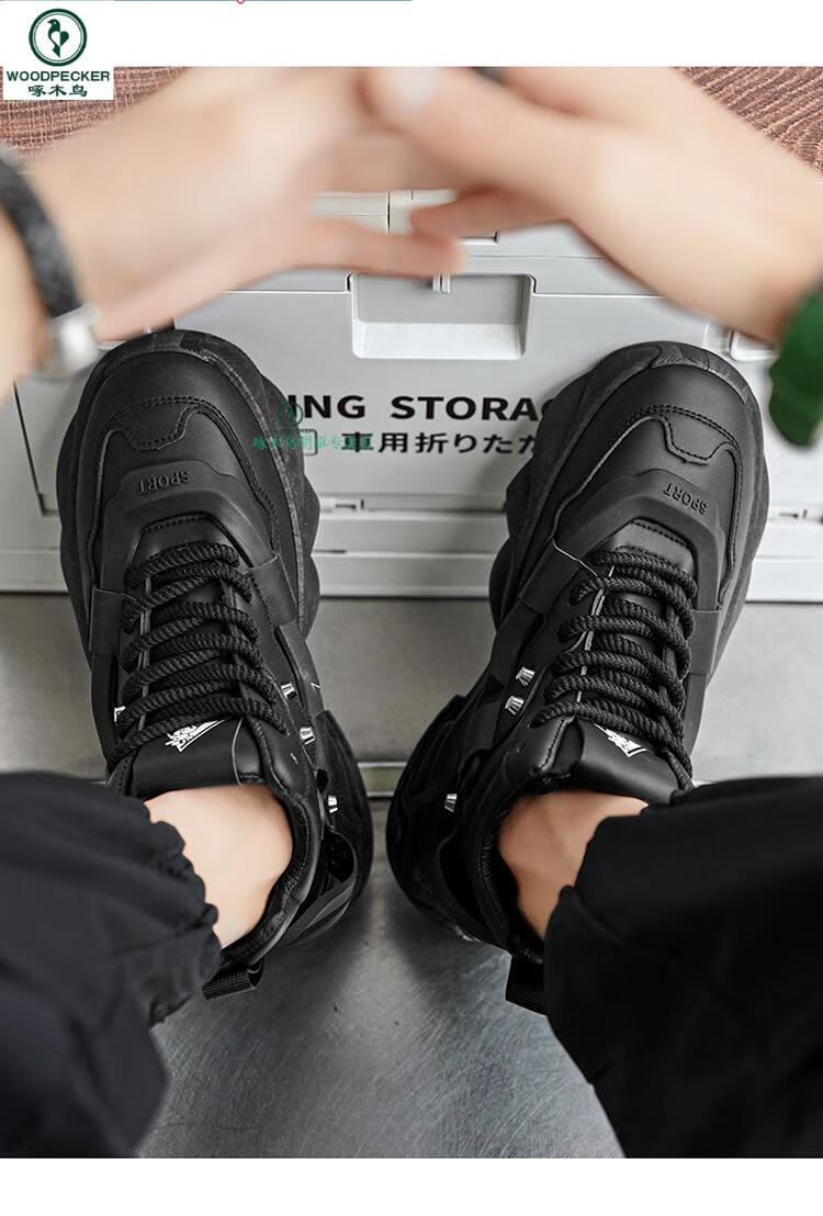 轻奢男鞋秋冬季皮面运动鞋男百搭老爹鞋男休闲鞋子男士软底增高鞋 黑金色 42