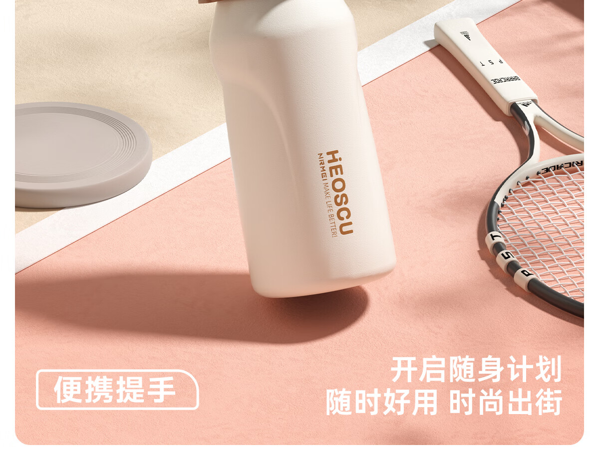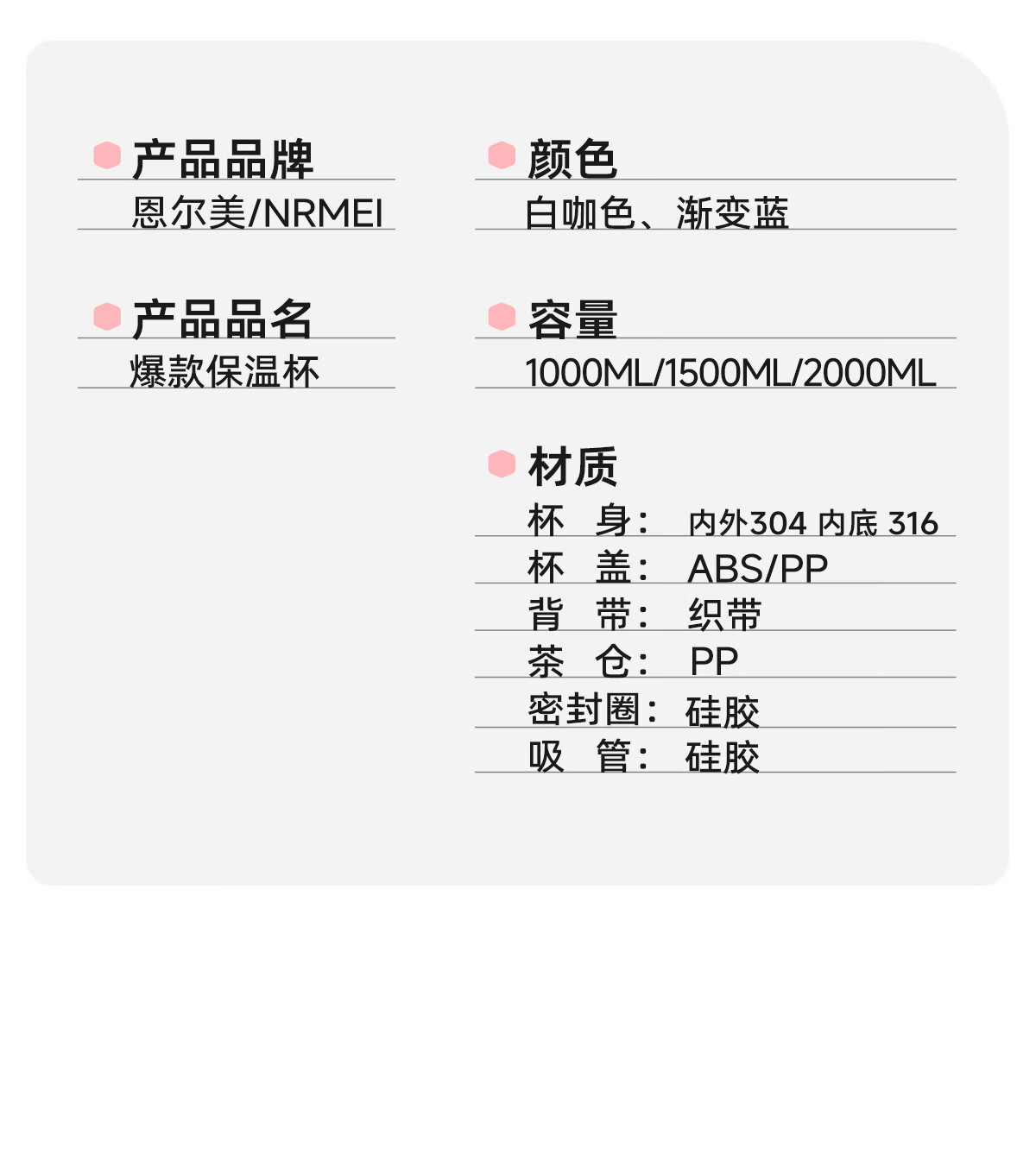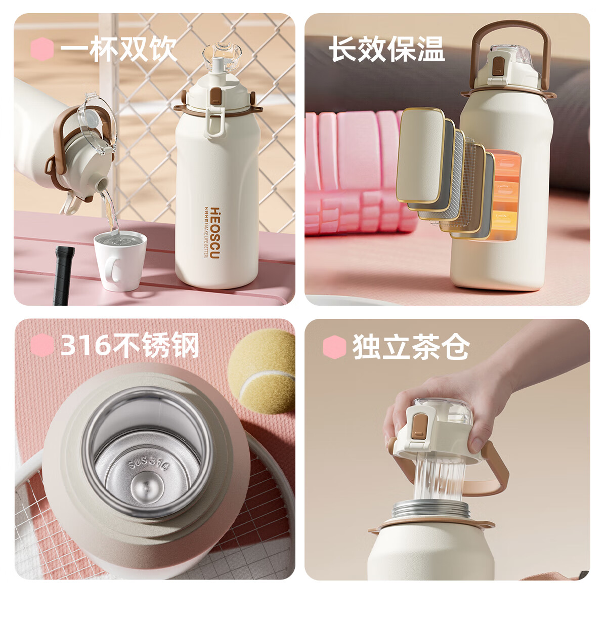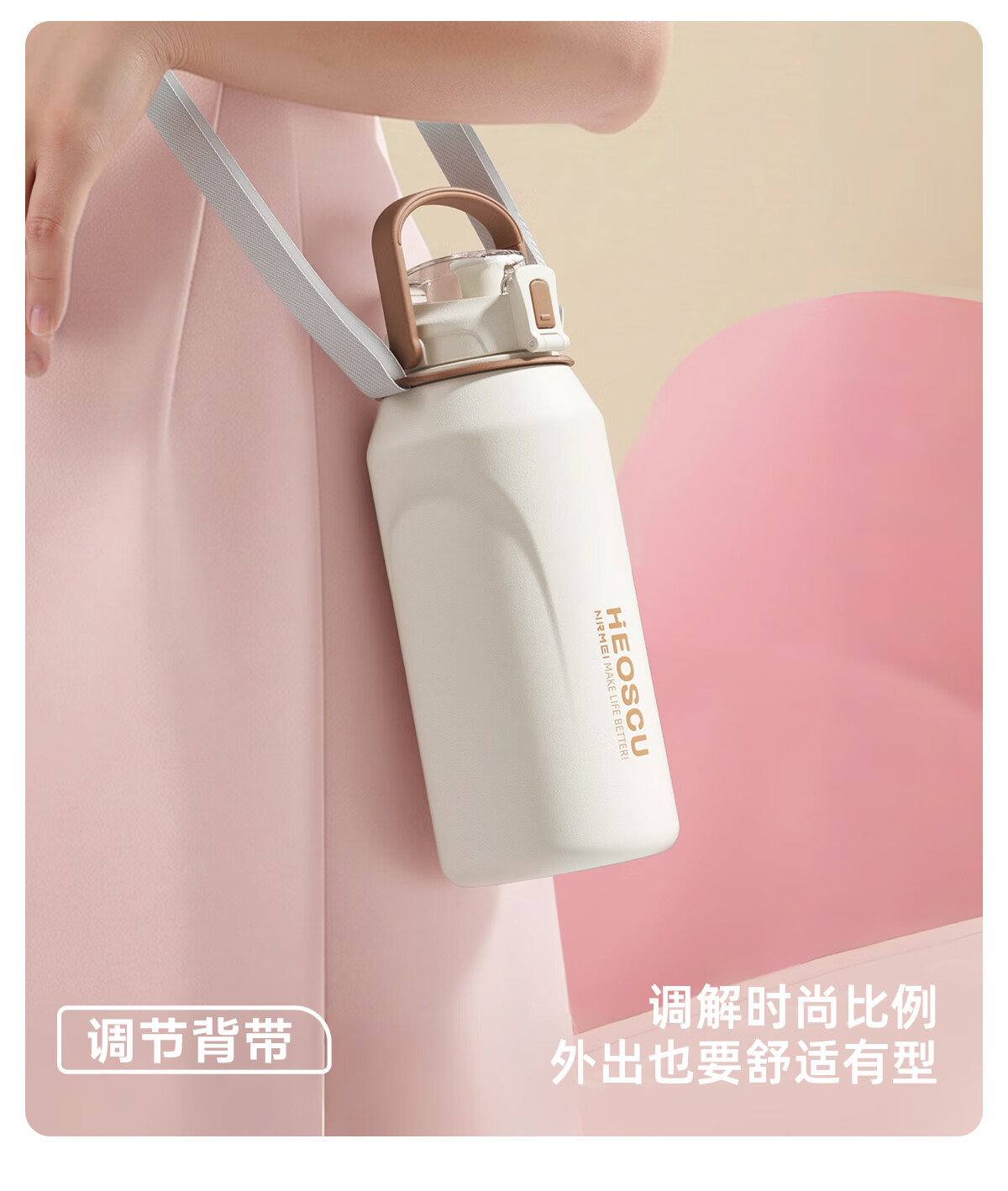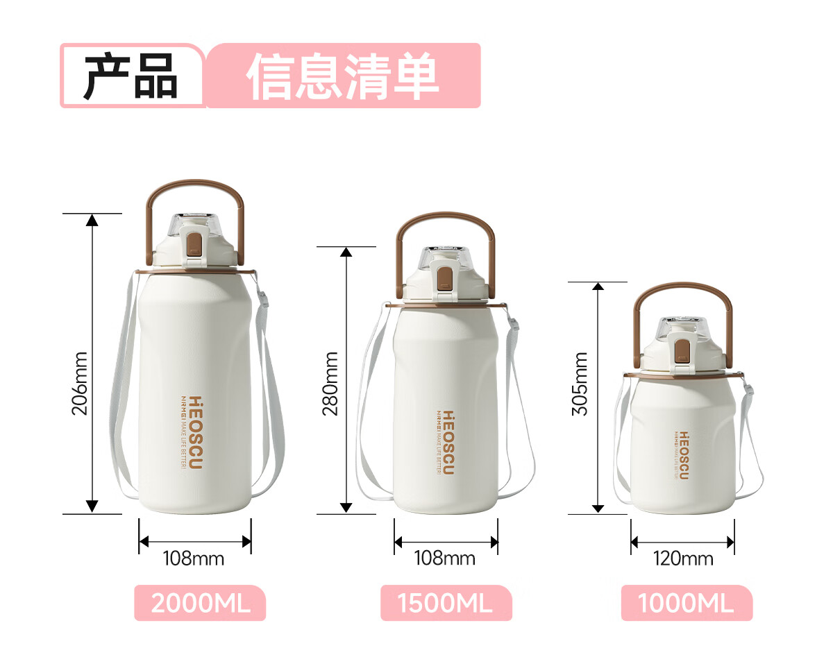 恩尔美(nRMEi)保温杯大容量女款高颜值青少年12-18岁上学专用男运动水壶水杯子 【316不锈钢】白咖色2000ml【一杯双饮/背带提绳】