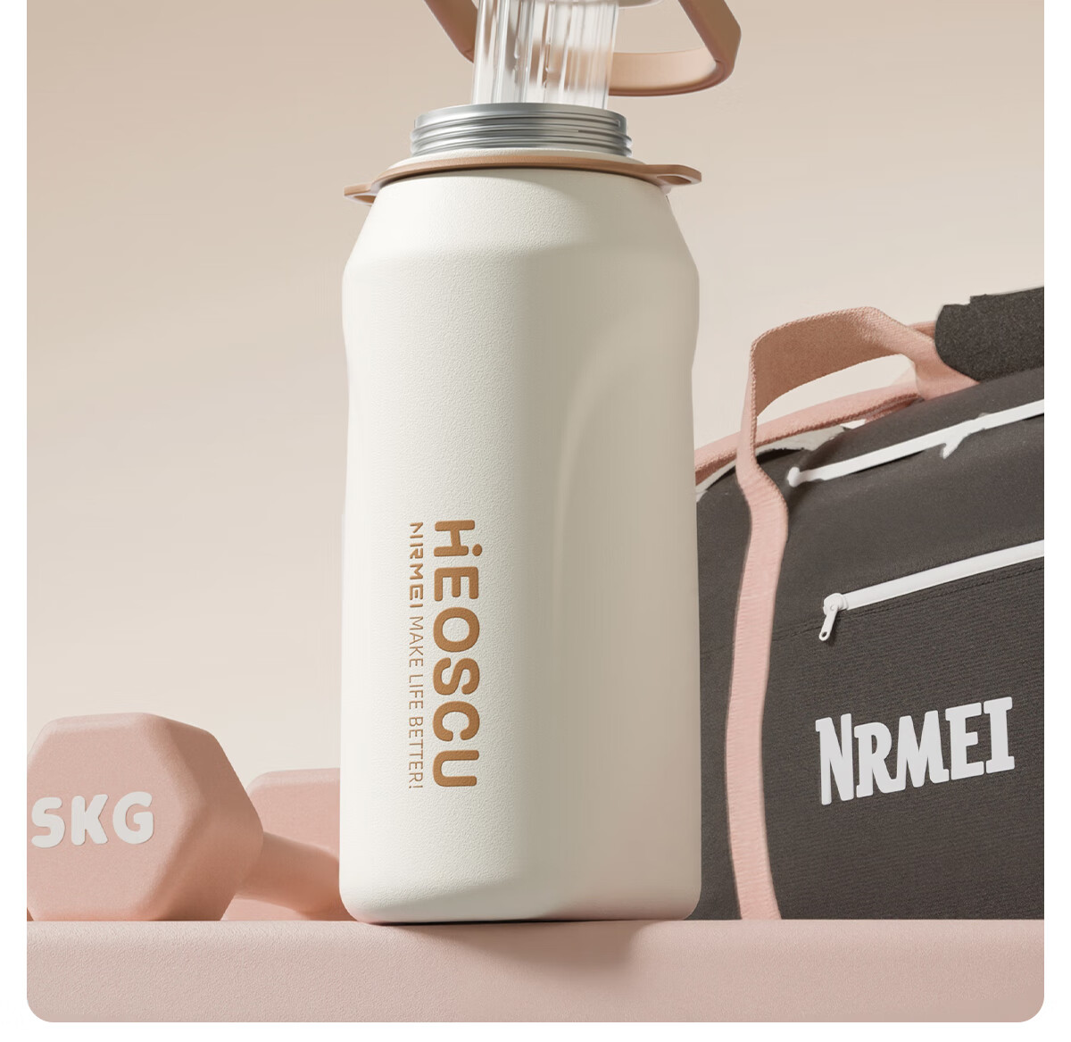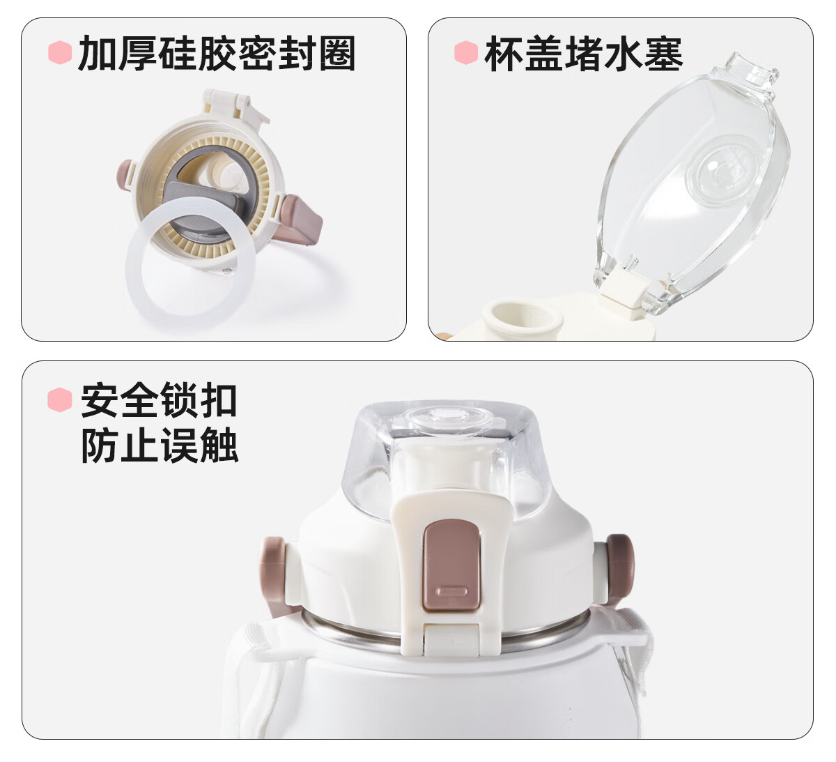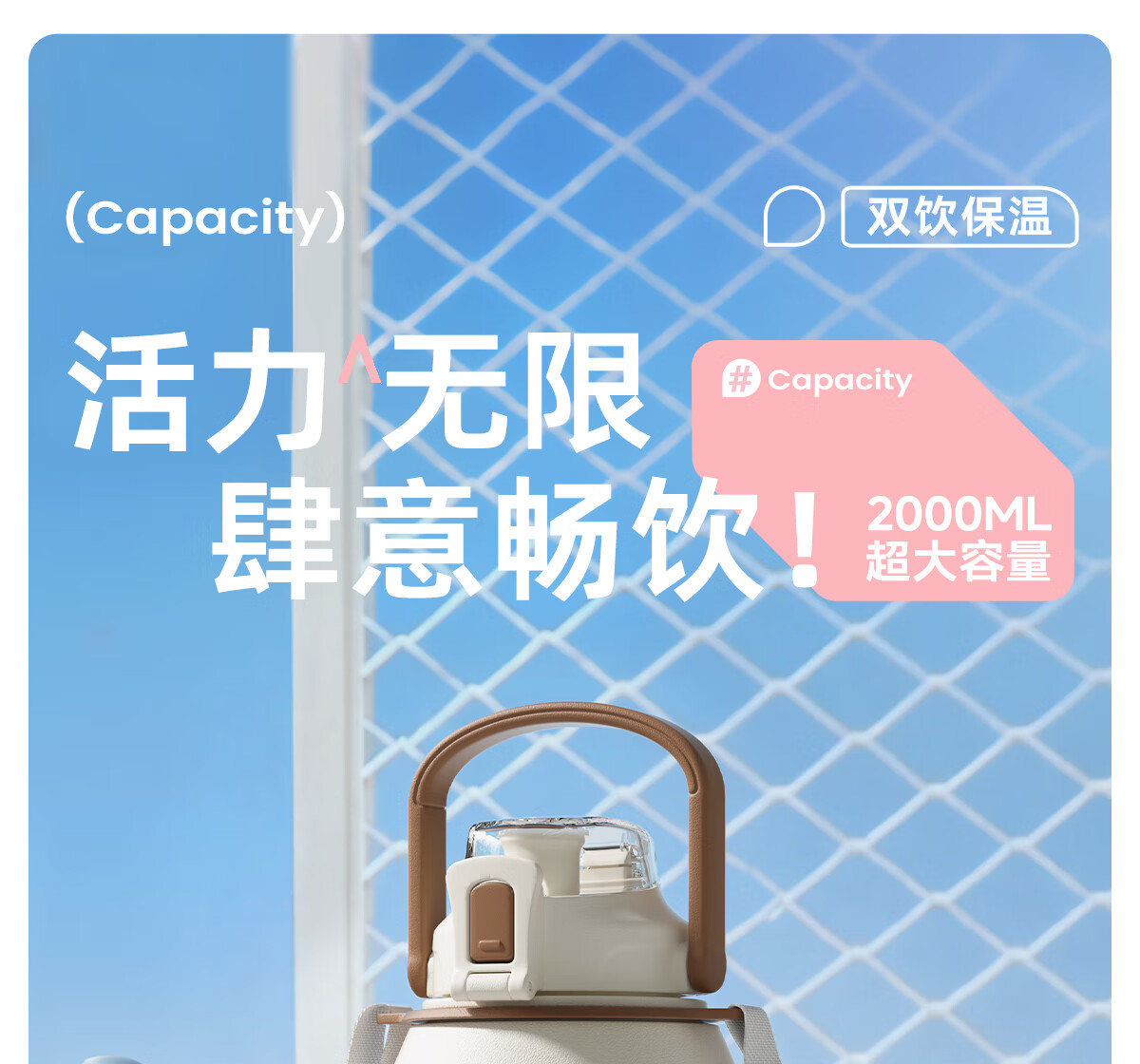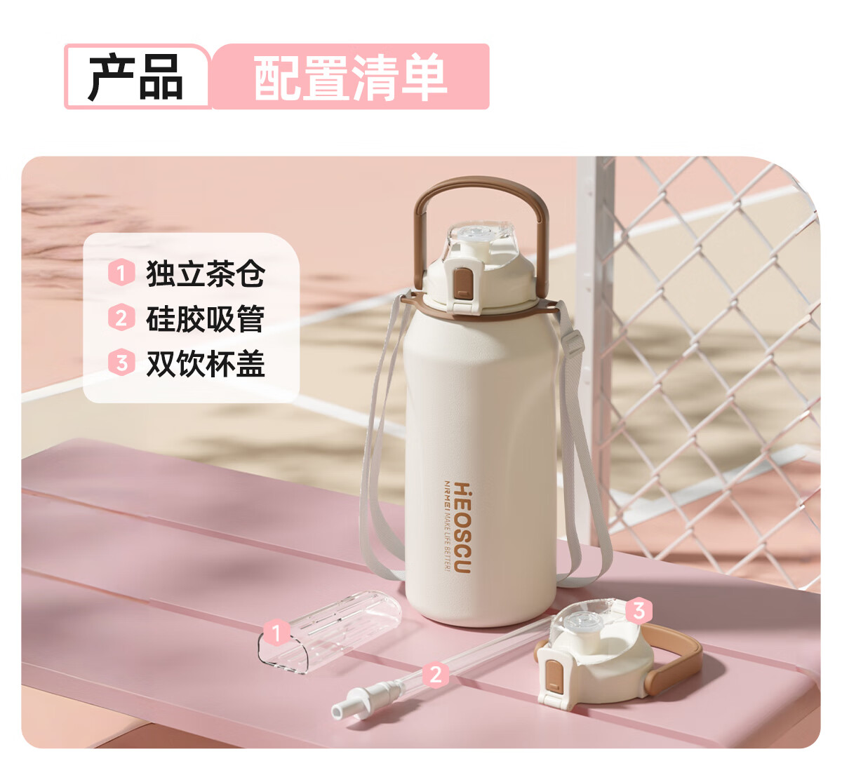 恩尔美(nRMEi)保温杯大容量女款高颜值青少年12-18岁上学专用男运动水壶水杯子 【316不锈钢】白咖色2000ml【一杯双饮/背带提绳】
