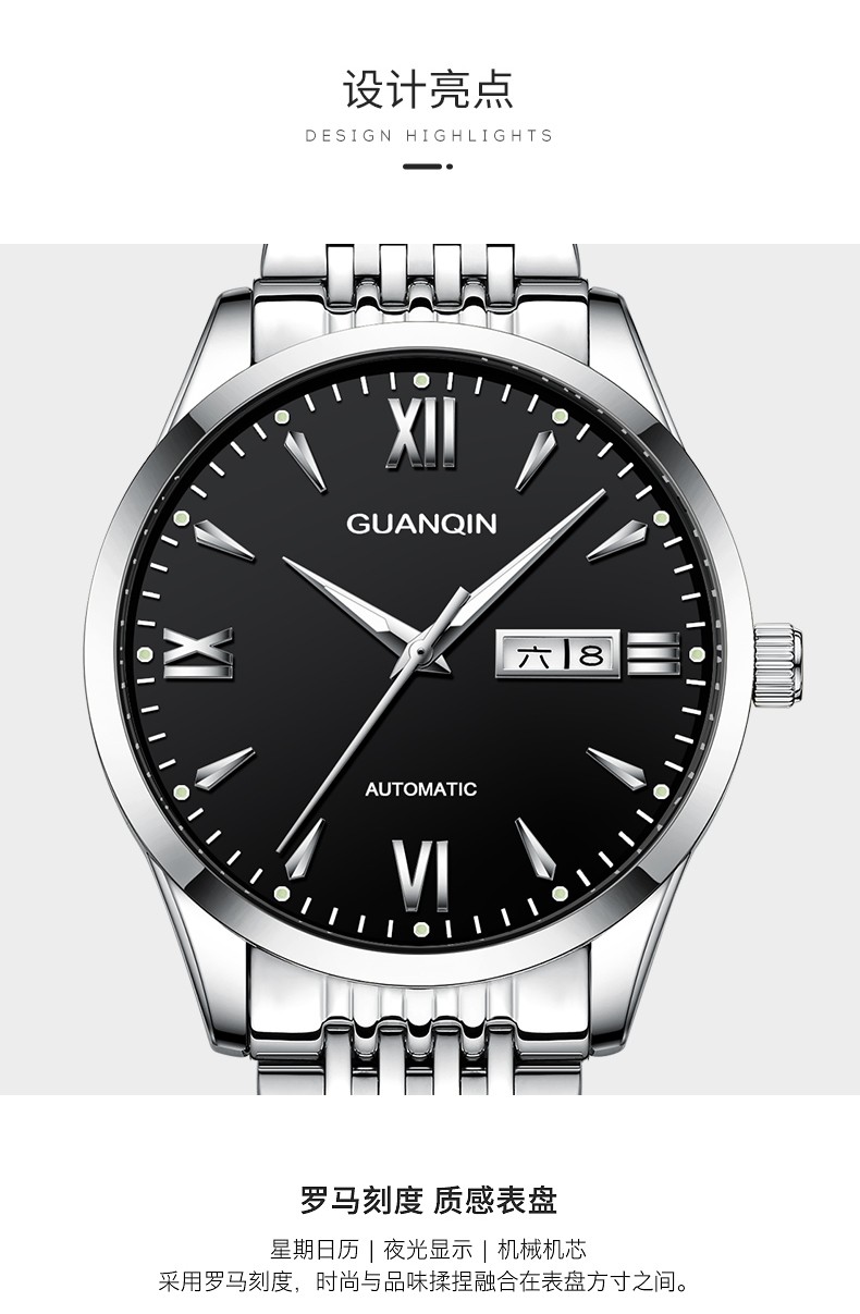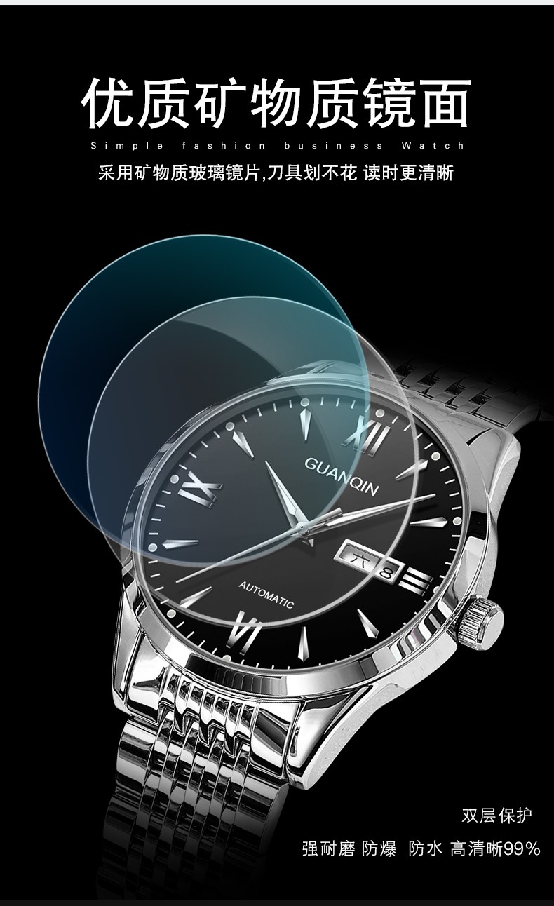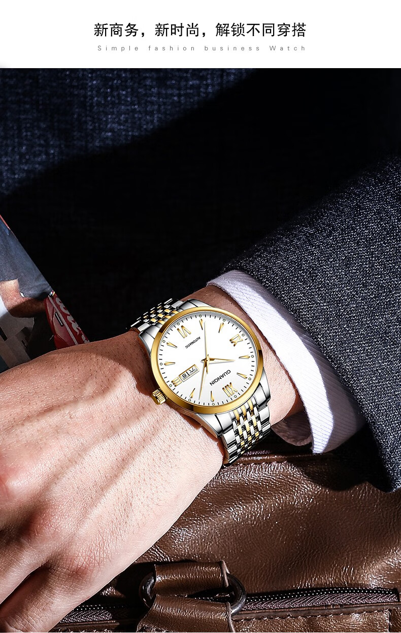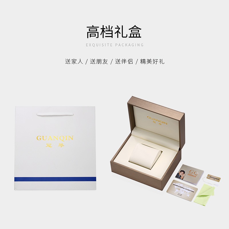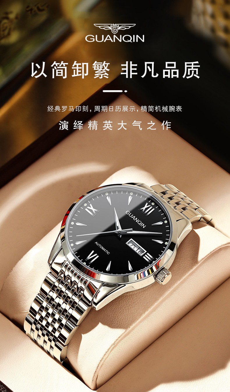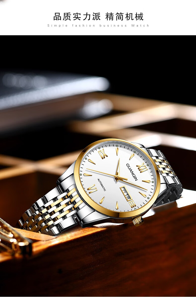 冠琴(GUANQIN) 名表 新款手表男士全自动机械商务休闲防水夜光男表精钢时尚简约 冠琴 16221间金白面 免费刻字