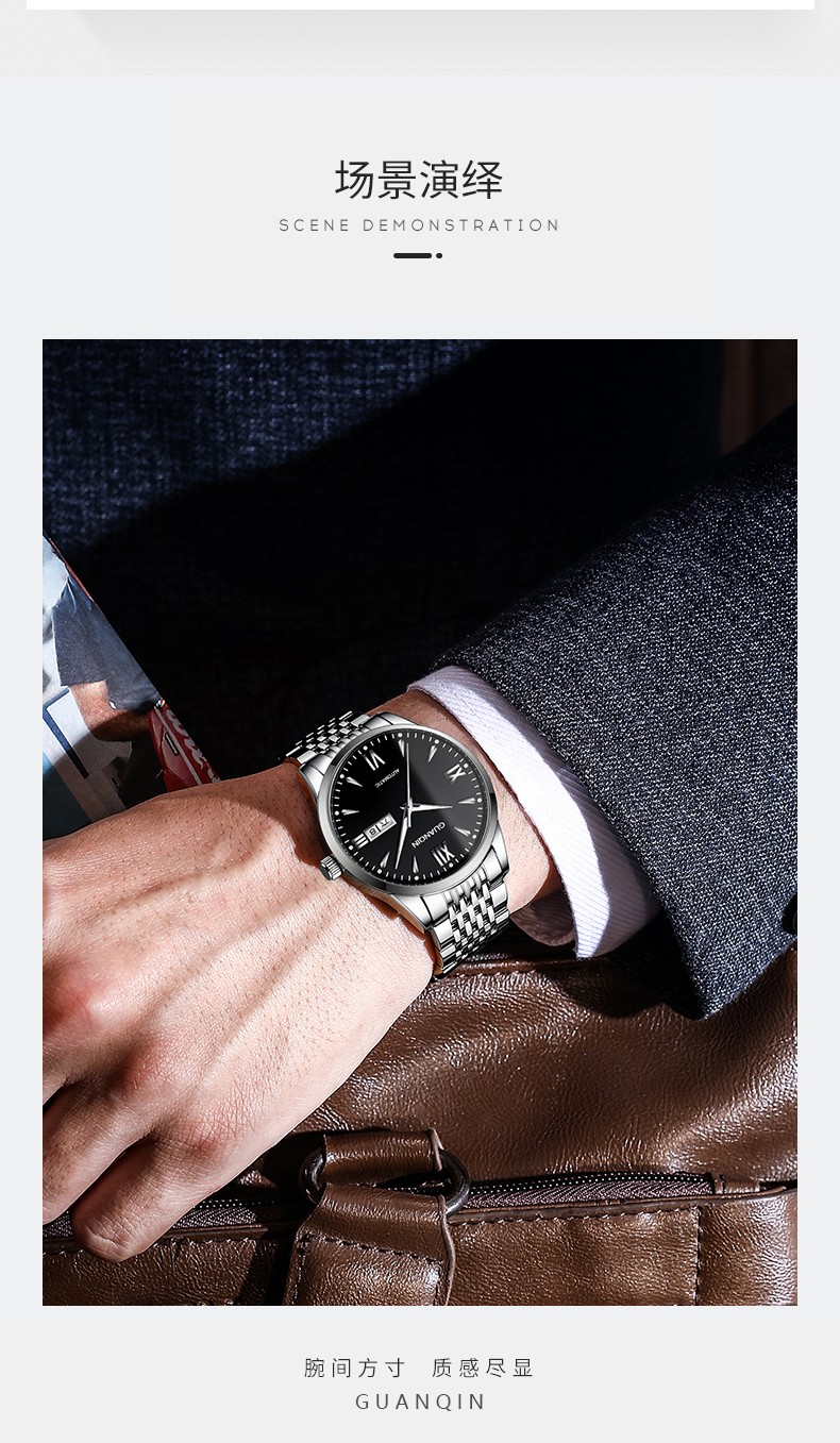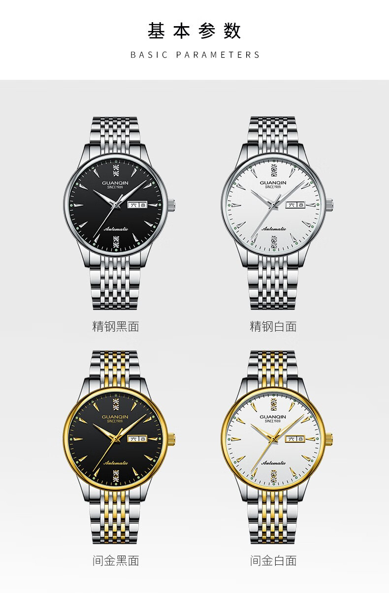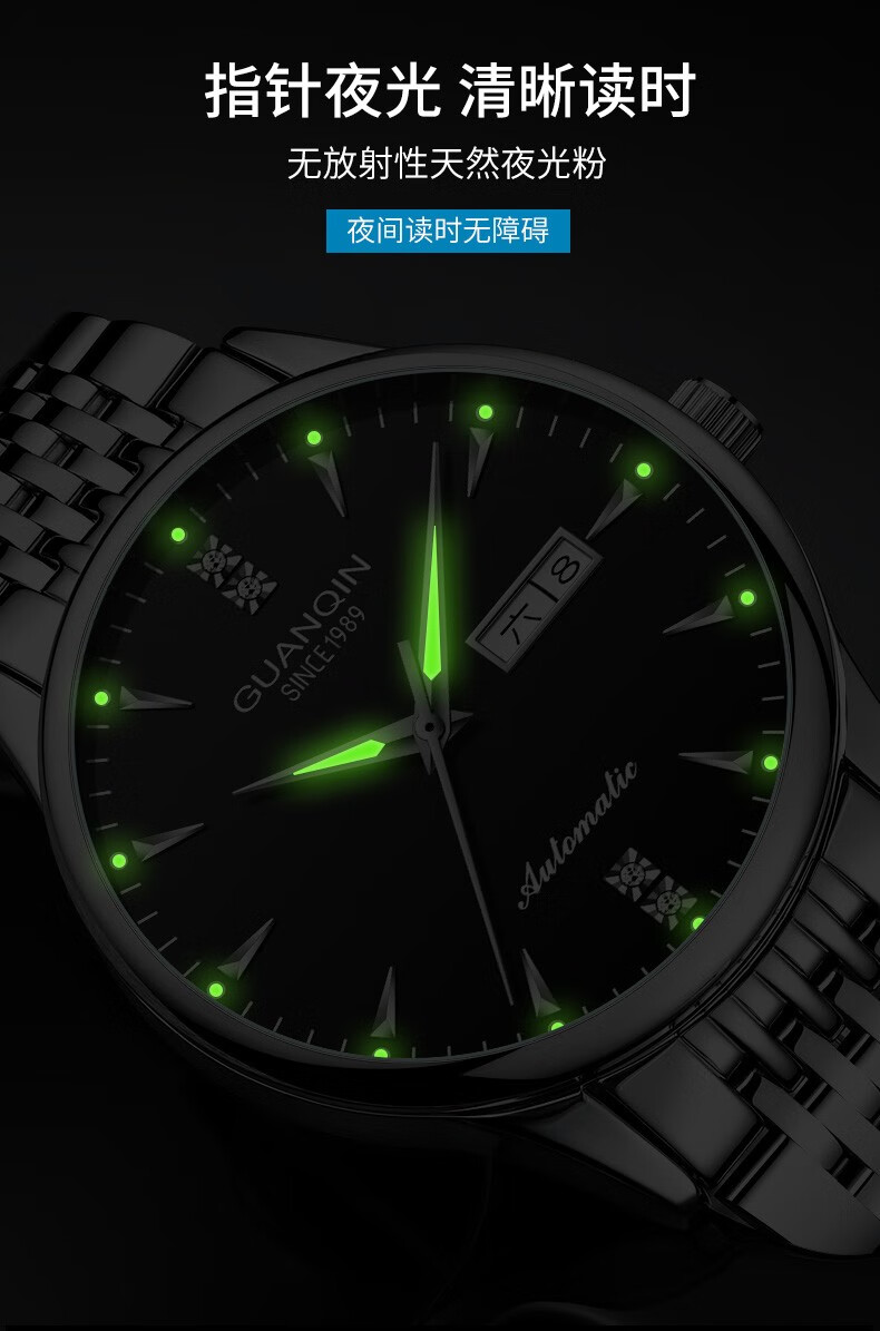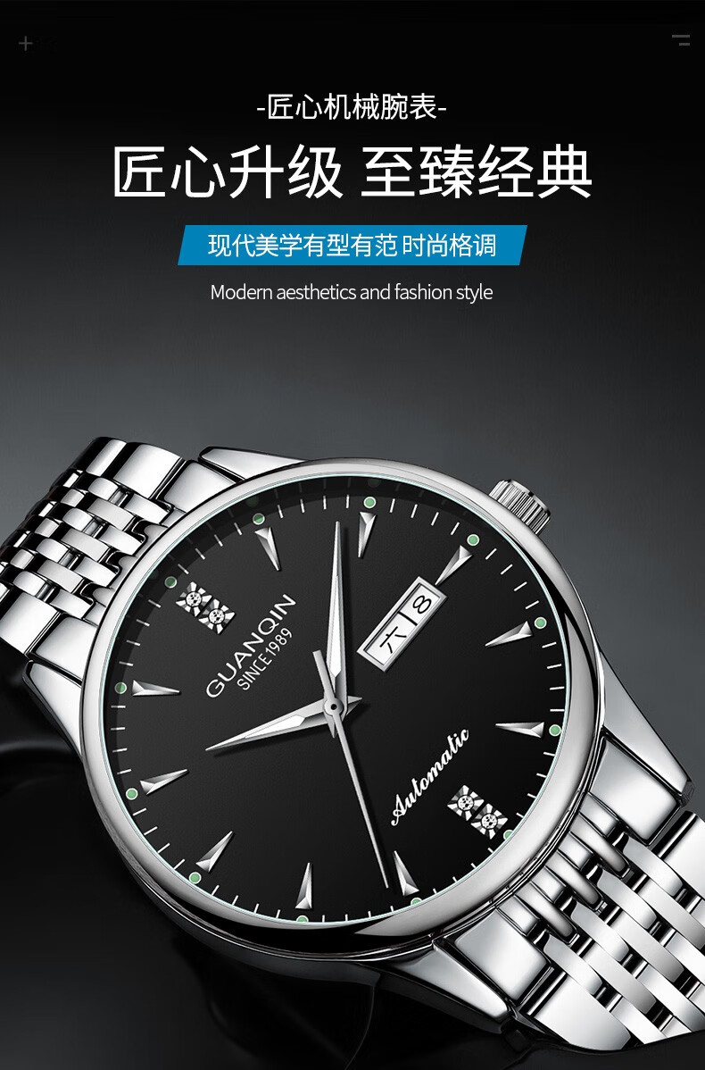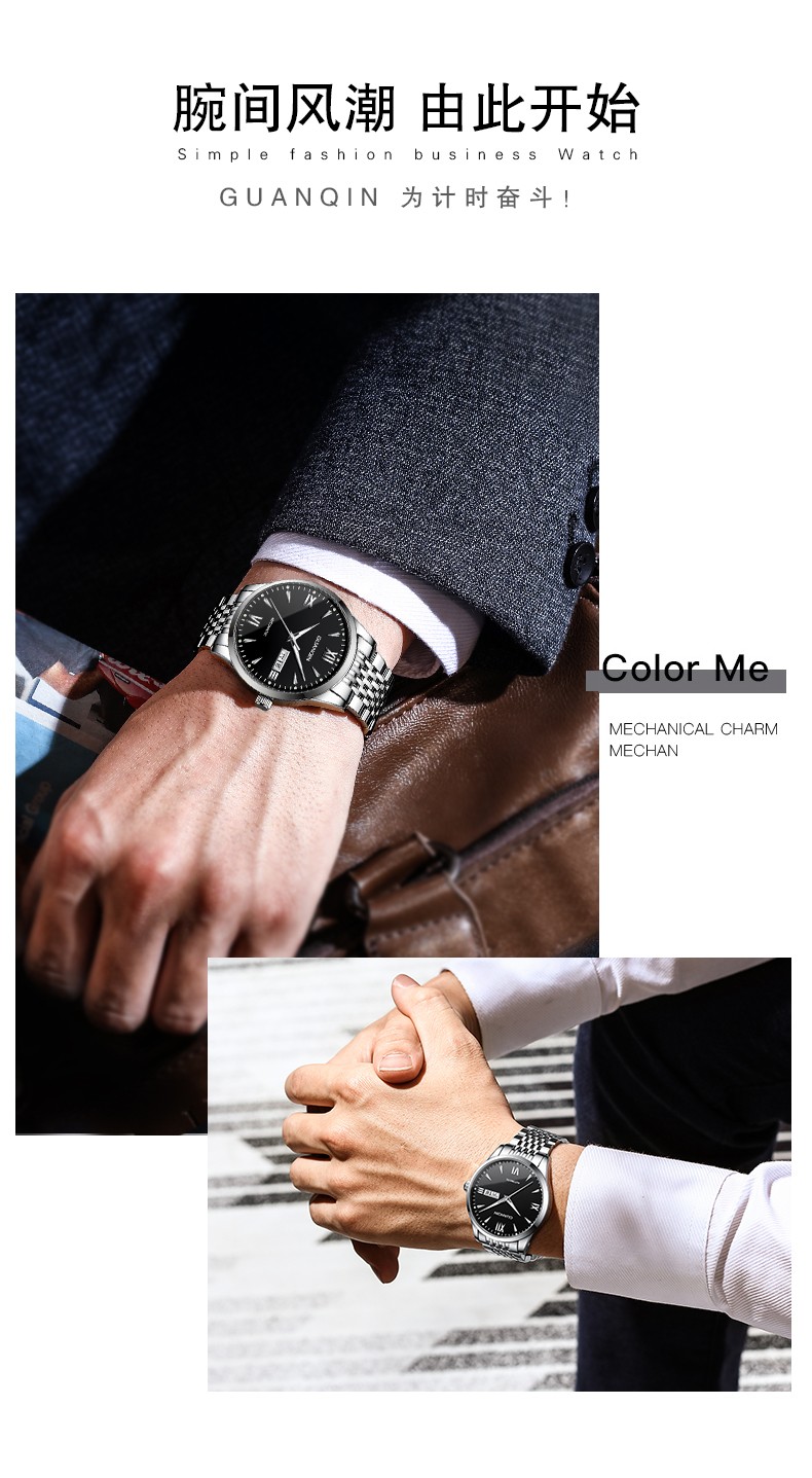 冠琴(GUANQIN) 名表 新款手表男士全自动机械商务休闲防水夜光男表精钢时尚简约 冠琴 16221间金白面 免费刻字
