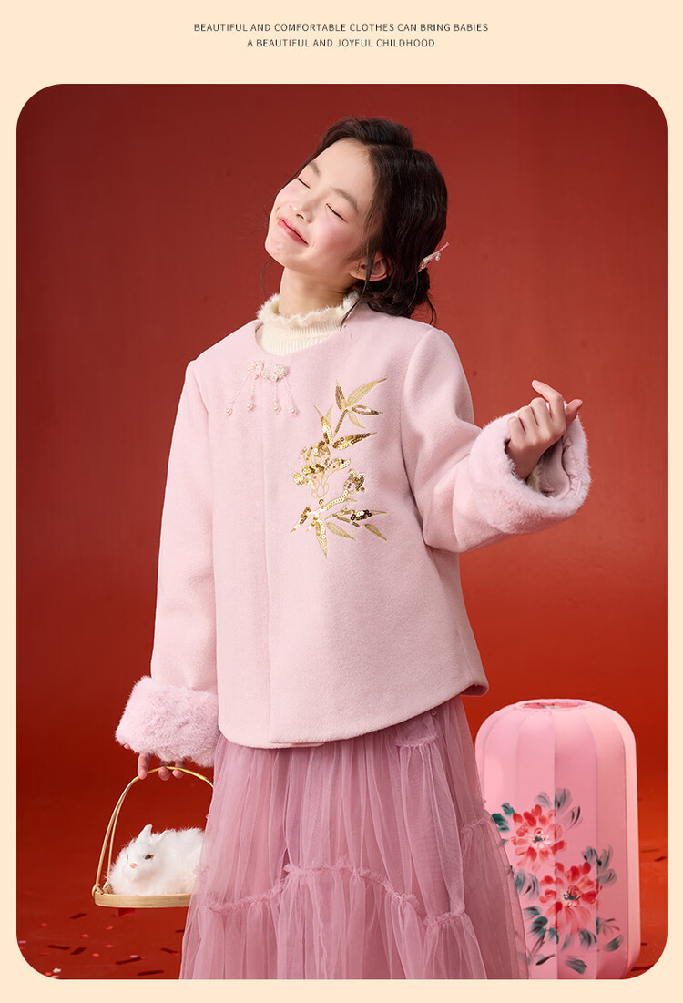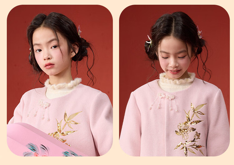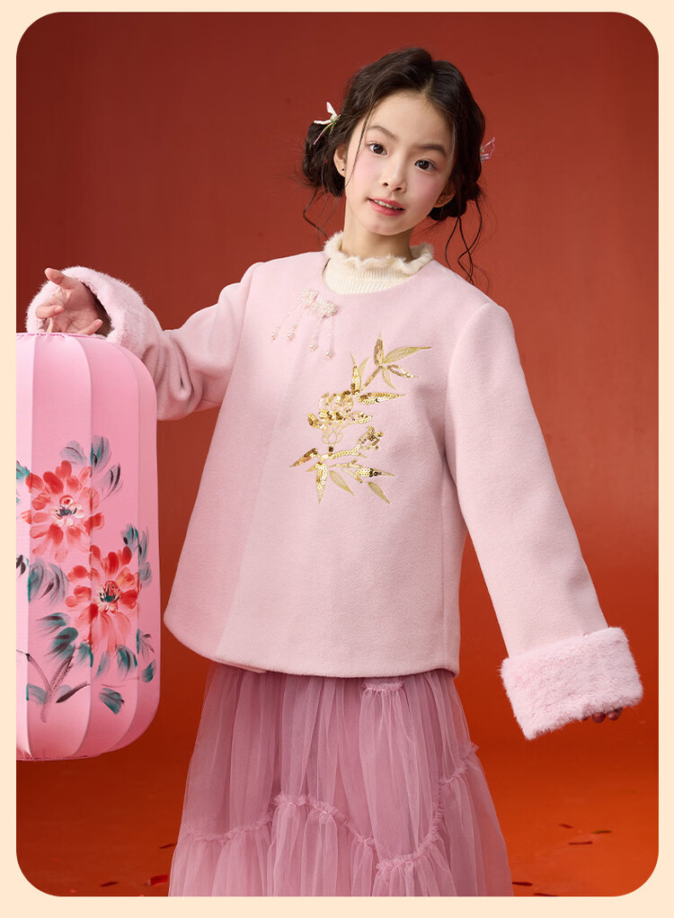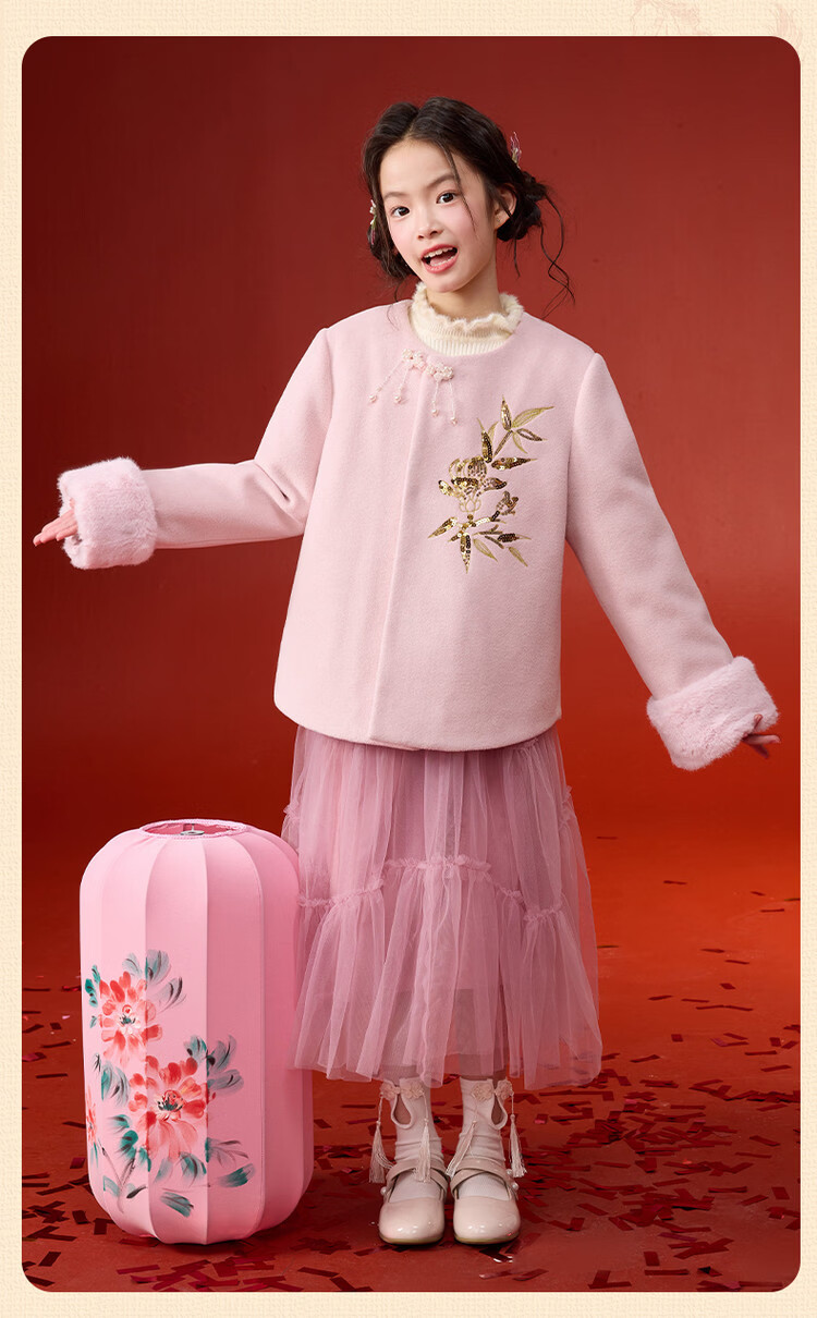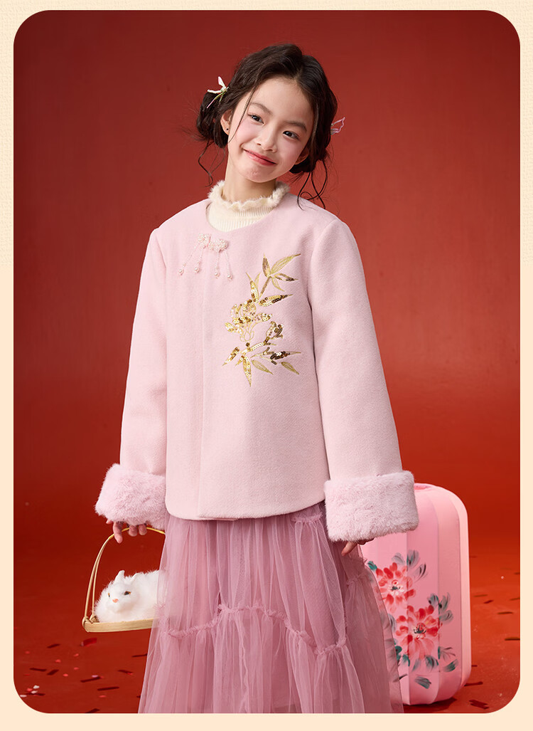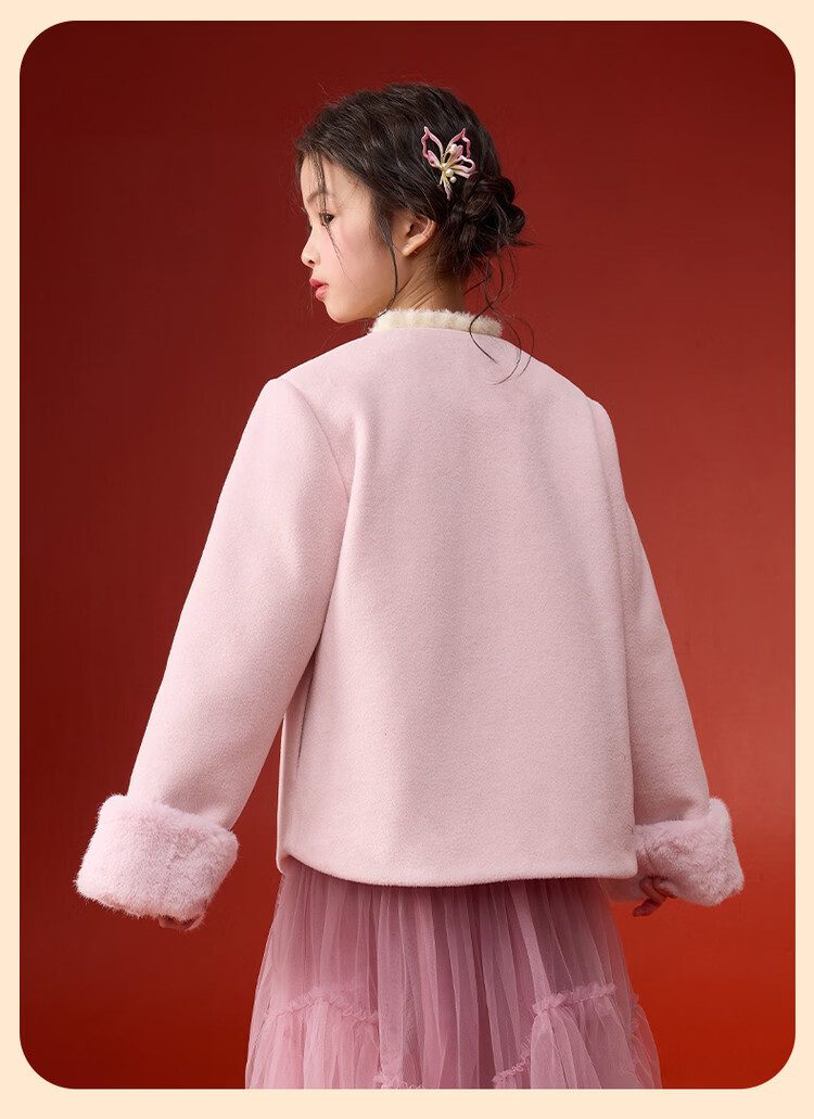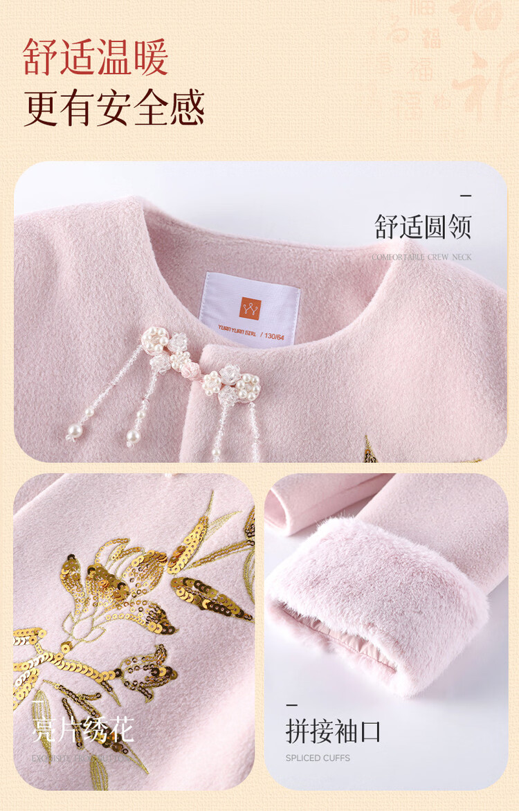媛媛公主【国风拜年服】儿童呢大衣外套秋冬款女童洋气夹棉加厚保暖棉服 浅粉色 110