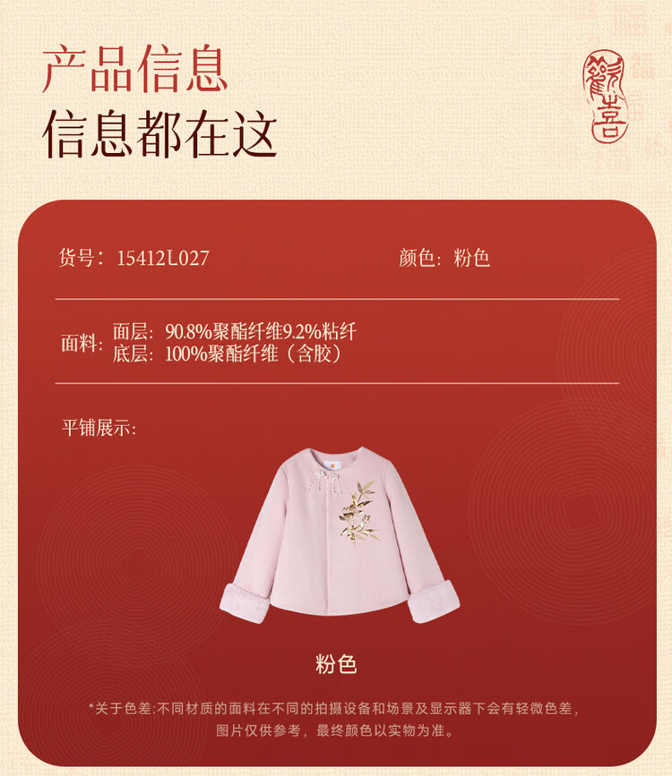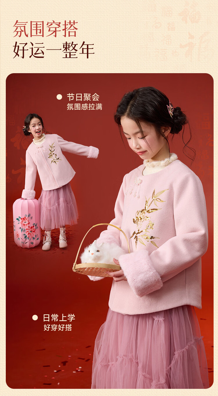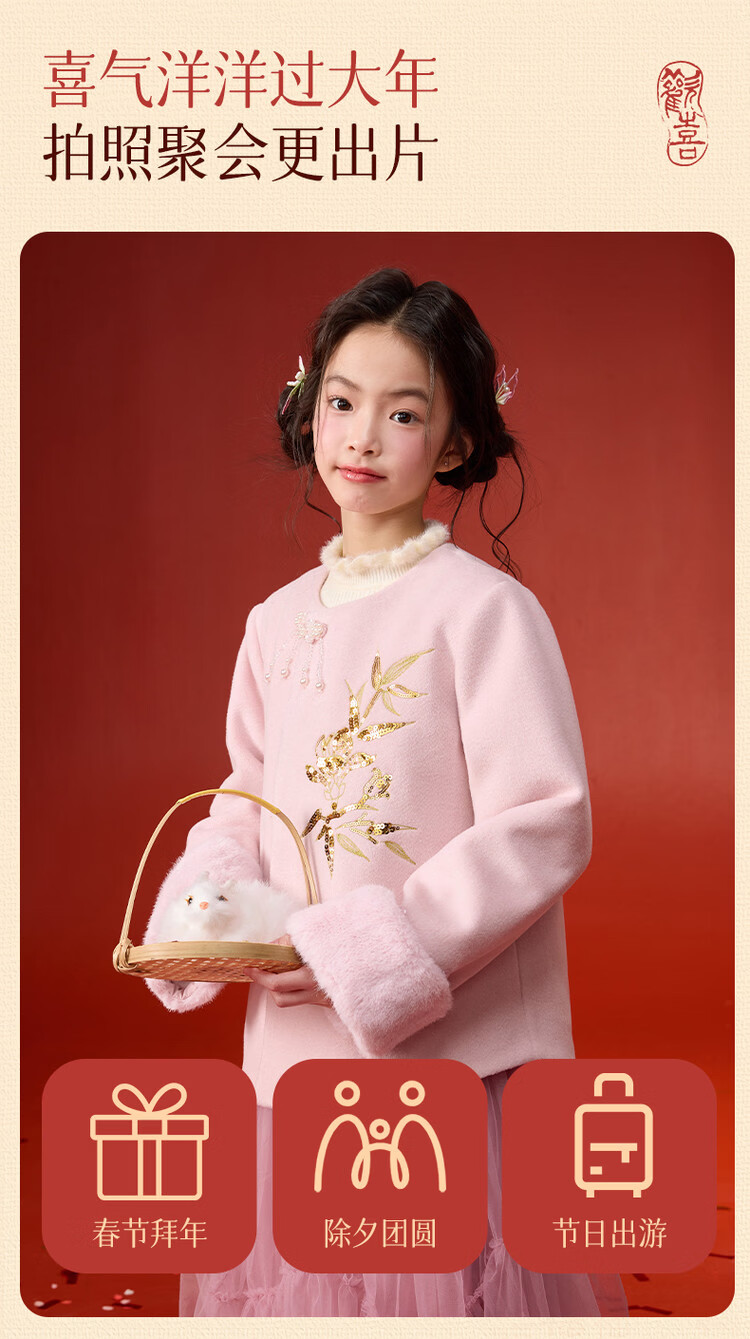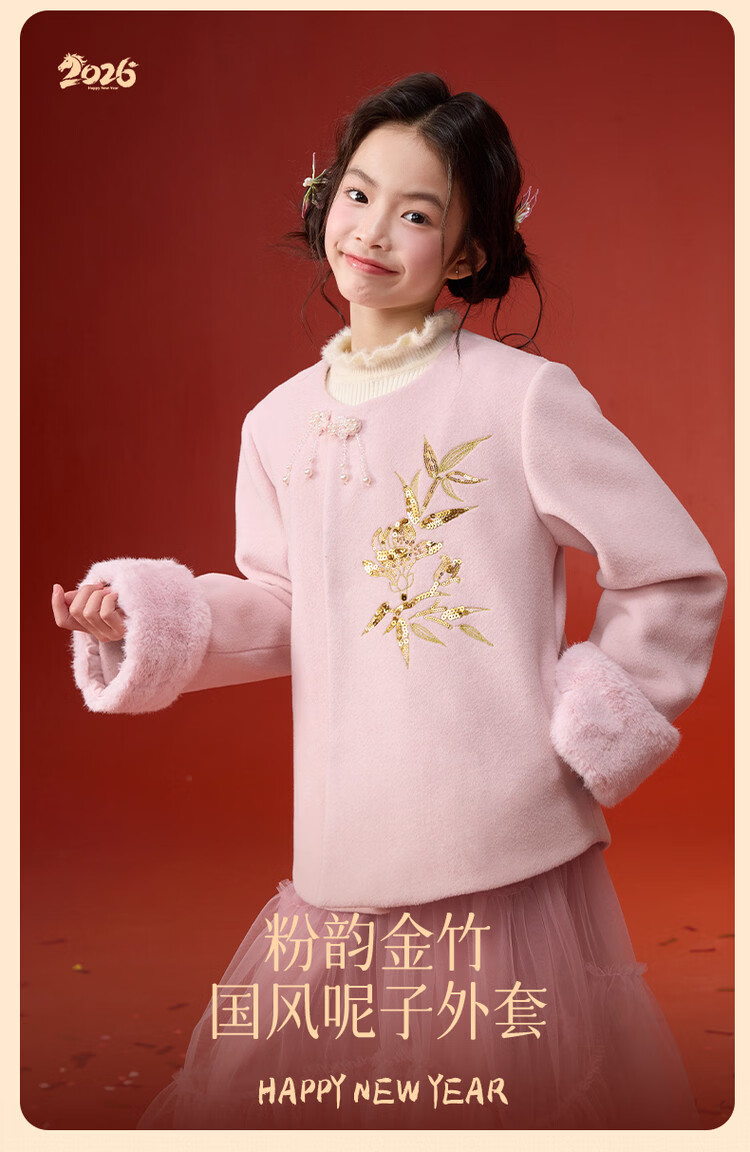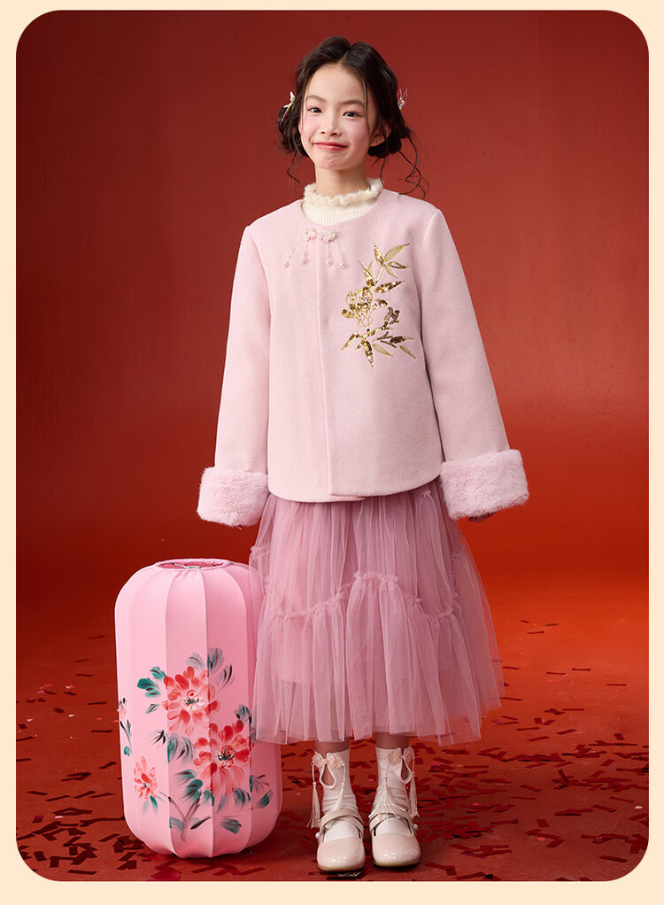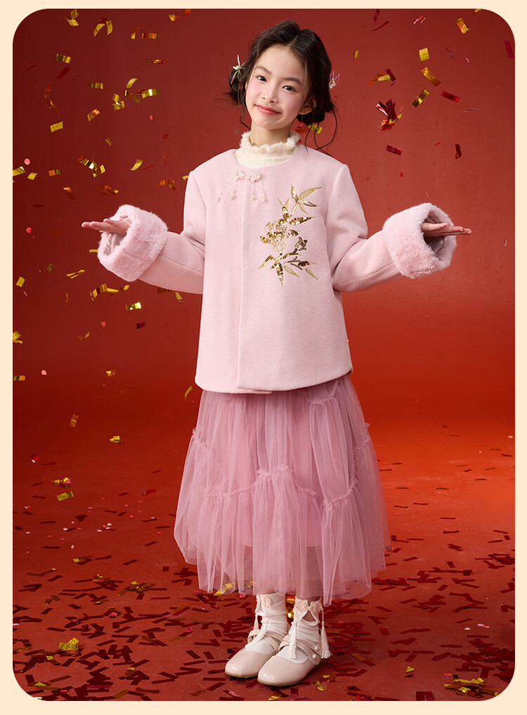 媛媛公主【国风拜年服】儿童呢大衣外套秋冬款女童洋气夹棉加厚保暖棉服 浅粉色 110