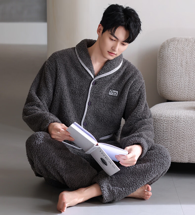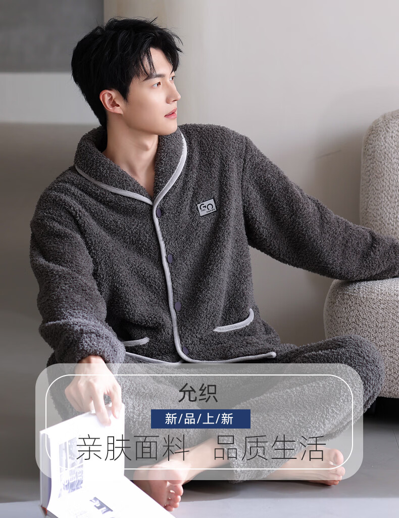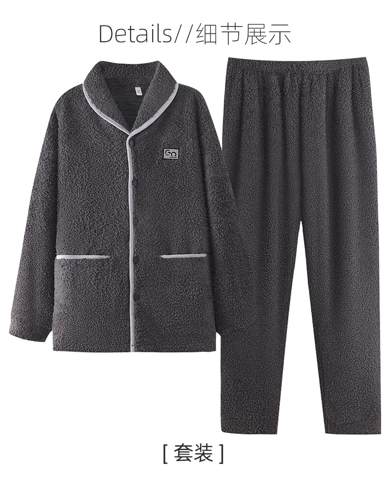 允织半边绒睡衣男士冬季加厚加绒秋冬款开衫高级感冬天家居服保暖套装 9060-深灰 M (165) :建议100-120斤穿着