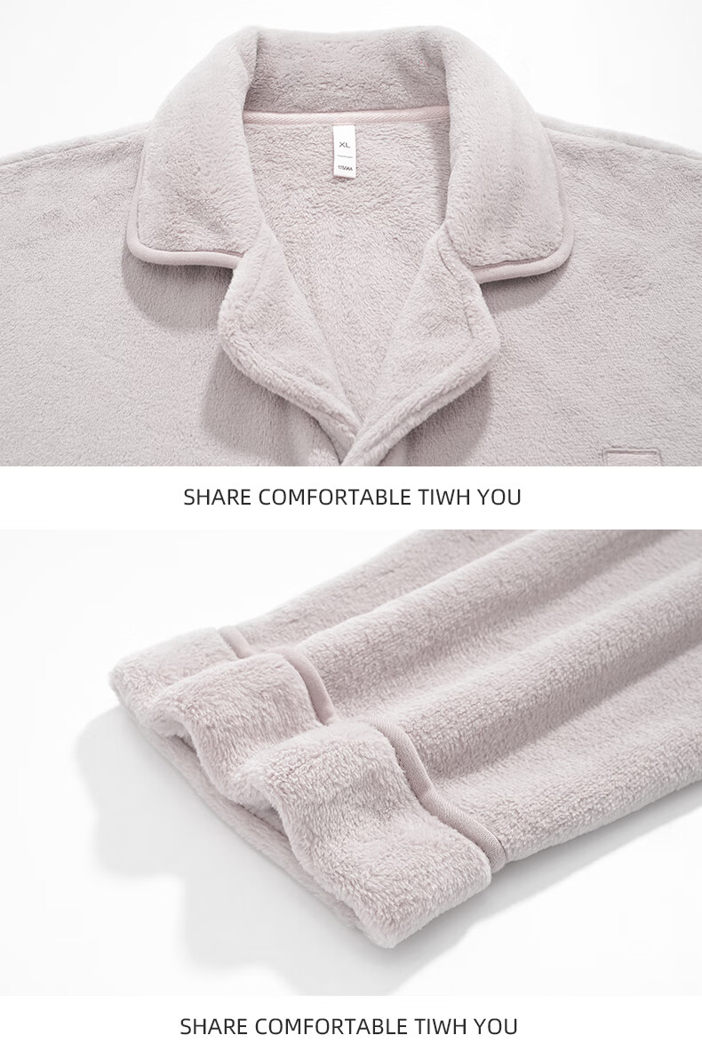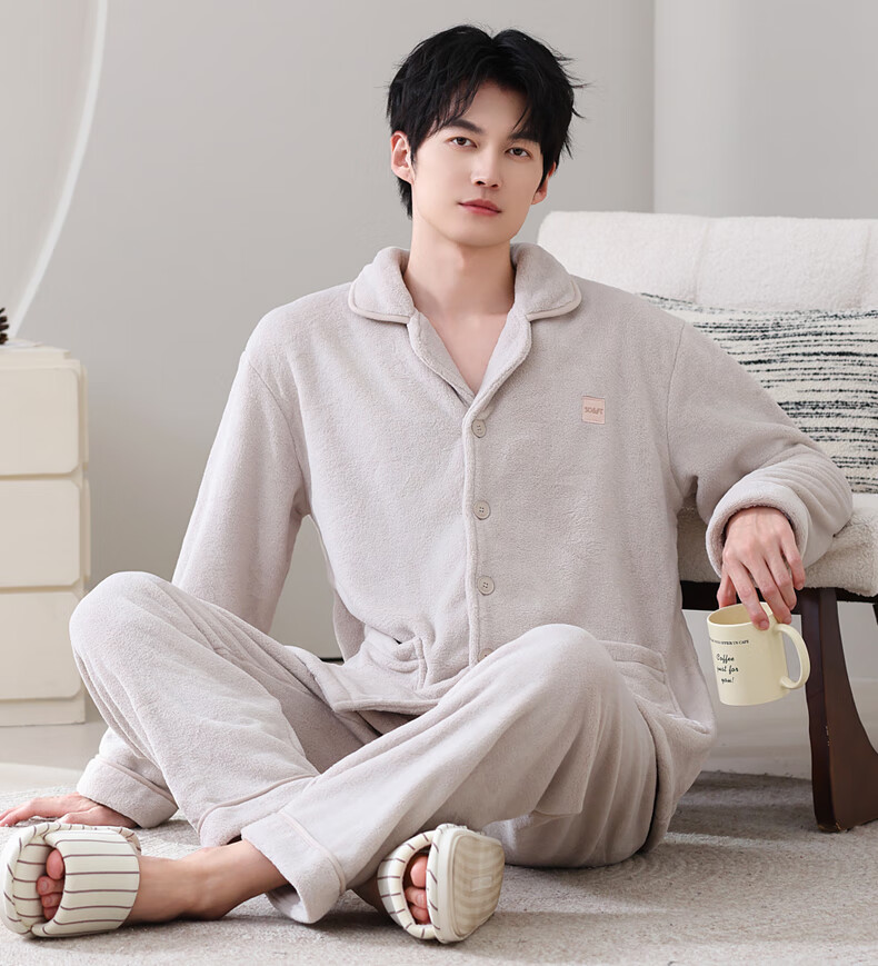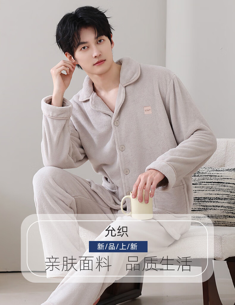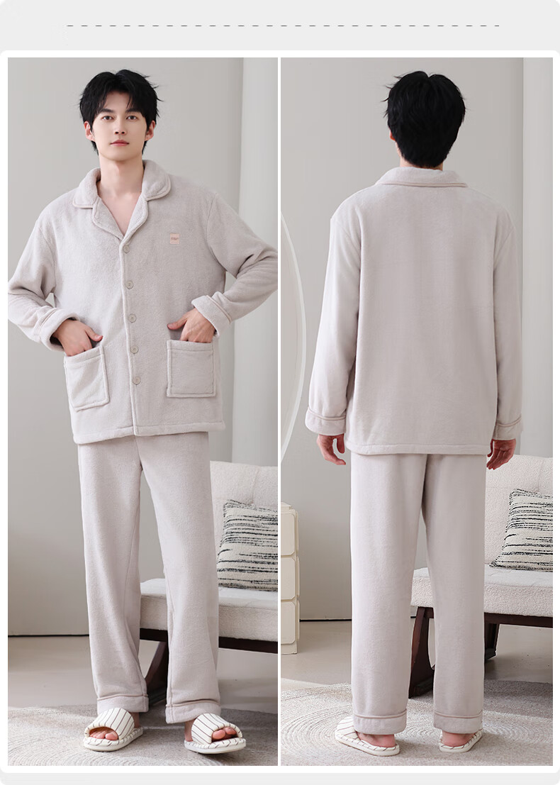 允织法兰绒睡衣男士冬季秋冬款加绒加厚保暖珊瑚绒男款家居服大码套装 5903-灰杏 L (170) :建议100-135斤穿着