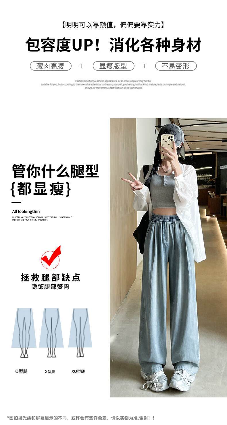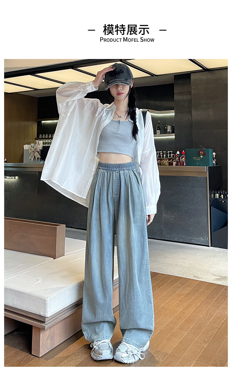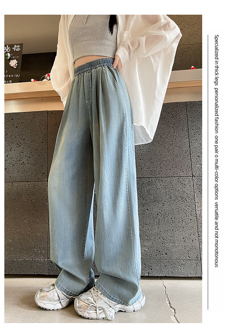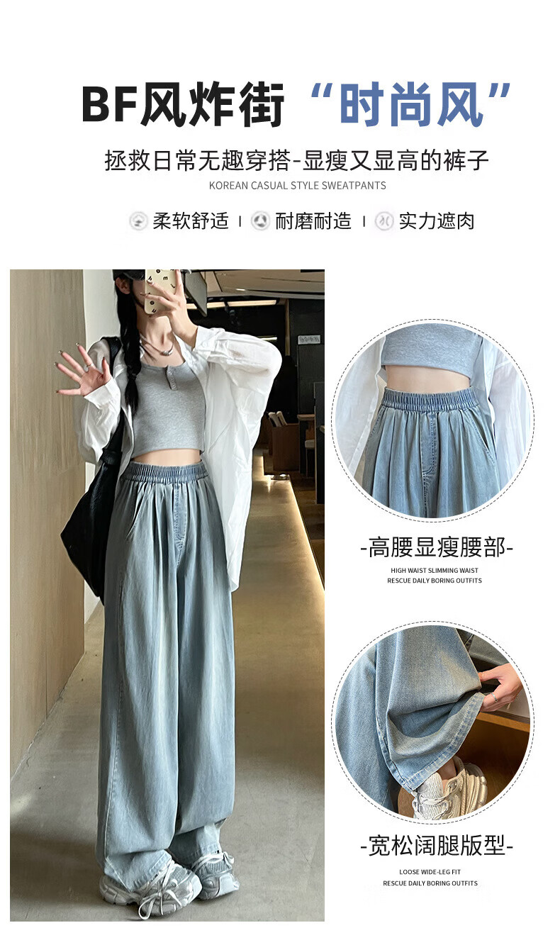 浪莎天丝牛仔裤女夏季薄款2026新款显瘦直筒宽松垂感冰丝松紧腰阔腿裤 蓝色 S 【适合80-105斤】