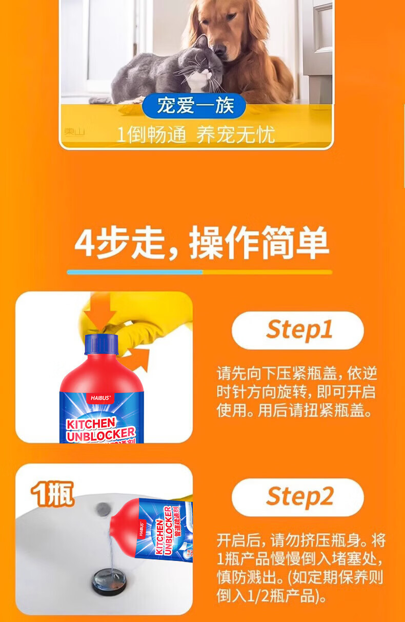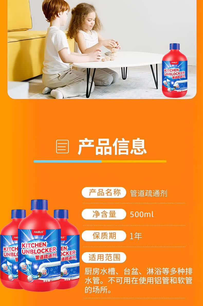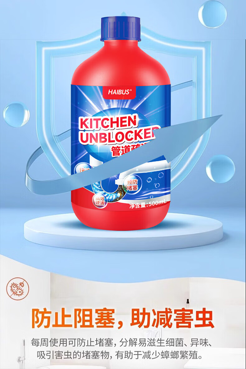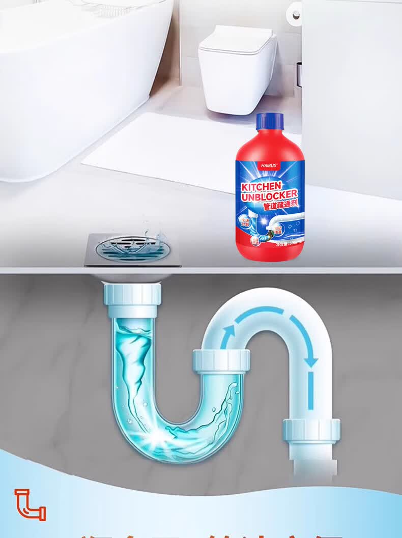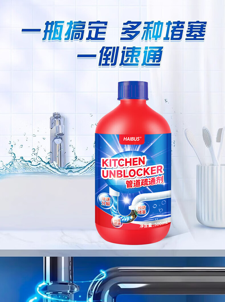 海布森(HAIBUS)下水管道疏通剂强力油脂溶解通清理厨房卫生间马桶重油污堵塞神器 500ml 5瓶装【超值囤货装】