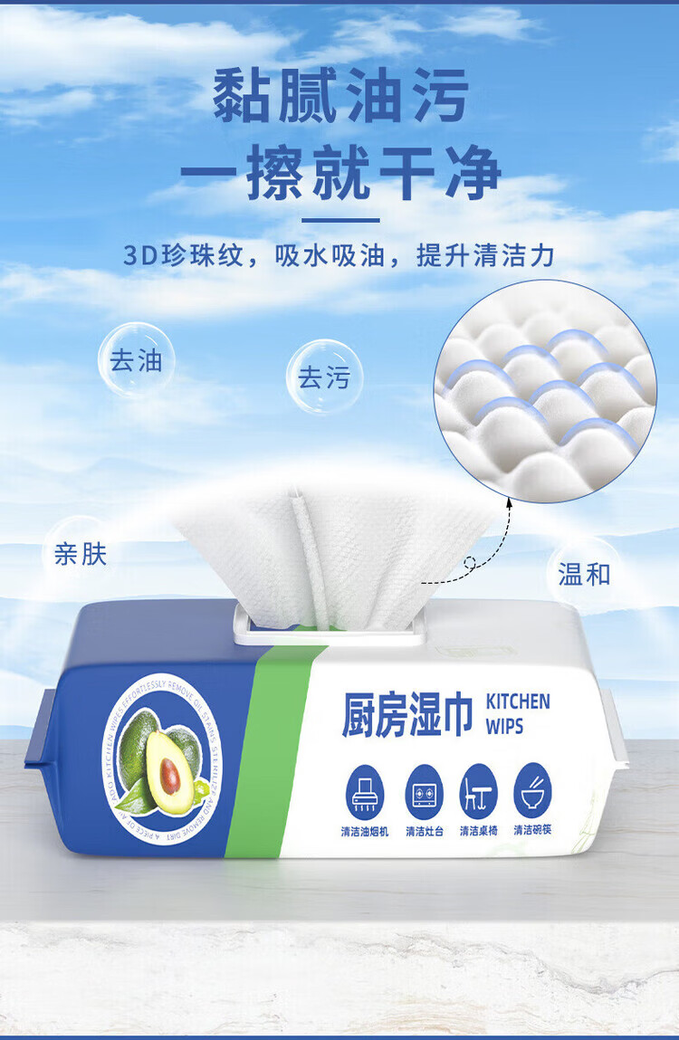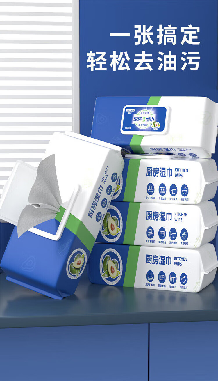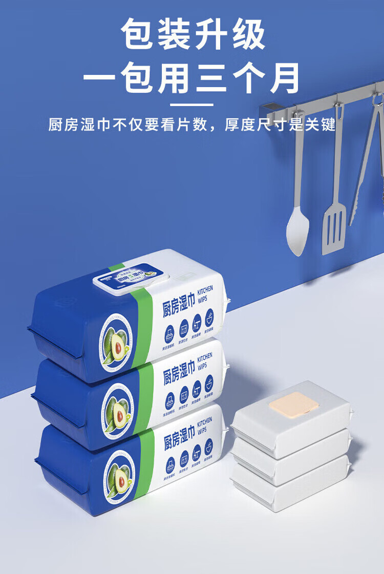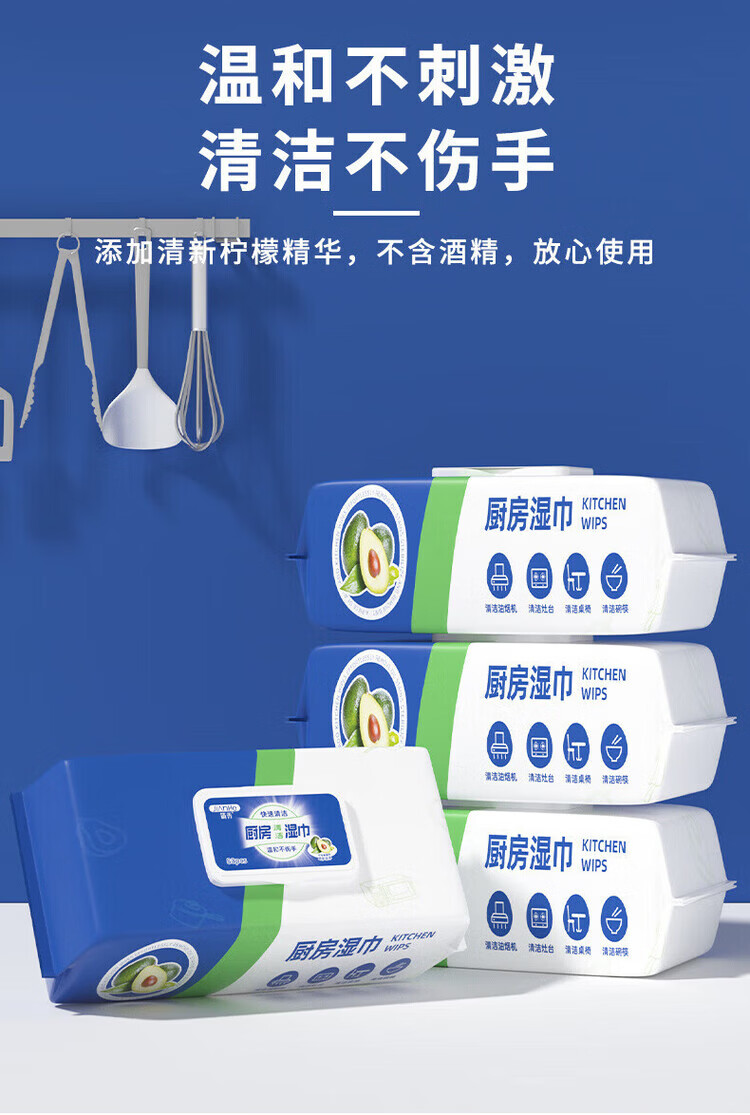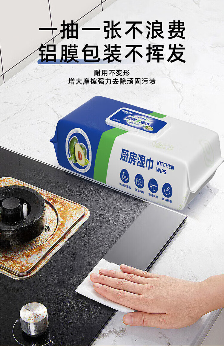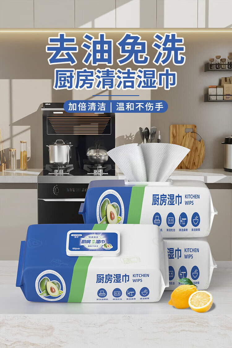 洋臣厨房清洁湿纸巾一次性去油污抹布加大加厚可水洗懒人抹布80抽 3大包【牛油果+去油+去污】