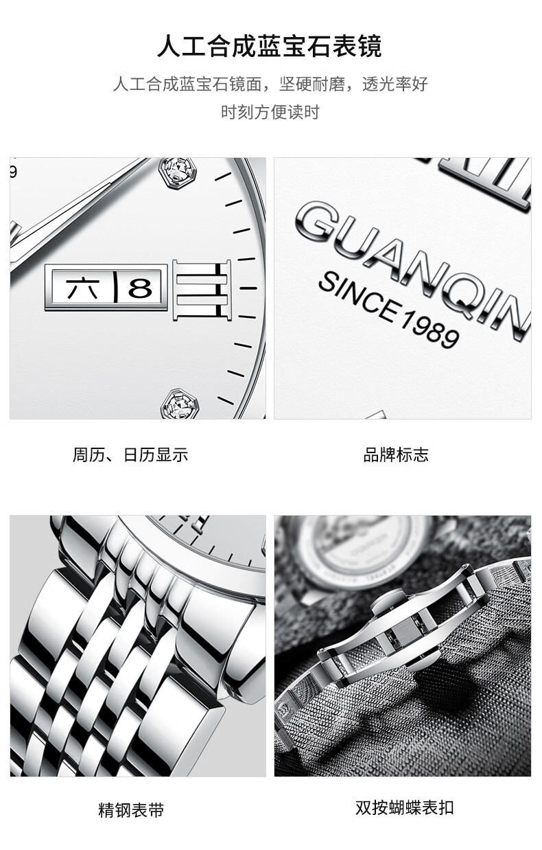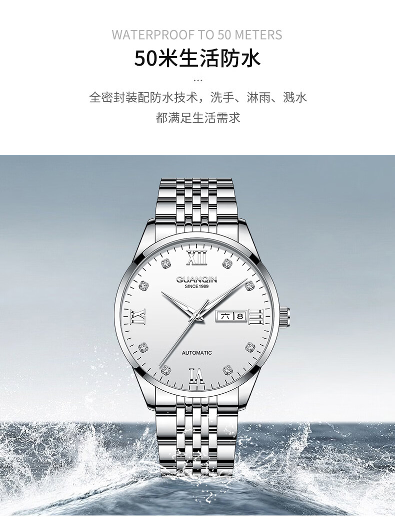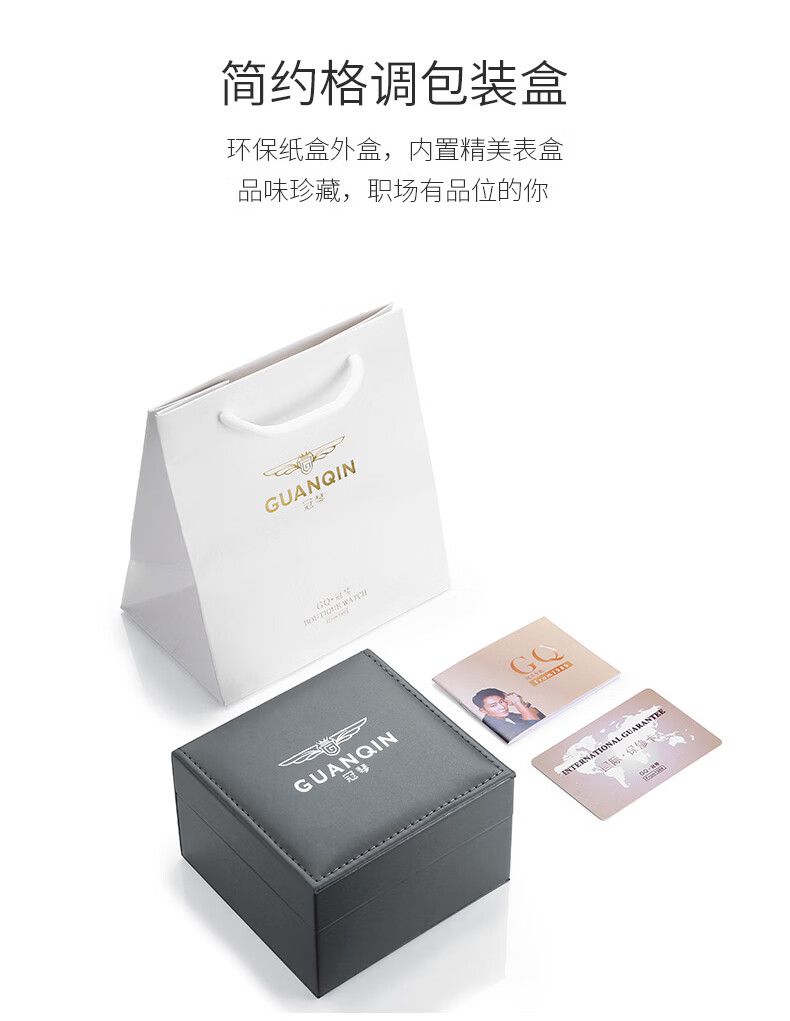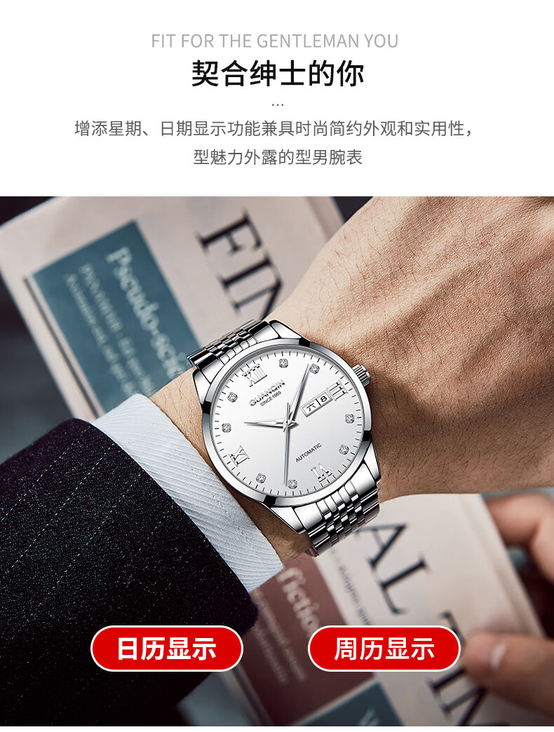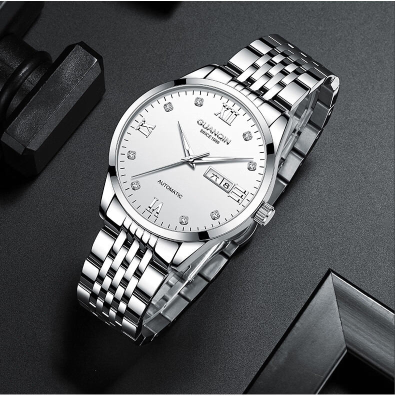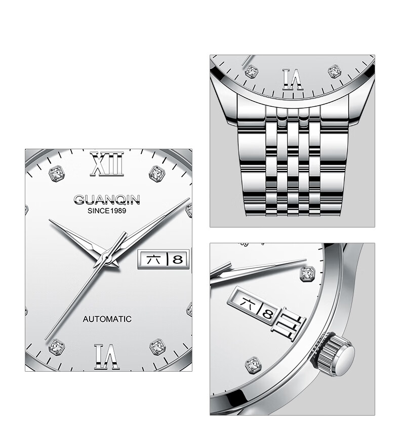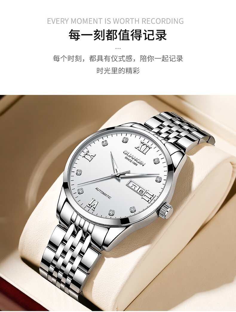 冠琴(GUANQIN)瑞士认证手表男款全自动机械表高档商务男表夜光防水休闲男士名表 银壳白面-瑞士认证-终生质保-礼盒包装