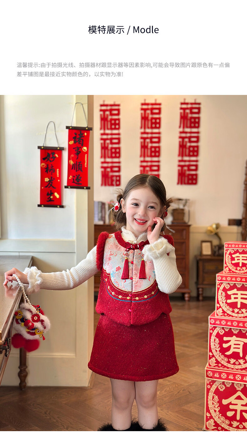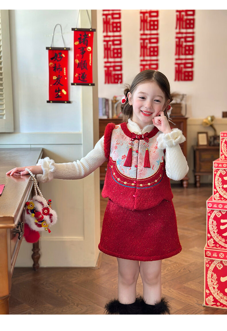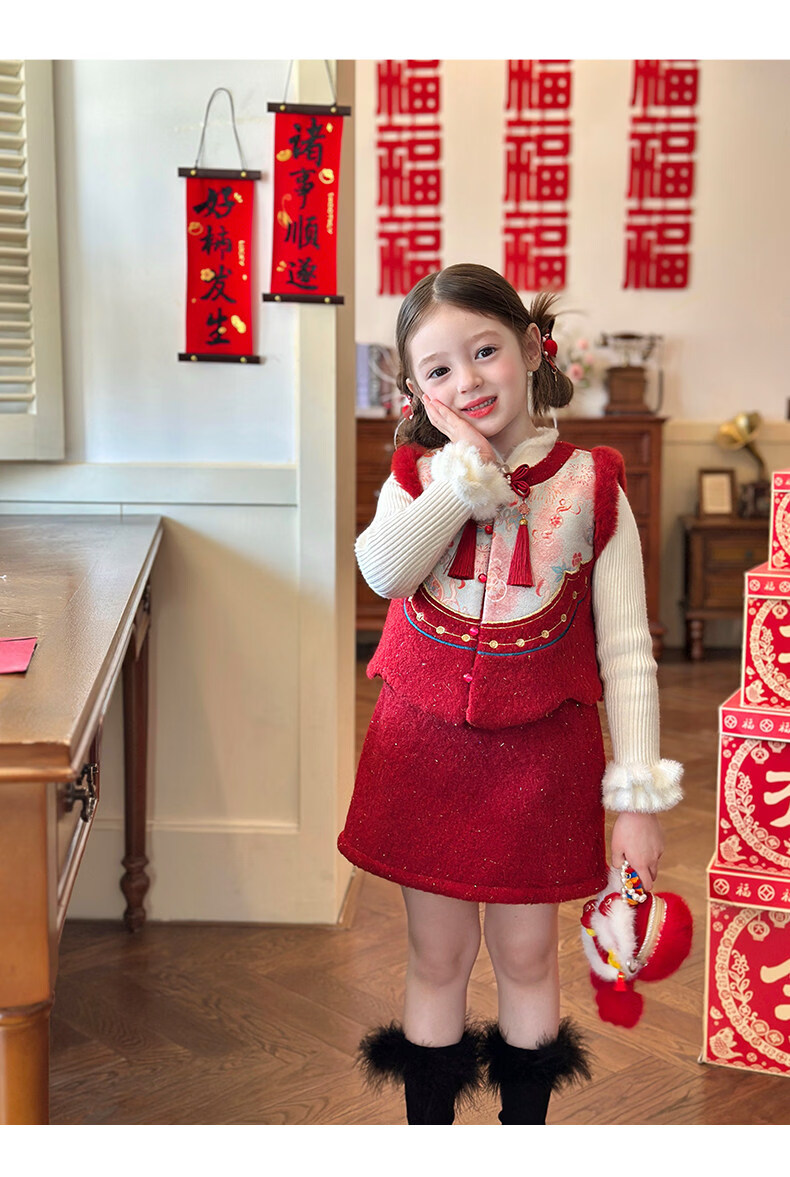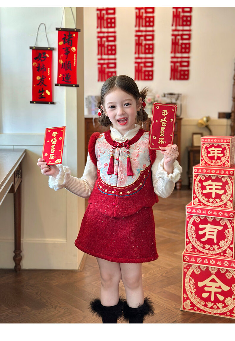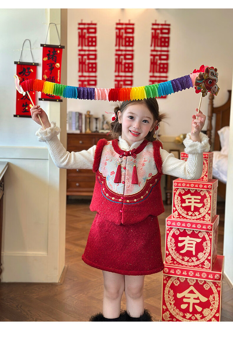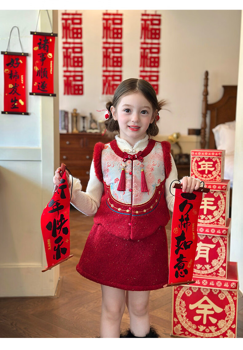 栀了成长记童装女童红色国风套装2025冬季儿童新年夹棉马甲两件套 红色 套装 100 cm