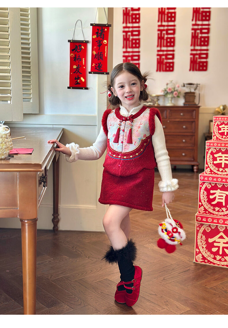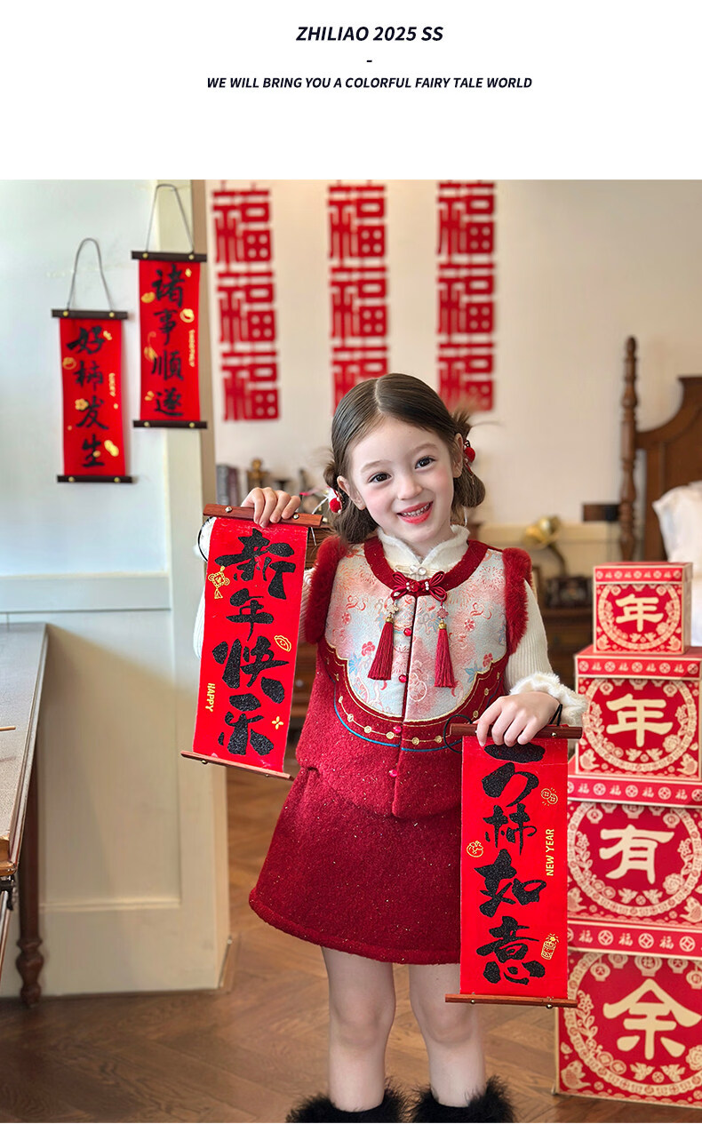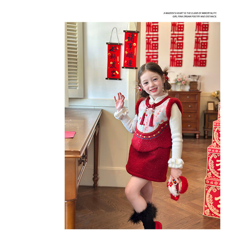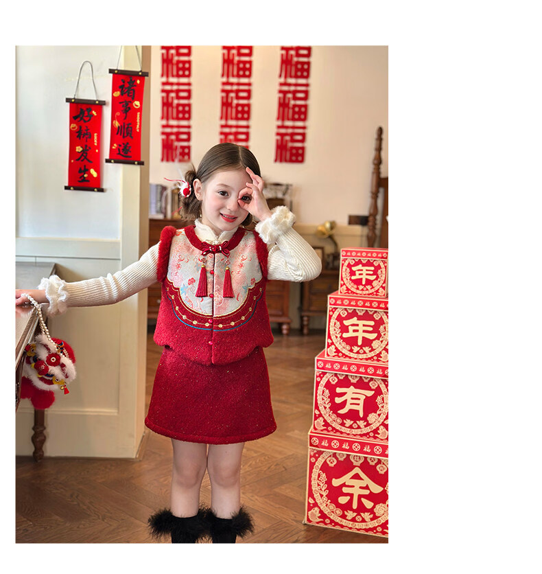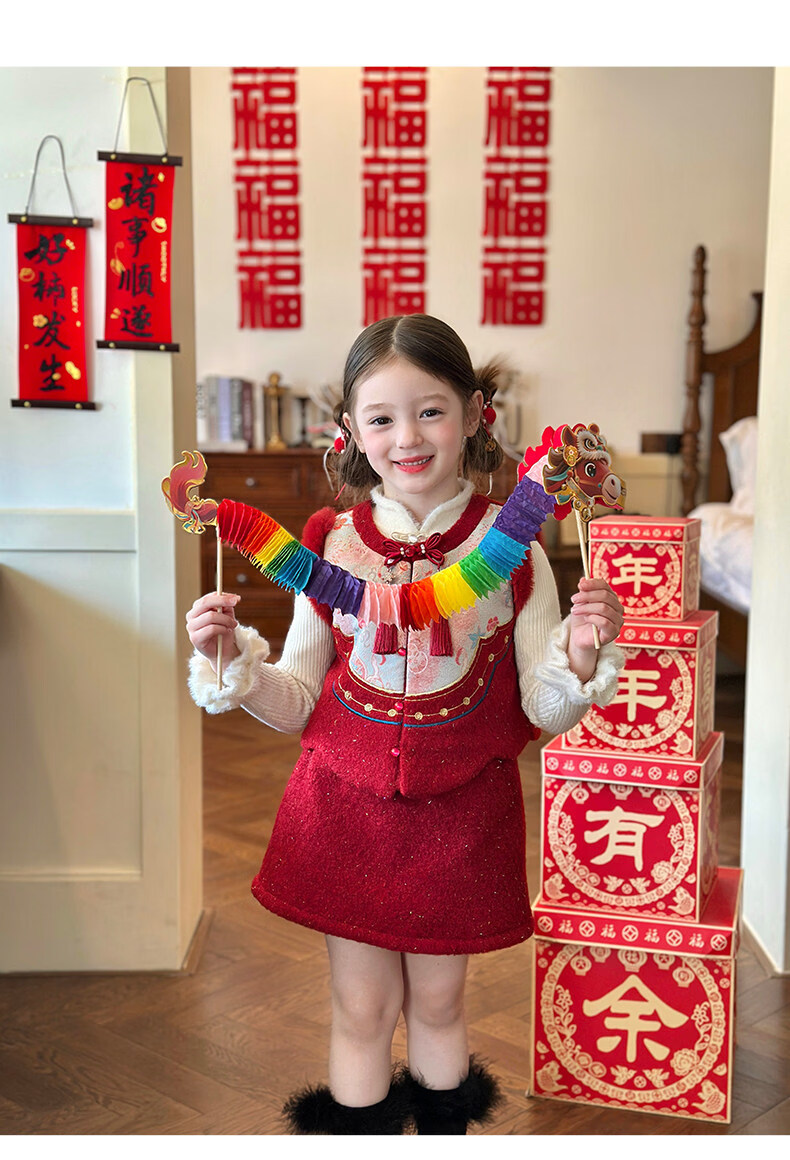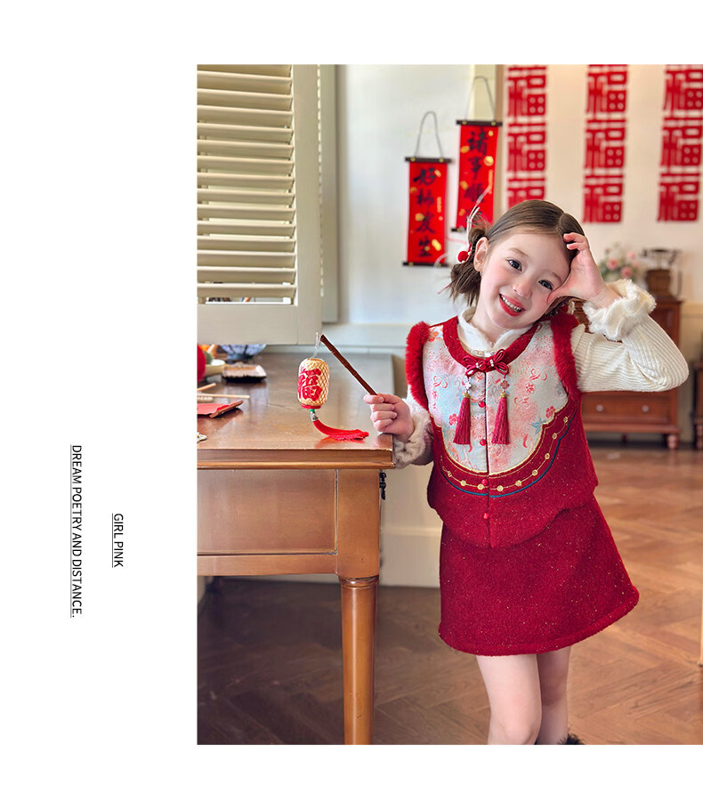 栀了成长记童装女童红色国风套装2025冬季儿童新年夹棉马甲两件套 红色 套装 100 cm